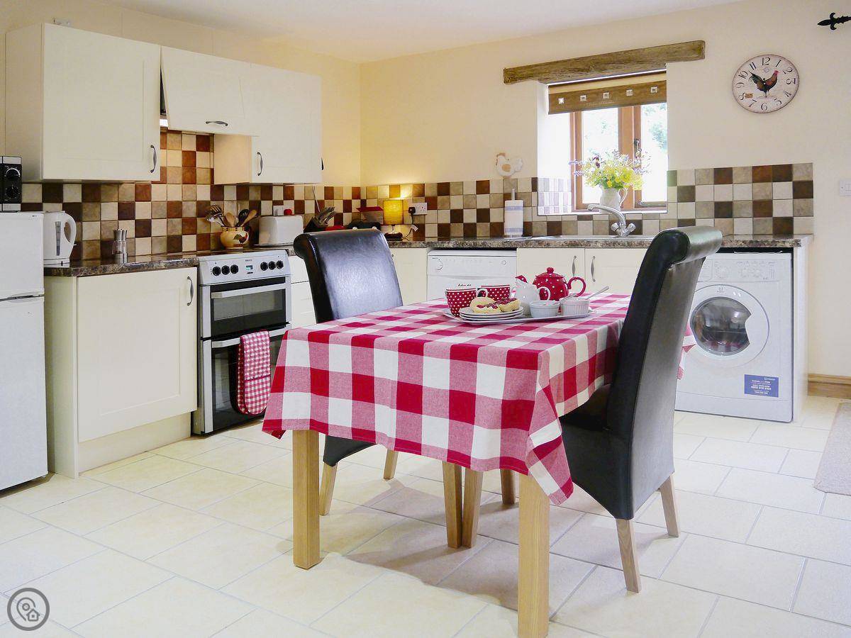 Inside, it's got what you'd expect: a washing machine, dishwasher, TV, WiFi. Bedding and towels are included. There's a cot and a highchair if you need them. Parking is right outside.