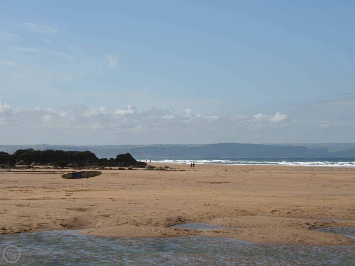 Hartland Quay and Hartland Point are dramatic spots on the coast. Clovelly is a famous fishing village, about a fifteen minute drive. It's steep and cobbled. Bucks Mills is similar and quieter. For a big beach with surfing, you'd drive to Westward Ho! or Bude. That's about half an hour.