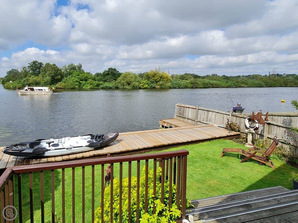 Heron's View is in Brundall, right on the river Yare. It's a detached timber cabin, so you're on your own. The main thing is the river frontage. You've got about 38 feet of private bank, with a mooring if you want to bring a boat. There's a decked veranda to sit out on.