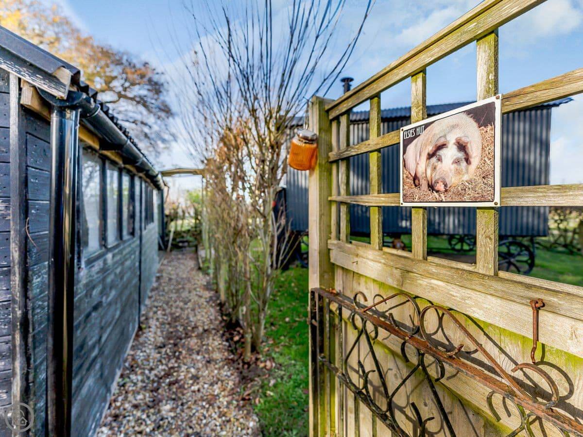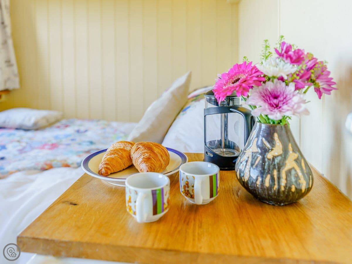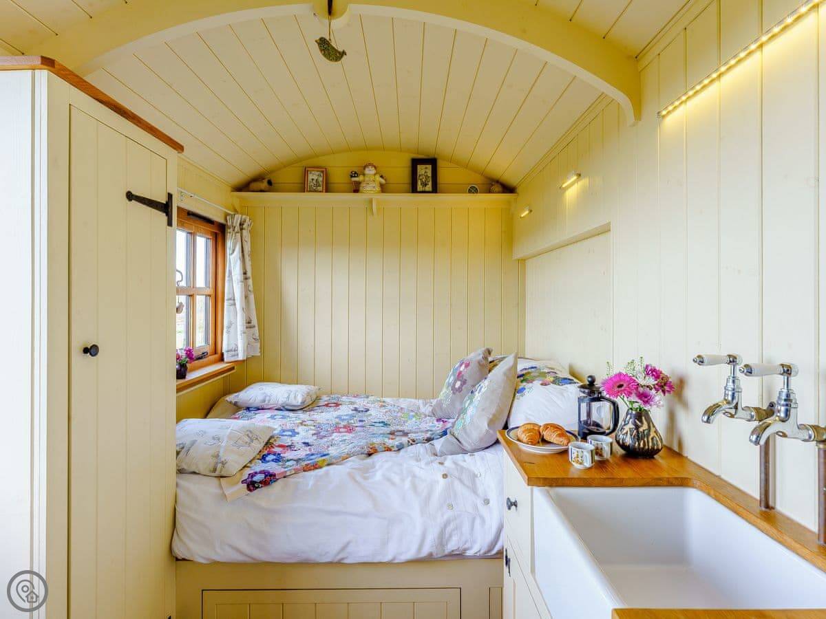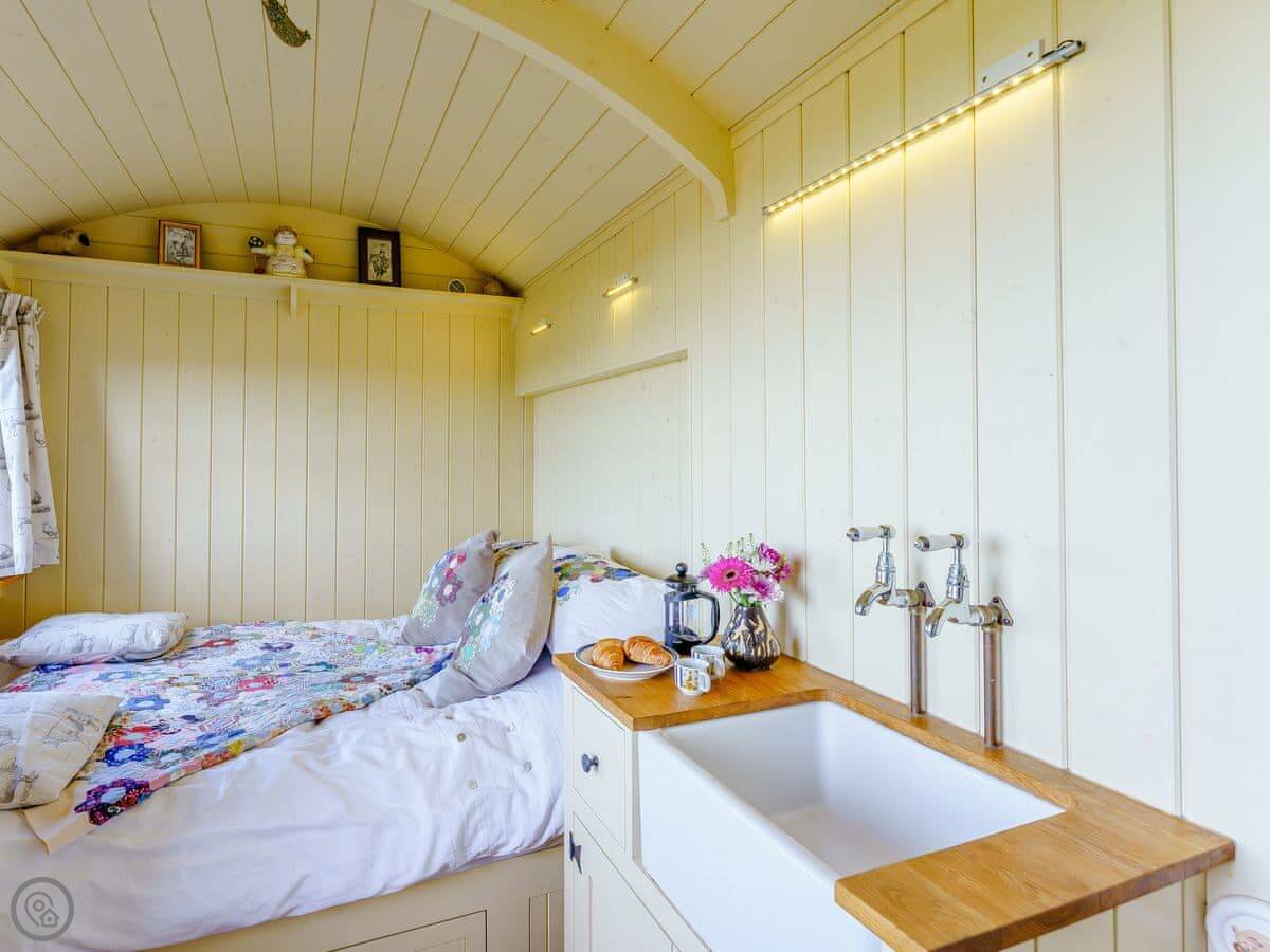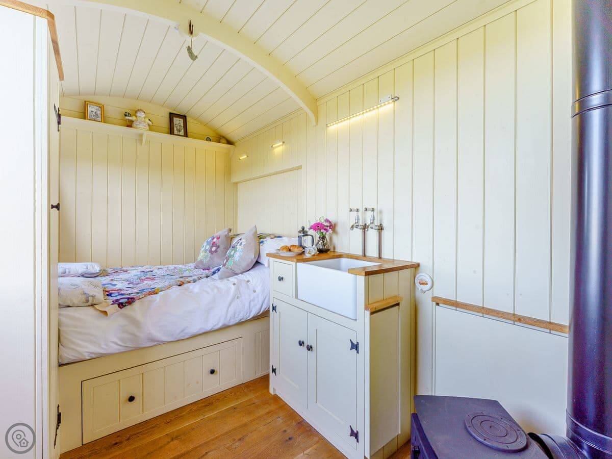 Elsie’s Hut is a traditional style, bespoke Plankbridge shepherd’s hut, made to a very good standard with a very contemporary feel. It is warm and cosy with its solid English oak floor, Farrow Ball painted interior and Hobbit log wood burner. The hut has a spacious shower room with toilet, Belfast sink and storage cupboards, double window and stable door. It is lit by solar power and has two 12V charging points for mobile phone or iPad and Wi-Fi. Outside there is an undercover cooking area with sink, camping stove, barbecue and fire pit and a private garden area with table and chairs for outside dining. All cooking and dining equipment is provided. Sit up on the comfy double bed or stand by the stable door to see views across the fields or watch the sunset. Enjoy the magic of stargazing with a dark sky.