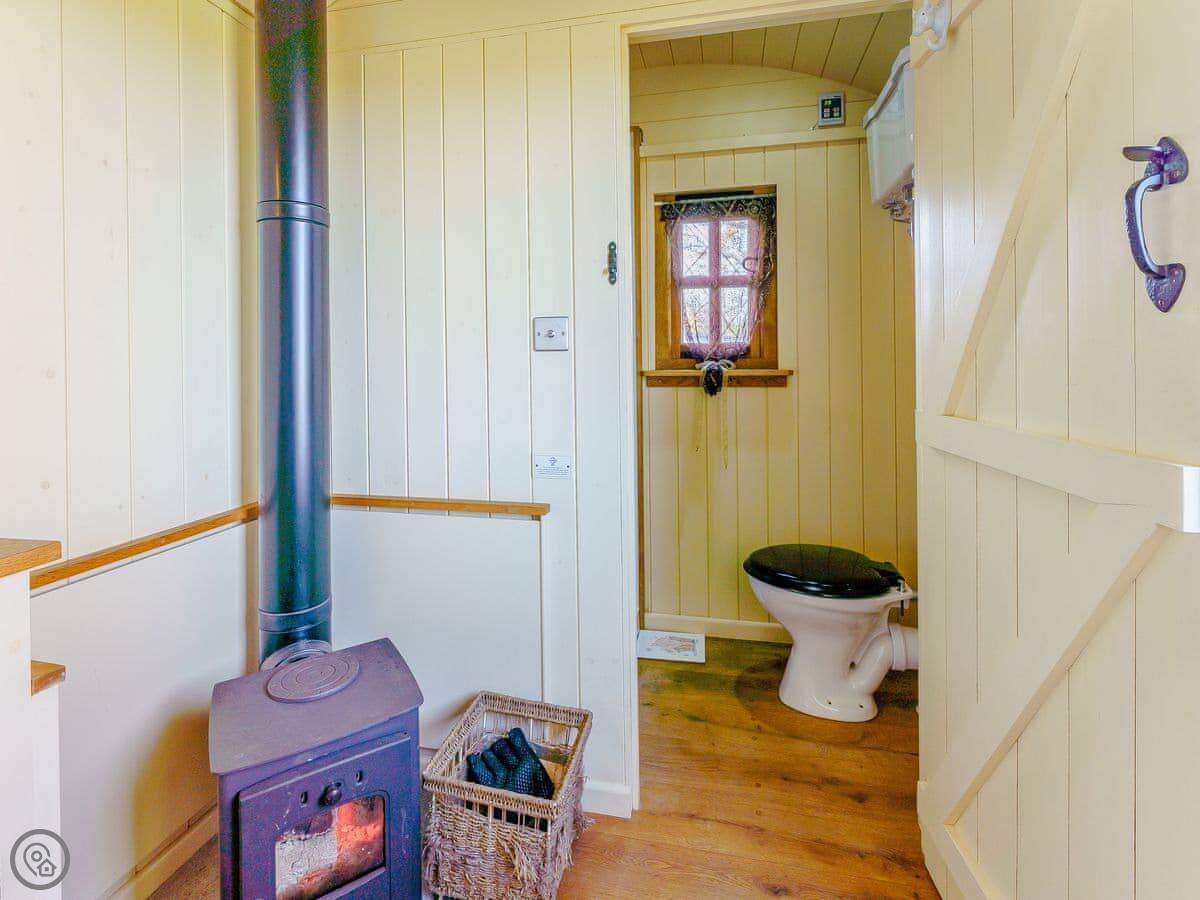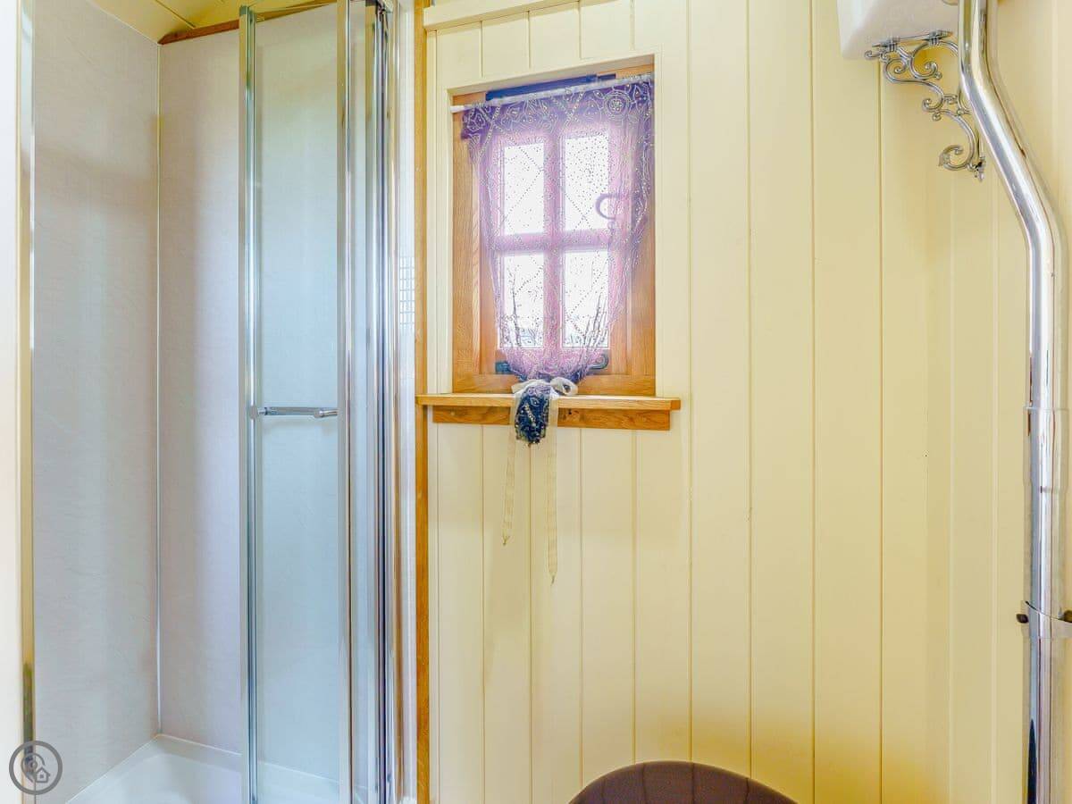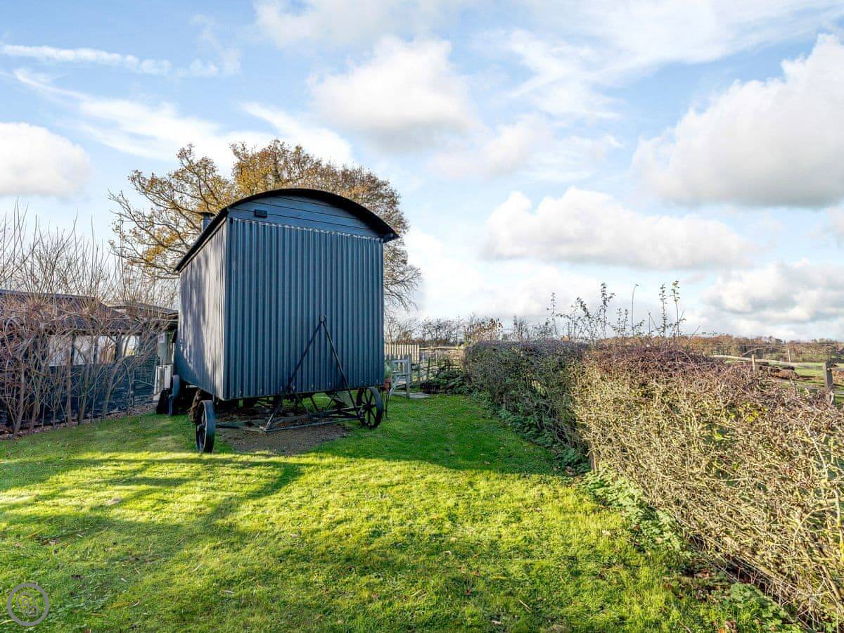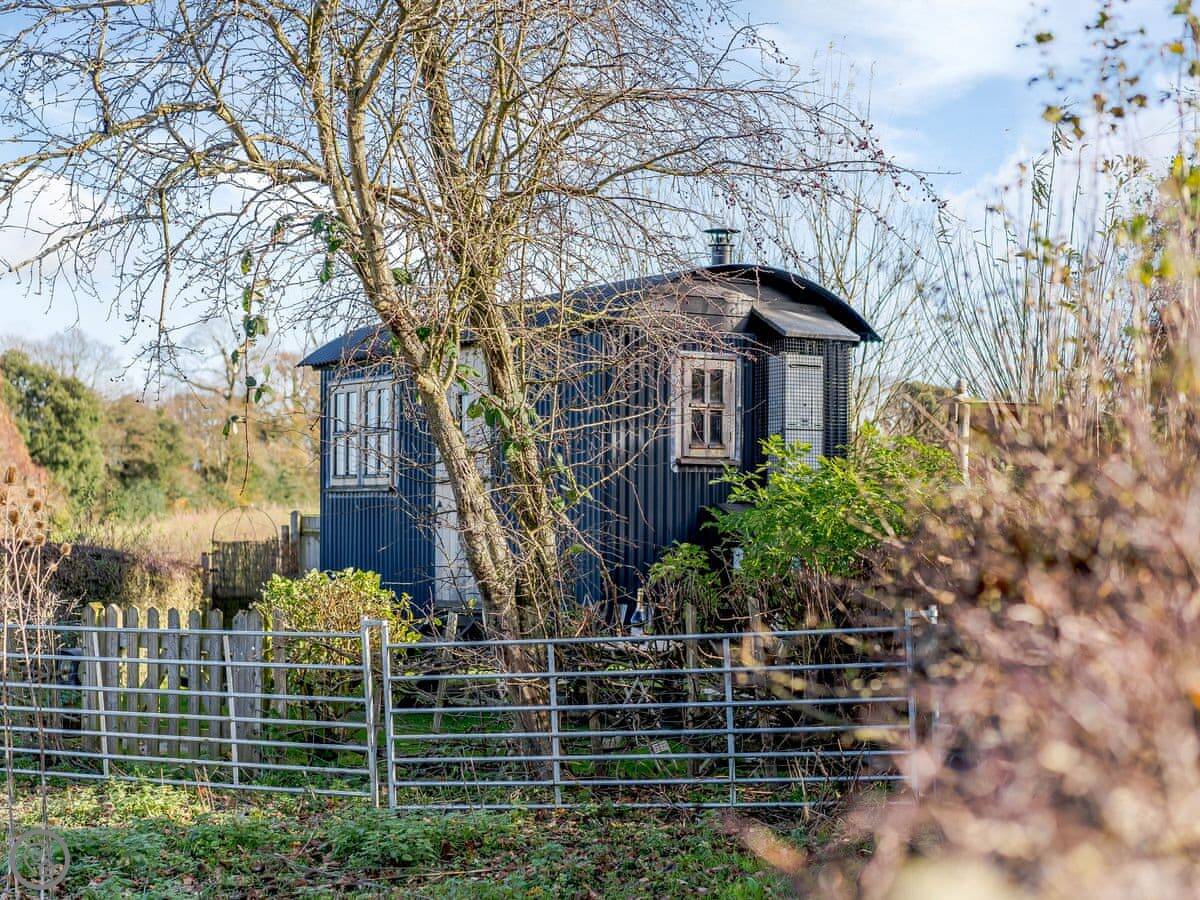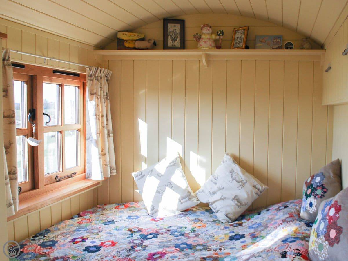 Elsie’s Hut is a traditional style, bespoke Plankbridge shepherd’s hut, made to a very good standard with a very contemporary feel. It is warm and cosy with its solid English oak floor, Farrow Ball painted interior and Hobbit log wood burner. The hut has a spacious shower room with toilet, Belfast sink and storage cupboards, double window and stable door. It is lit by solar power and has two 12V charging points for mobile phone or iPad and Wi-Fi. Outside there is an undercover cooking area with sink, camping stove, barbecue and fire pit and a private garden area with table and chairs for outside dining. All cooking and dining equipment is provided. Sit up on the comfy double bed or stand by the stable door to see views across the fields or watch the sunset. Enjoy the magic of stargazing with a dark sky.