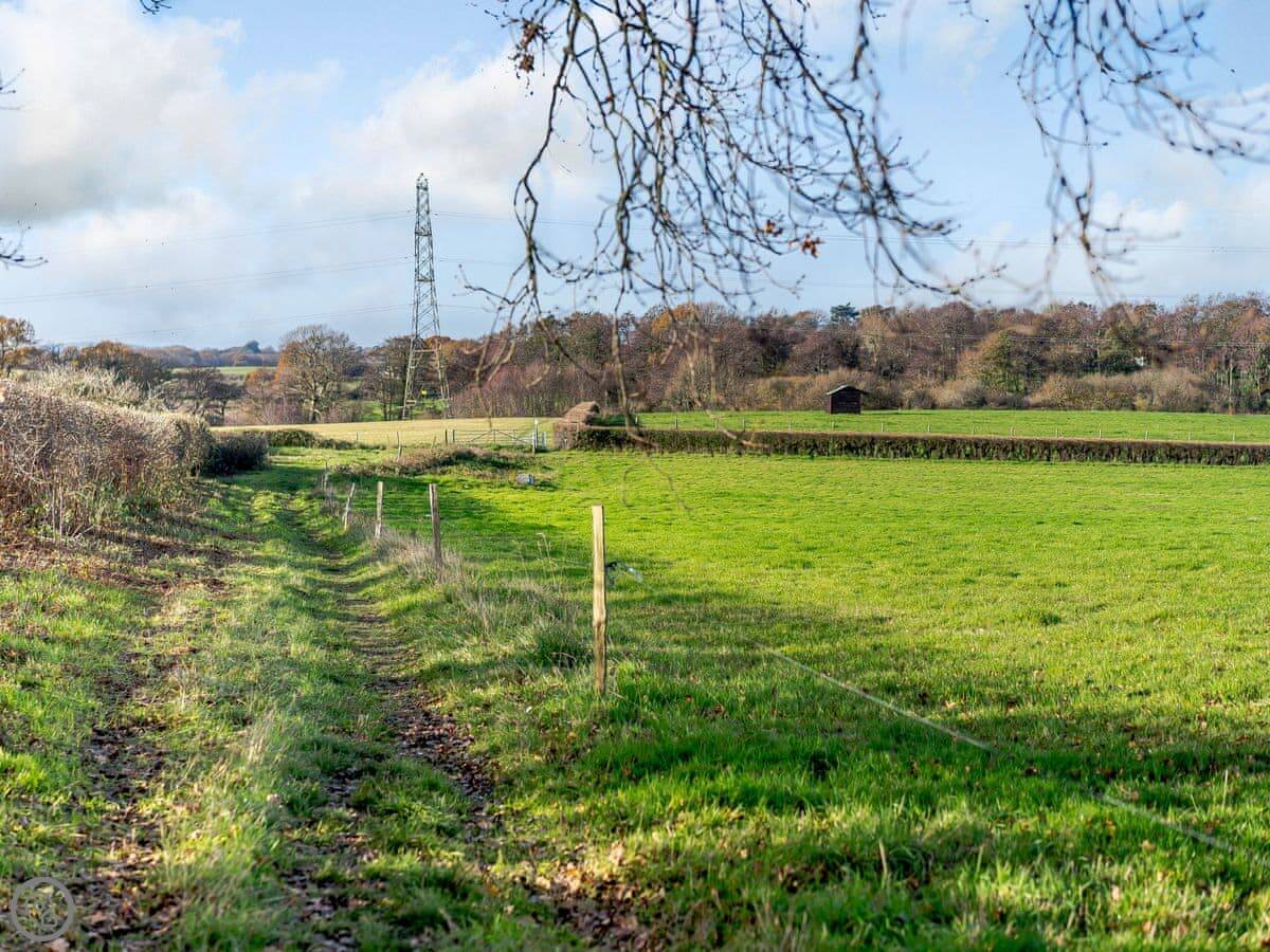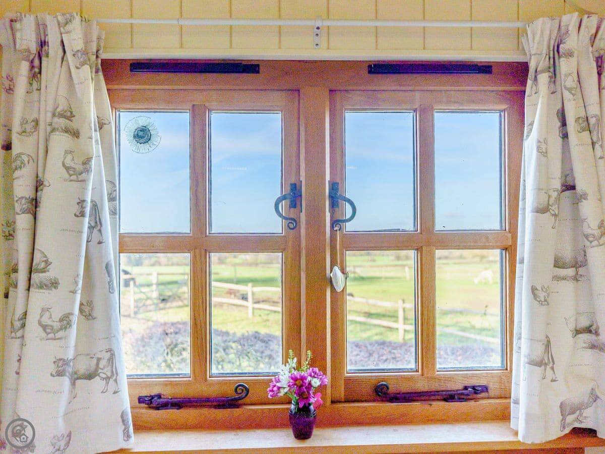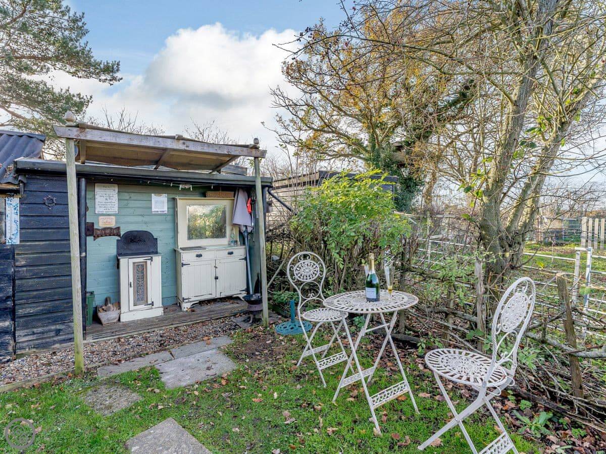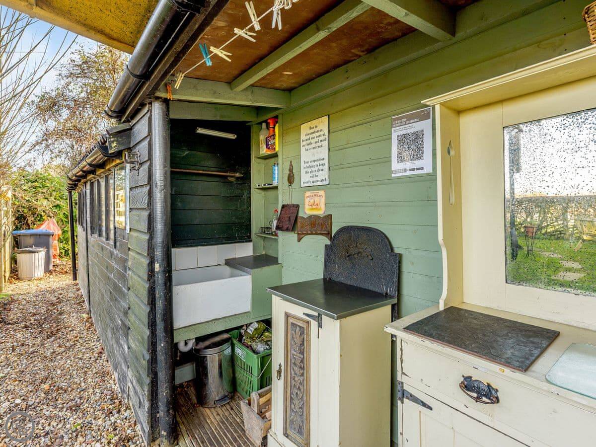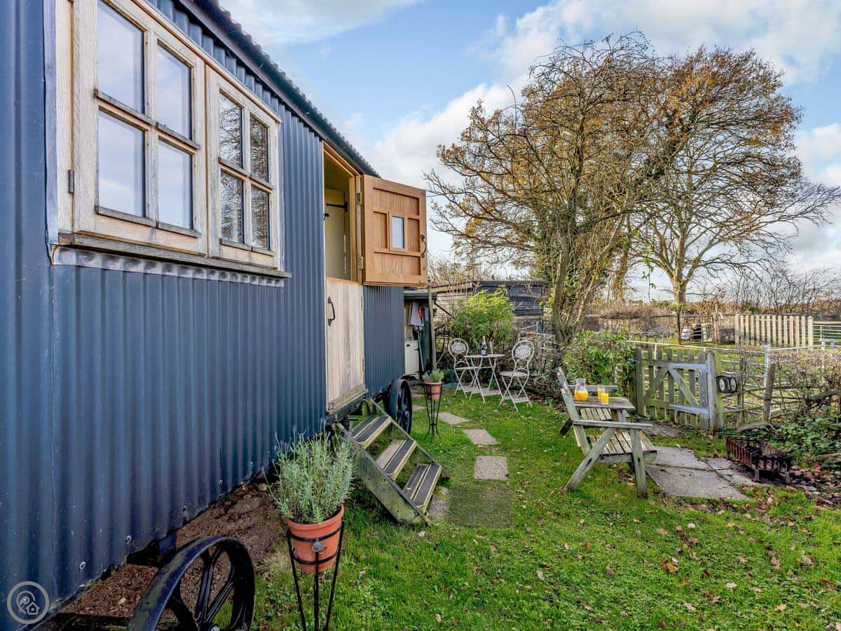 Elsie’s Hut is a traditional style, bespoke Plankbridge shepherd’s hut, made to a very good standard with a very contemporary feel. It is warm and cosy with its solid English oak floor, Farrow Ball painted interior and Hobbit log wood burner. The hut has a spacious shower room with toilet, Belfast sink and storage cupboards, double window and stable door. It is lit by solar power and has two 12V charging points for mobile phone or iPad and Wi-Fi. Outside there is an undercover cooking area with sink, camping stove, barbecue and fire pit and a private garden area with table and chairs for outside dining. All cooking and dining equipment is provided. Sit up on the comfy double bed or stand by the stable door to see views across the fields or watch the sunset. Enjoy the magic of stargazing with a dark sky.