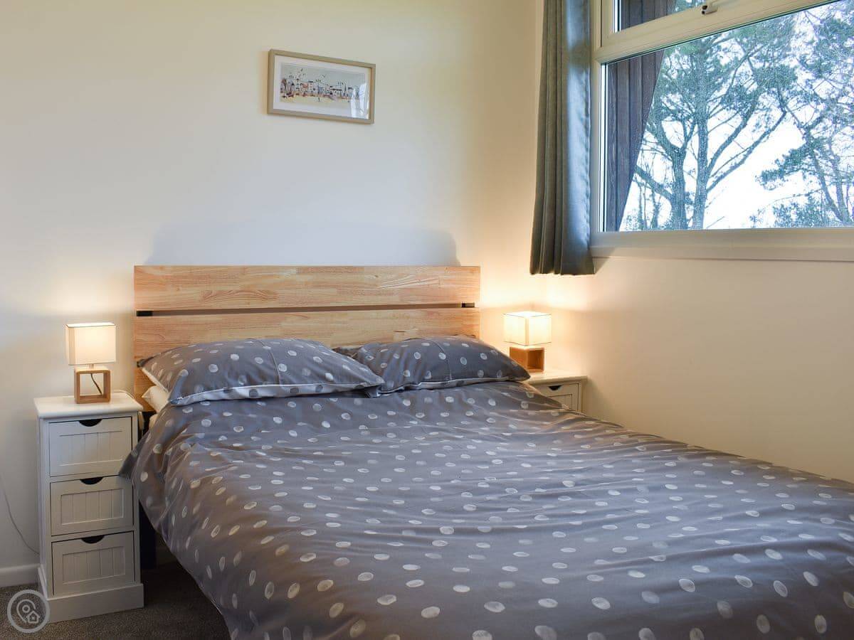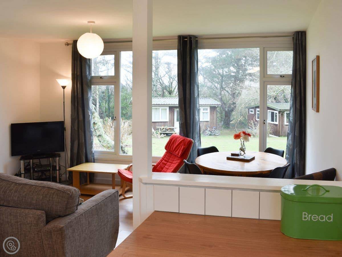 It sleeps four. Two bedrooms and one bathroom. The rating is 3 Star, so it's comfortable and clean. The patio area is yours to use and looks out into the shared woodland grounds. There's parking right outside.