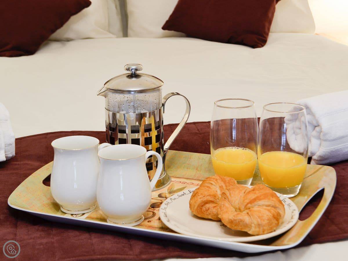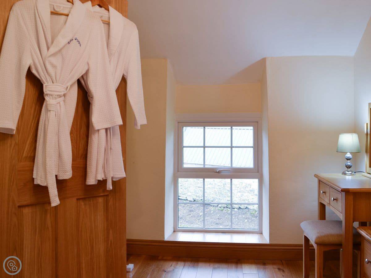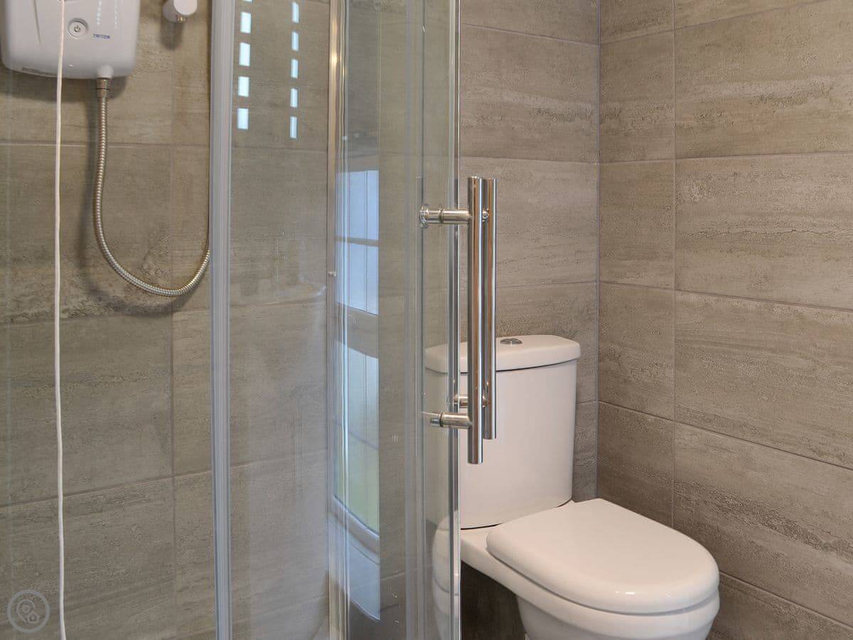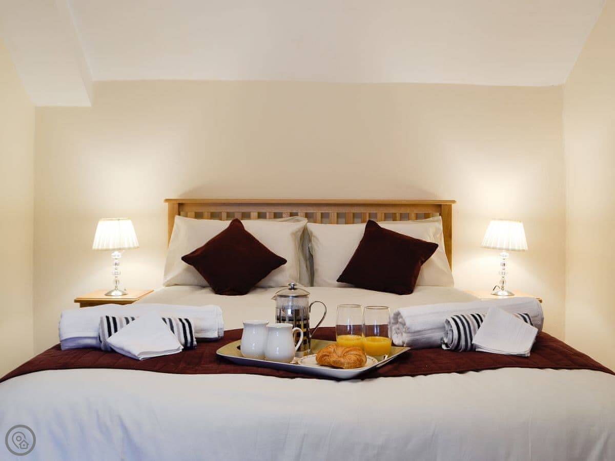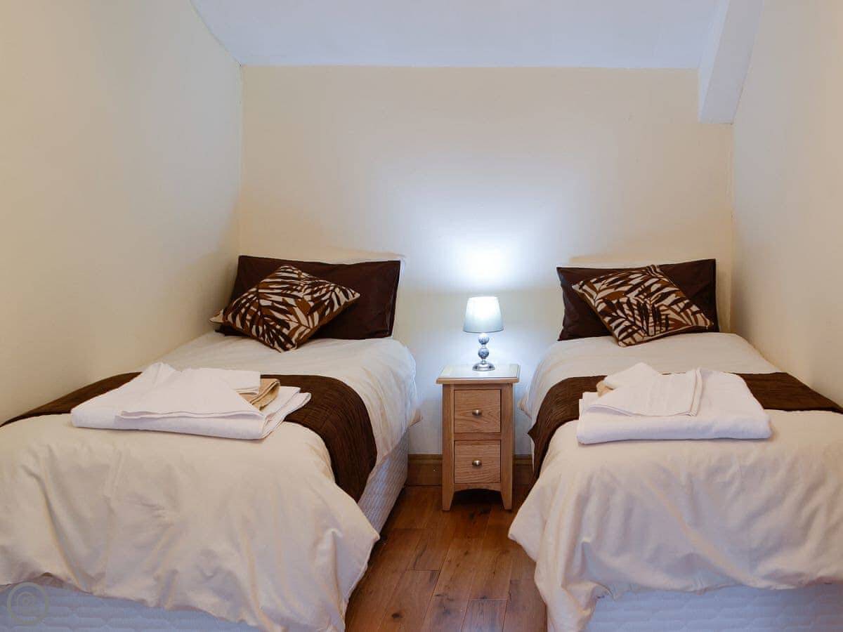 It sleeps four. Two bedrooms, one shower room upstairs. One bedroom has a kingsize bed and a TV. The other has two single beds that can be pushed together to make a double. It's got a 4 Star rating. The place was renovated a few years ago so it's in good order.