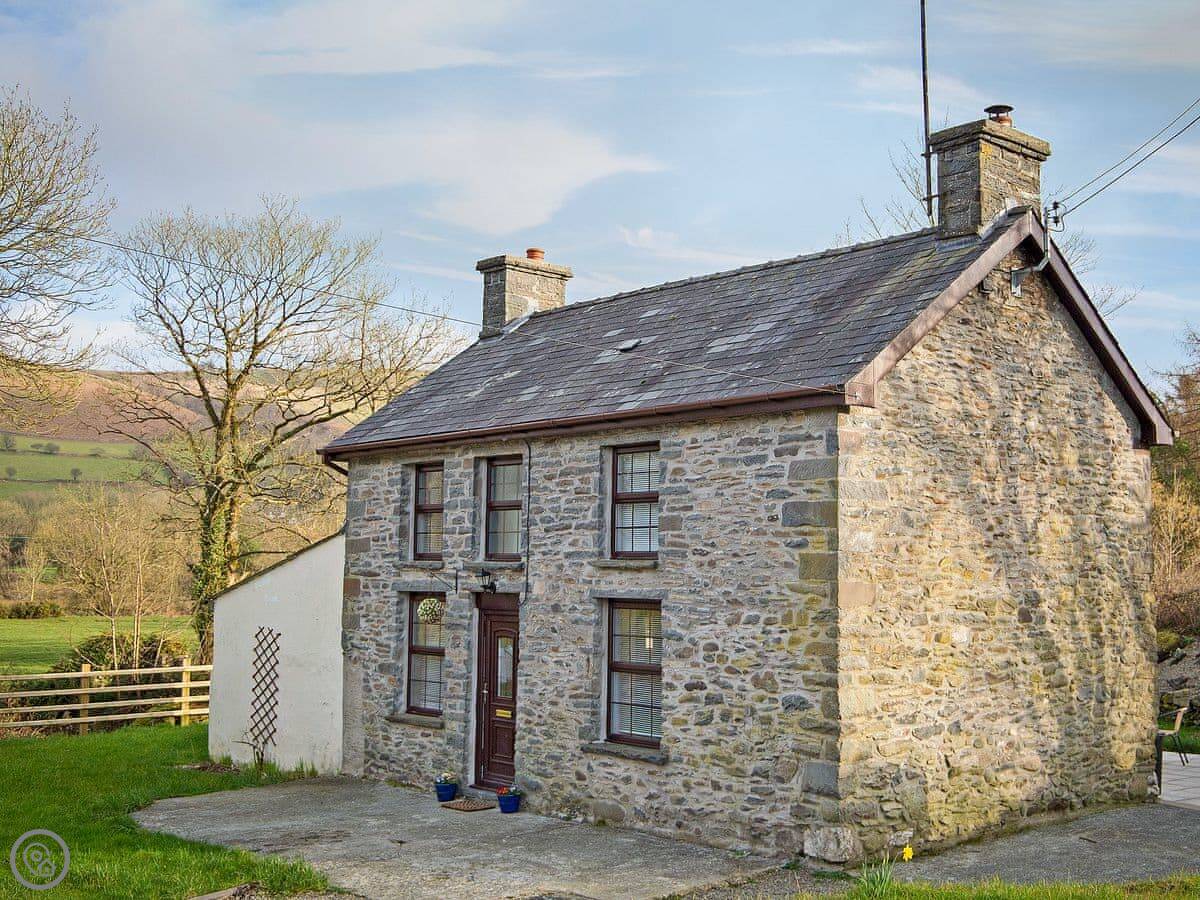 Felin Gogoyan is a mill cottage near Llanddewi Brefi, right in the middle of the Cambrian Mountains. It's detached, so you're on your own out there. The view is just fields and hills.