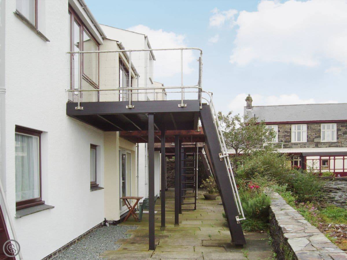 This is Ffestiniog View. It's a terraced house in Porthmadog. The name comes from the balcony, which looks out over the railway lines. You can see the steam trains from the Ffestiniog and Welsh Highland railways chuffing past. They go up to Blaenau Ffestiniog or down towards Caernarfon. The mountain views the other way are good too.