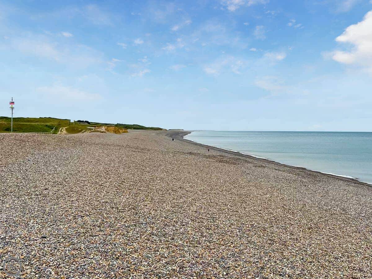 The village shop and a pub are about 50 yards away. There's a restaurant just up the road too. The shingle beach and the sea are a short walk, maybe ten minutes.