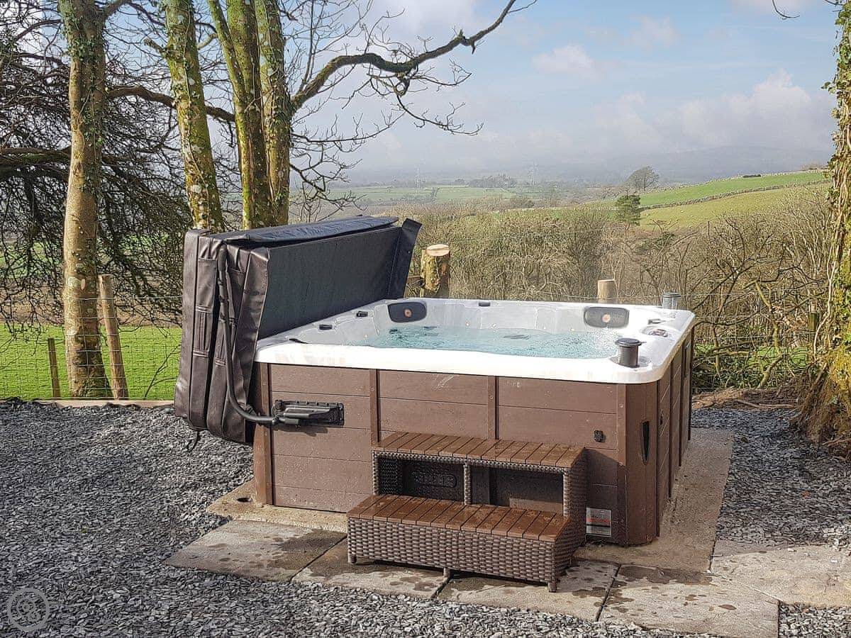 The courtyard is enclosed and has a hot tub, a patio area, and a BBQ. It's private. The living space is open plan, modern, and clean.