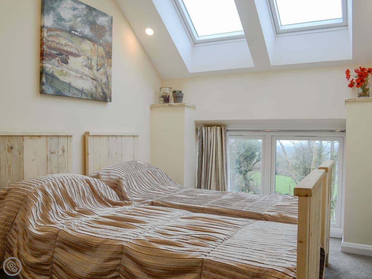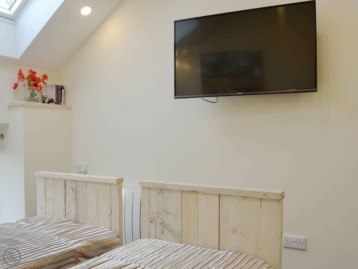 It sleeps four. Two bedrooms, one kingsize and one twin, and two bathrooms. It's got a 5 Star rating, which means it's well-finished and comfortable. Everything is on one level inside, which is good for accessibility, but there's a step down into the private courtyard.