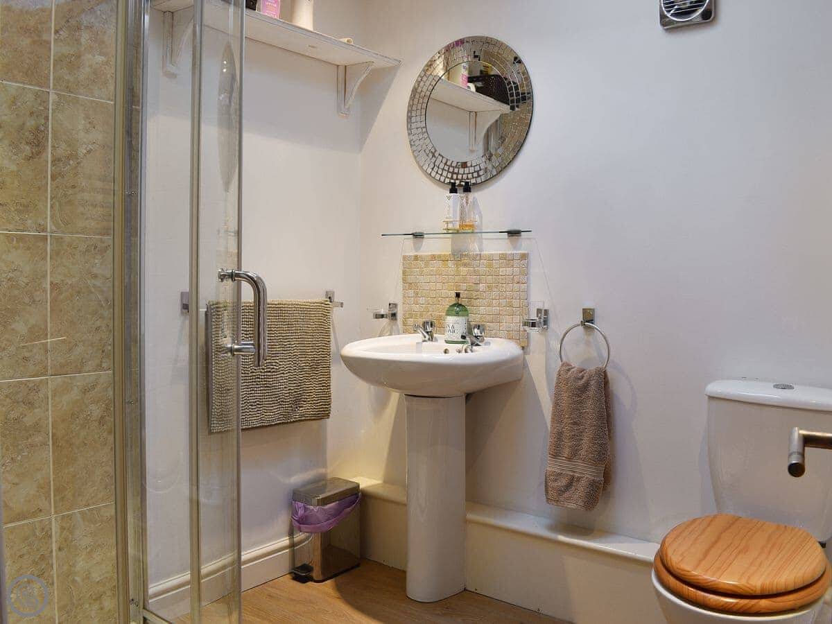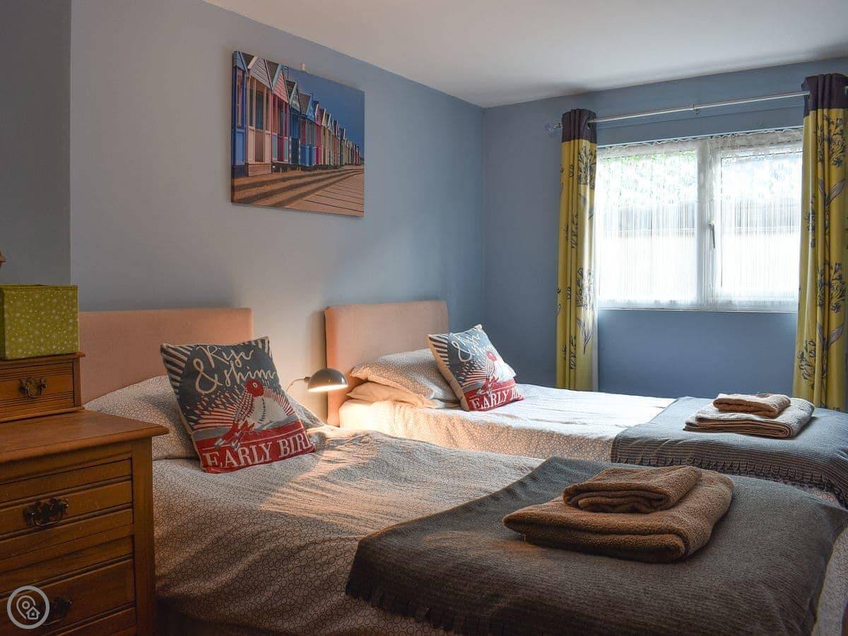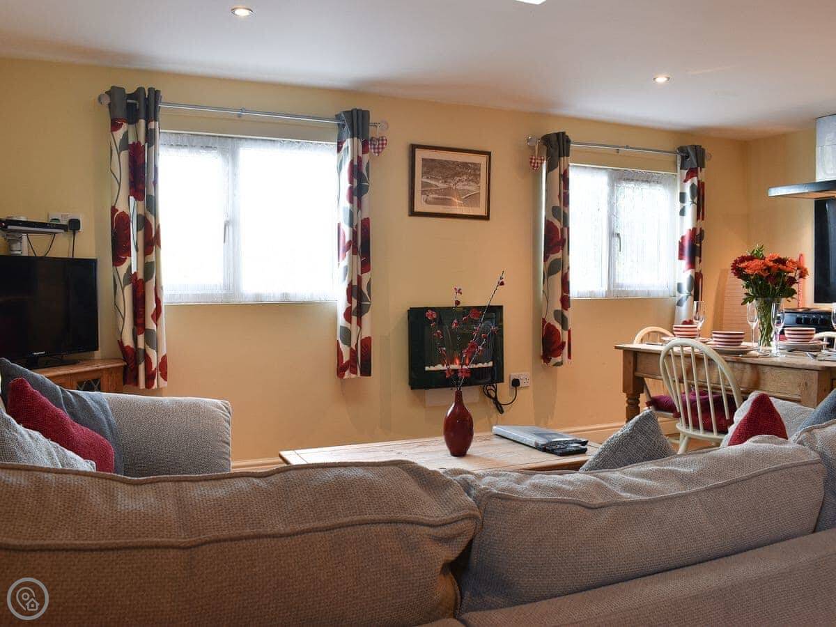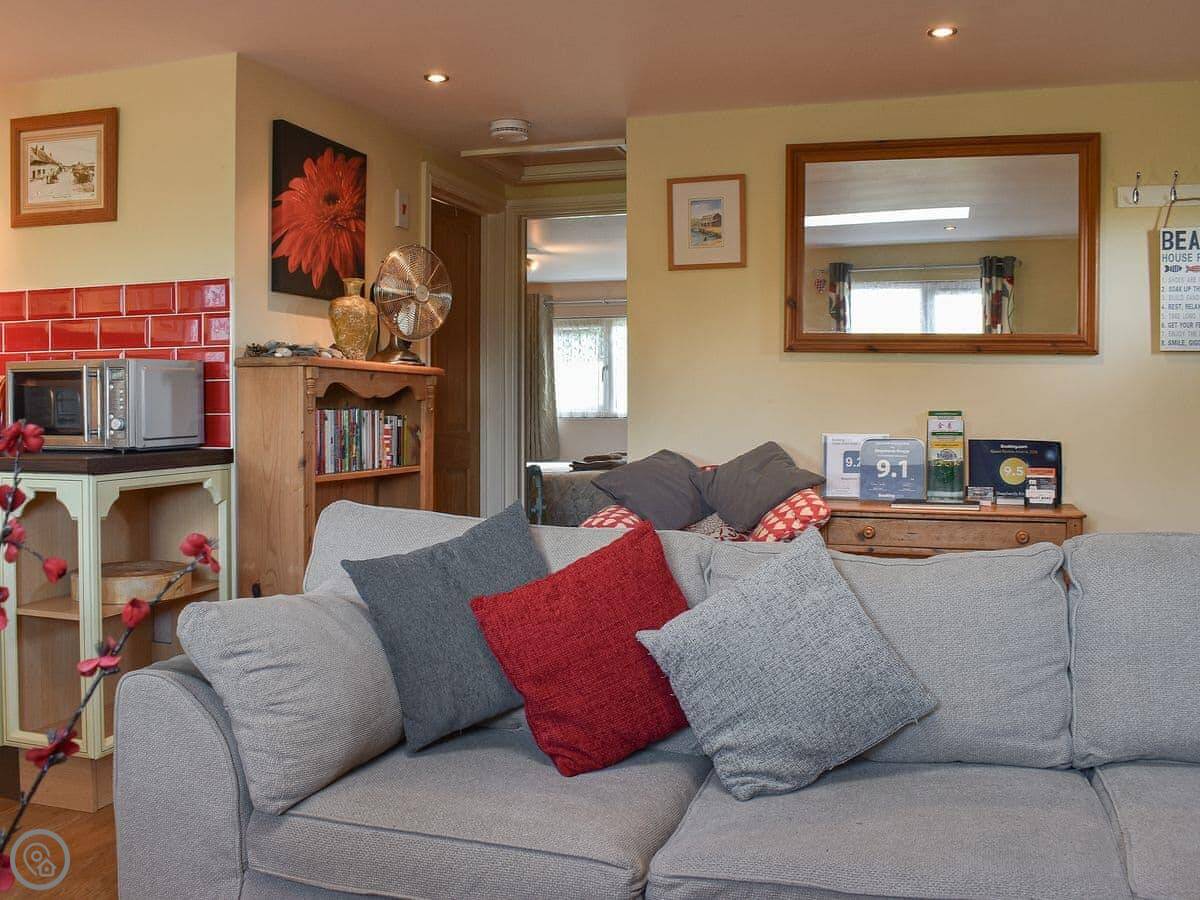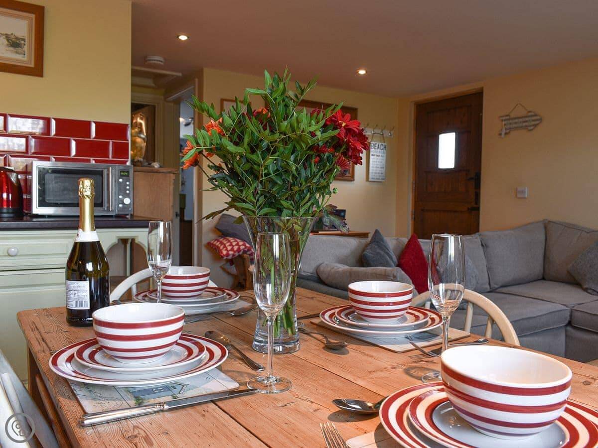 It sleeps four. Two bedrooms, one is a double, the other has two singles. There's one shower room. It's got a 4 Star rating. The living space is open plan, kitchen, dining, and sitting area all in one room. There's a large corner sofa. The dining table is pine. It's a practical space.