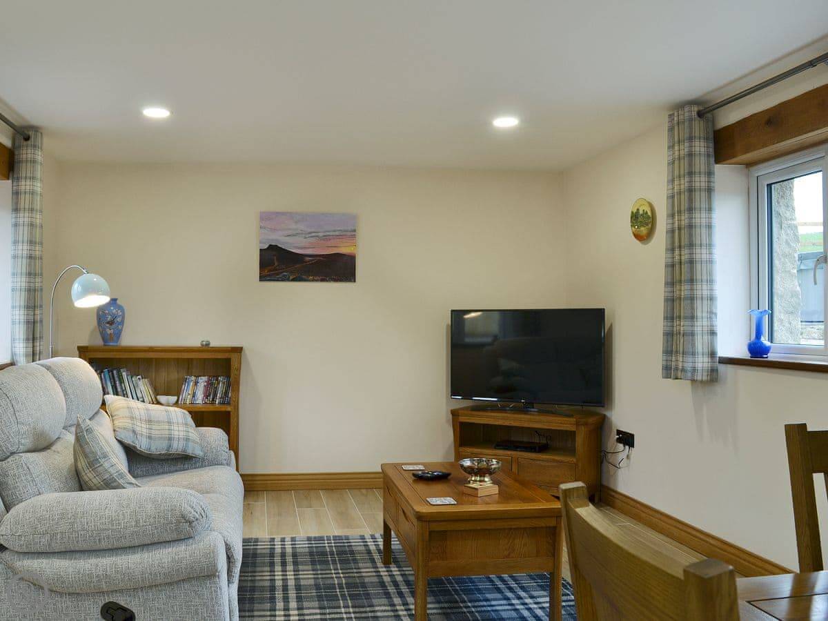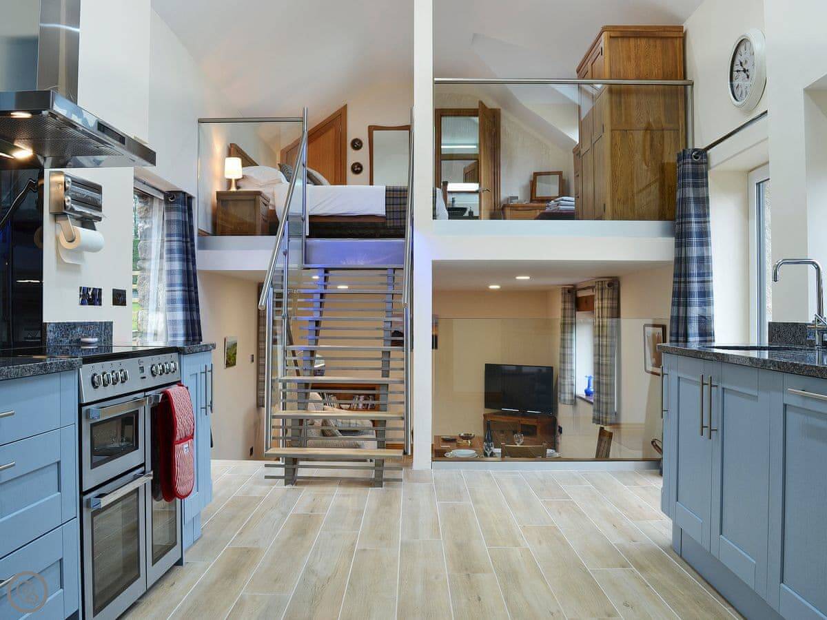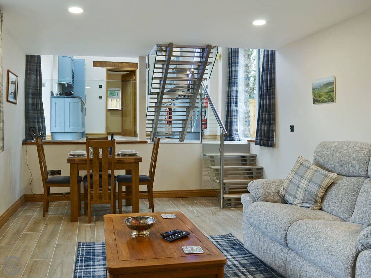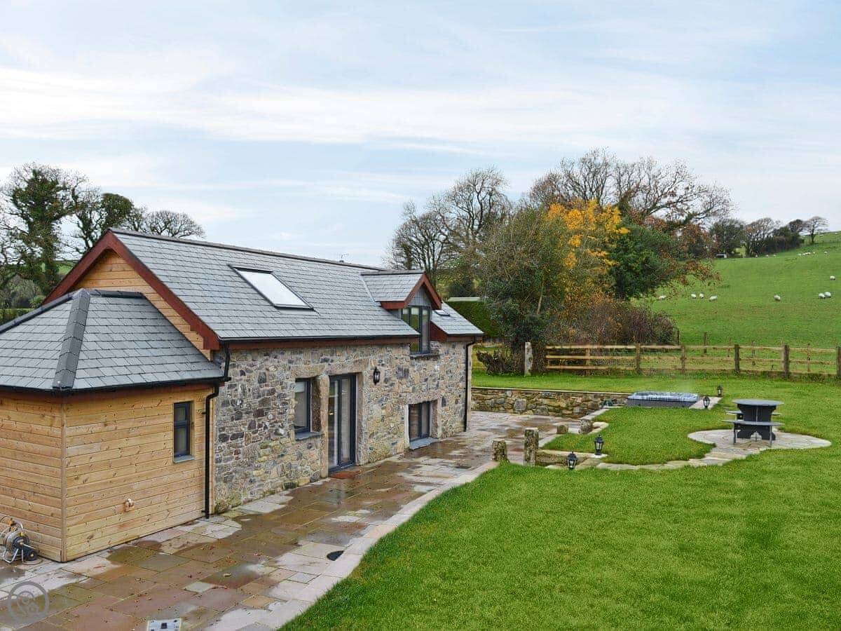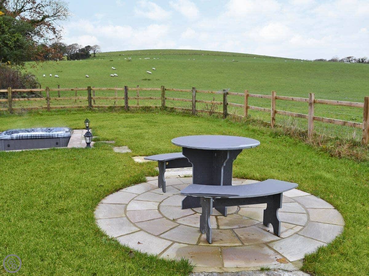 The layout is open plan. There's a kitchen area, a living space, and doors out to a big private patio. The garden is enclosed. There's a hot tub on the patio. You can see fields and Dartmoor in the distance.
