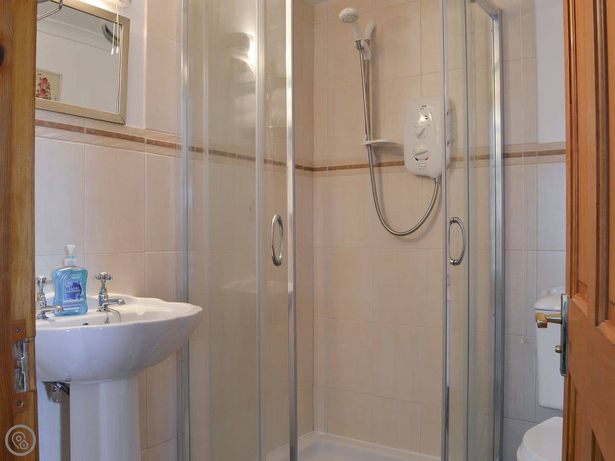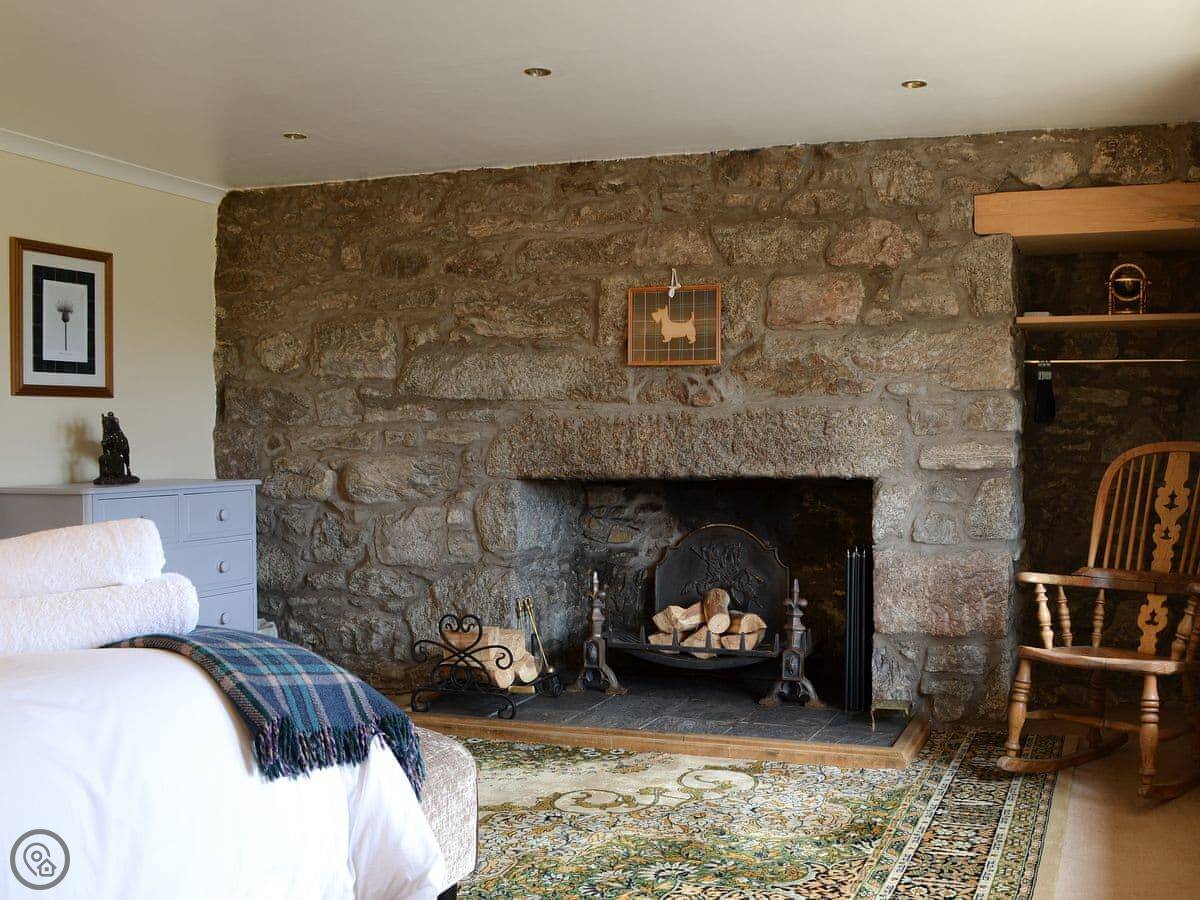Two bedrooms are downstairs. The main one is huge, with an old stone fireplace covering one wall. The twin room downstairs has its own shower. Upstairs is a really large living room with another big fireplace. Three more bedrooms are up there: a twin, a double, and a single. The twin and double have their own bathrooms.