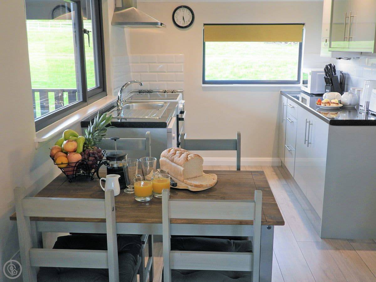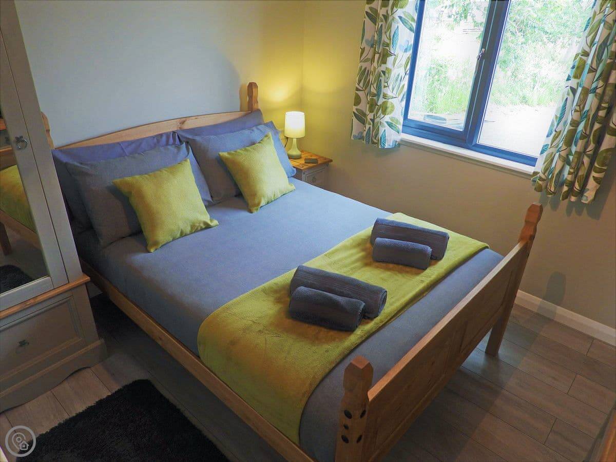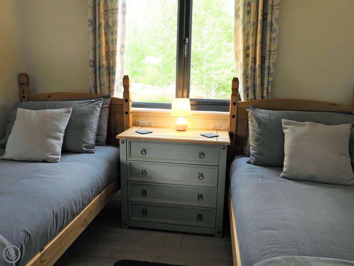 The lodge sleeps four. Two bedrooms, one bathroom. It's got a 4 Star rating. We updated it in 2019, so it's fresh and clean. Everything's on one level, which is good if stairs are a problem. The entrance and doors are wheelchair accessible. You get your own enclosed garden with a patio area.
