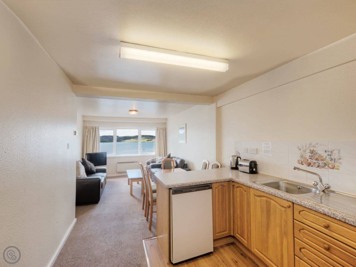 Scarba 1 is a dog friendly apartment, with an open plan living/dining room/kitchen with spectacular sea views. There is a double bedroom, a twin bedroom and family bathroom. Maximum sleeps 4. Beach 2 miles. Beach 1 mile. Shop, pub and restaurant 500 yards.