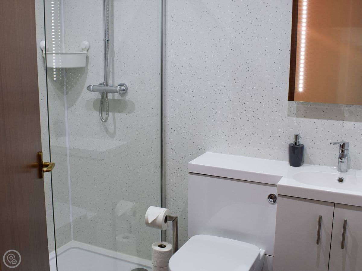 It sleeps four, with two bedrooms and one bathroom. Everything is on the ground floor. It's got a 4 Star rating, so it's comfortable and well equipped. The shower is good, a proper walk-in one.