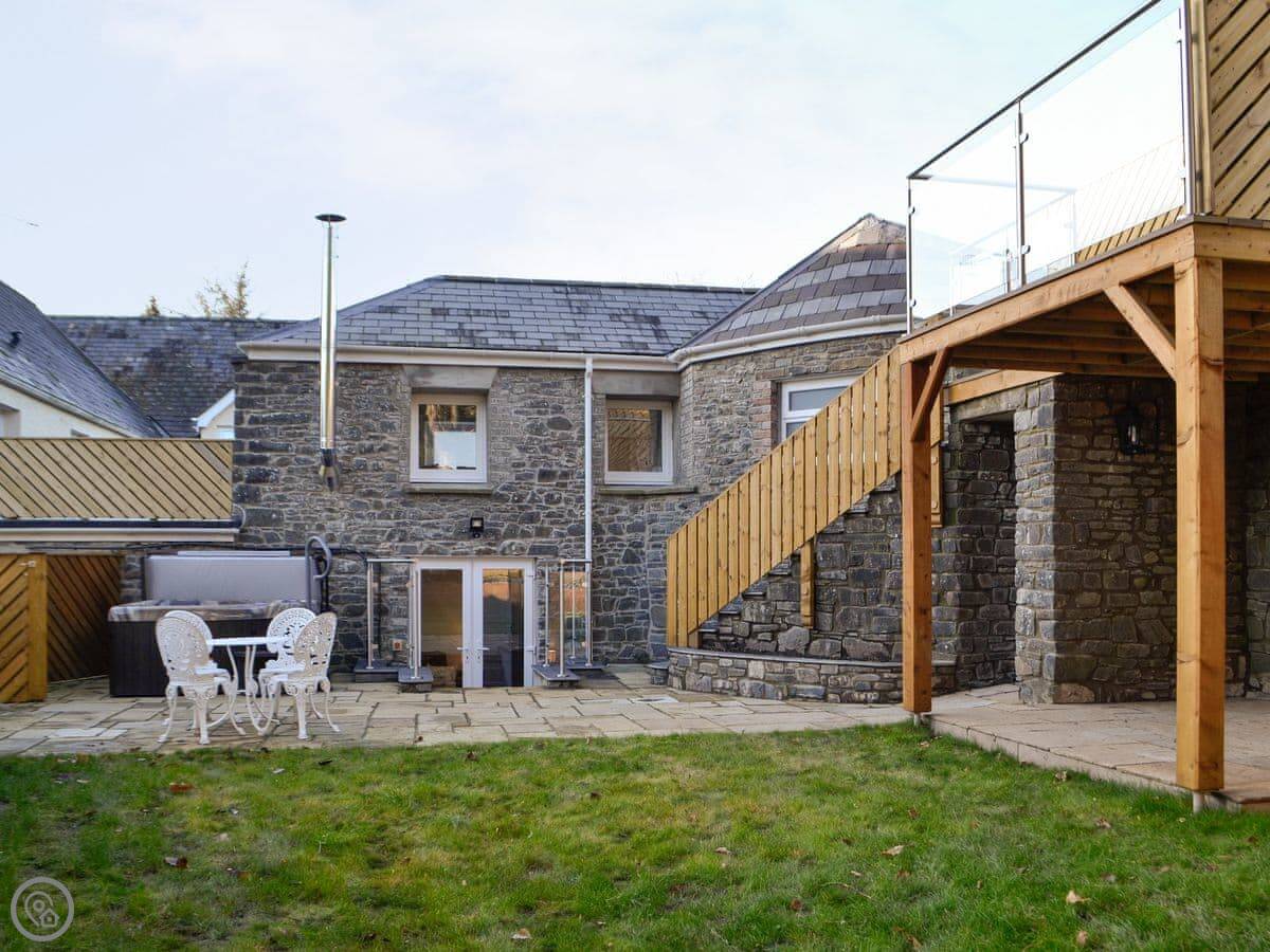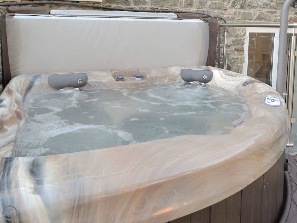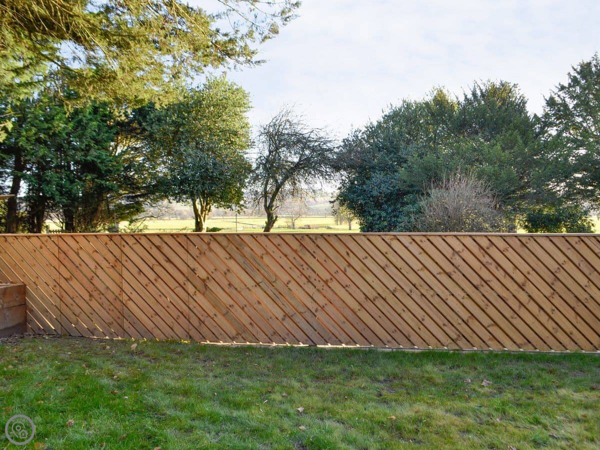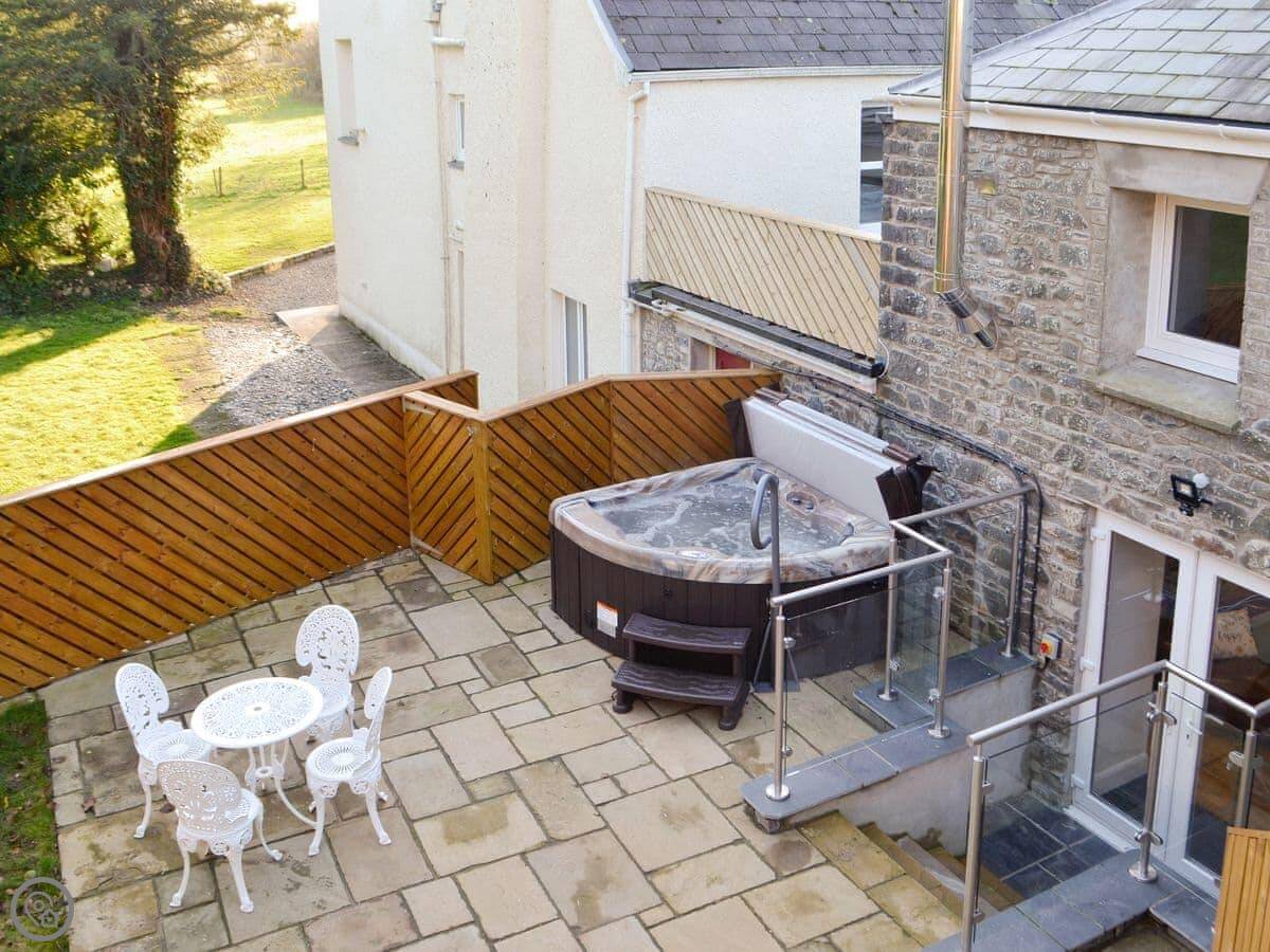 The garden is enclosed, which is handy. There’s a lawn and a patio area that looks over the fields. And there’s a hot tub out there.
