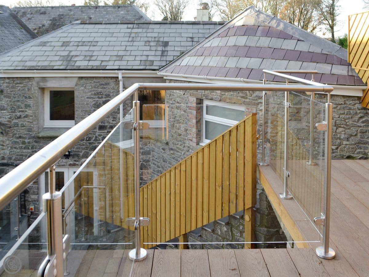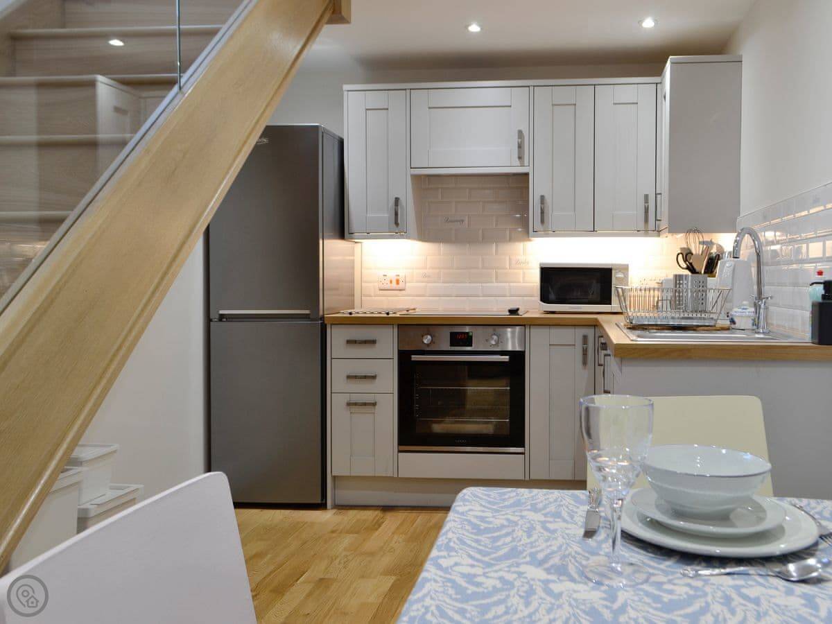 It’s a one-bedroom cottage, sleeps two. They gave it a 4 Star rating. It’s been done up recently so everything feels quite new. The main room is all open plan, kitchen, dining, living space, with a wood burner. There’s underfloor heating downstairs which is good. You can get out from there into the garden.