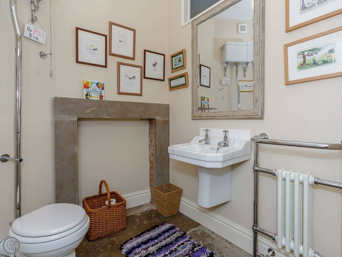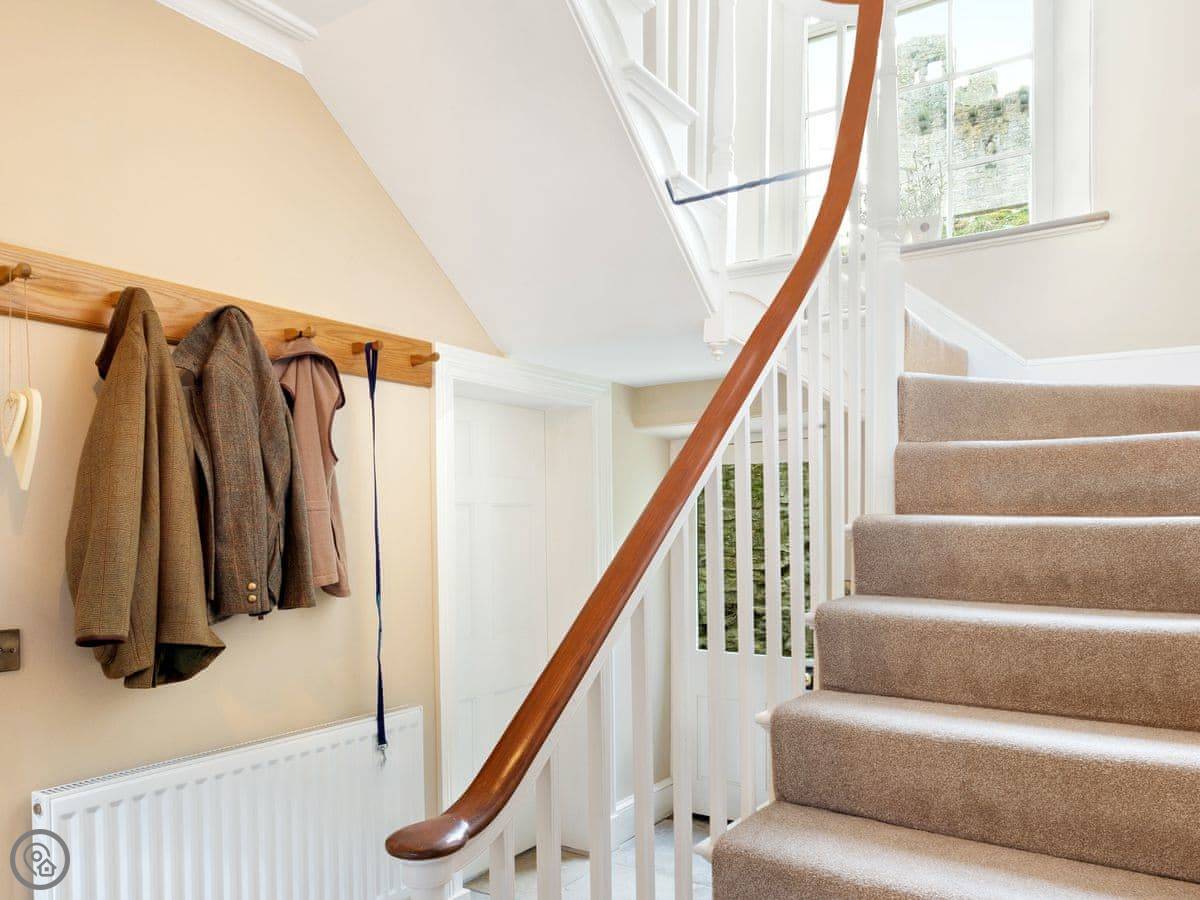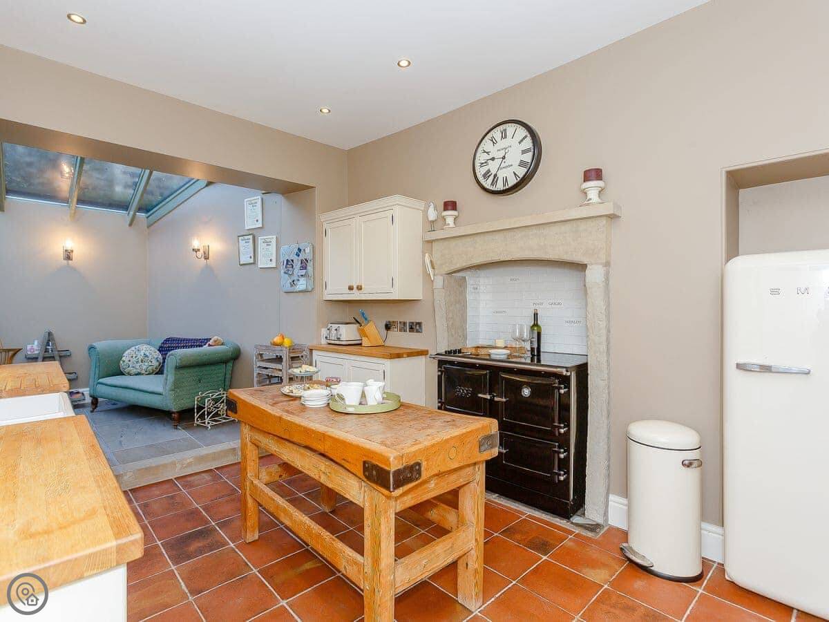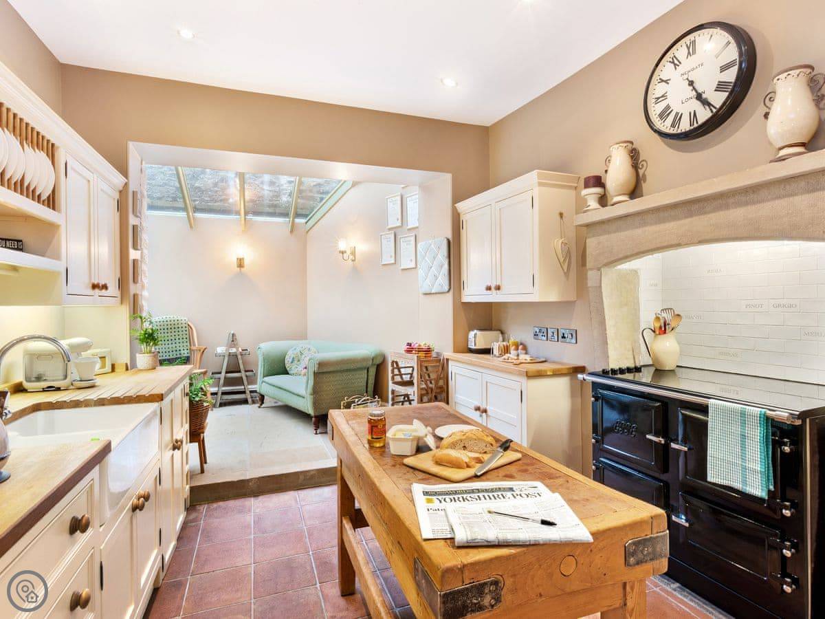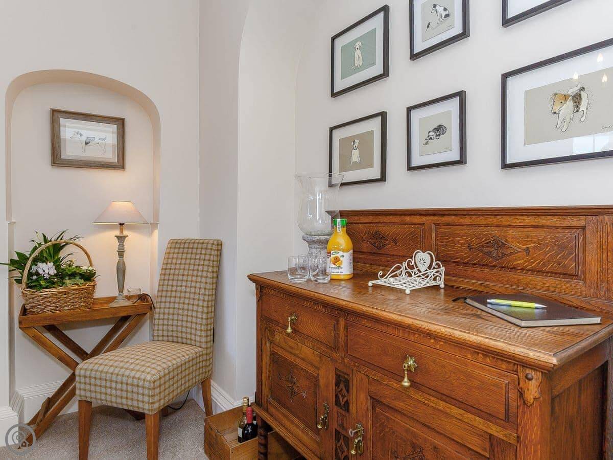A separate dining room with wood burner and large table is perfect for a celebratory meal. To the rear, the spacious kitchen extends into a sun room with seating area and makes for a sociable space to gather. With cream shaker-style units and a stylish, central oak butchers block, you’ll find a full range of quality appliances including an Esse range cooker, Smeg fridge and dishwasher. The cupboards are well stocked with all the crockery and utensils you’ll need to rustle up a hearty family dinner. There is a separate utility room with washing machine, and in the adjoining coach house, the boot room proves very handy for storing and cleaning muddy walking clothes.