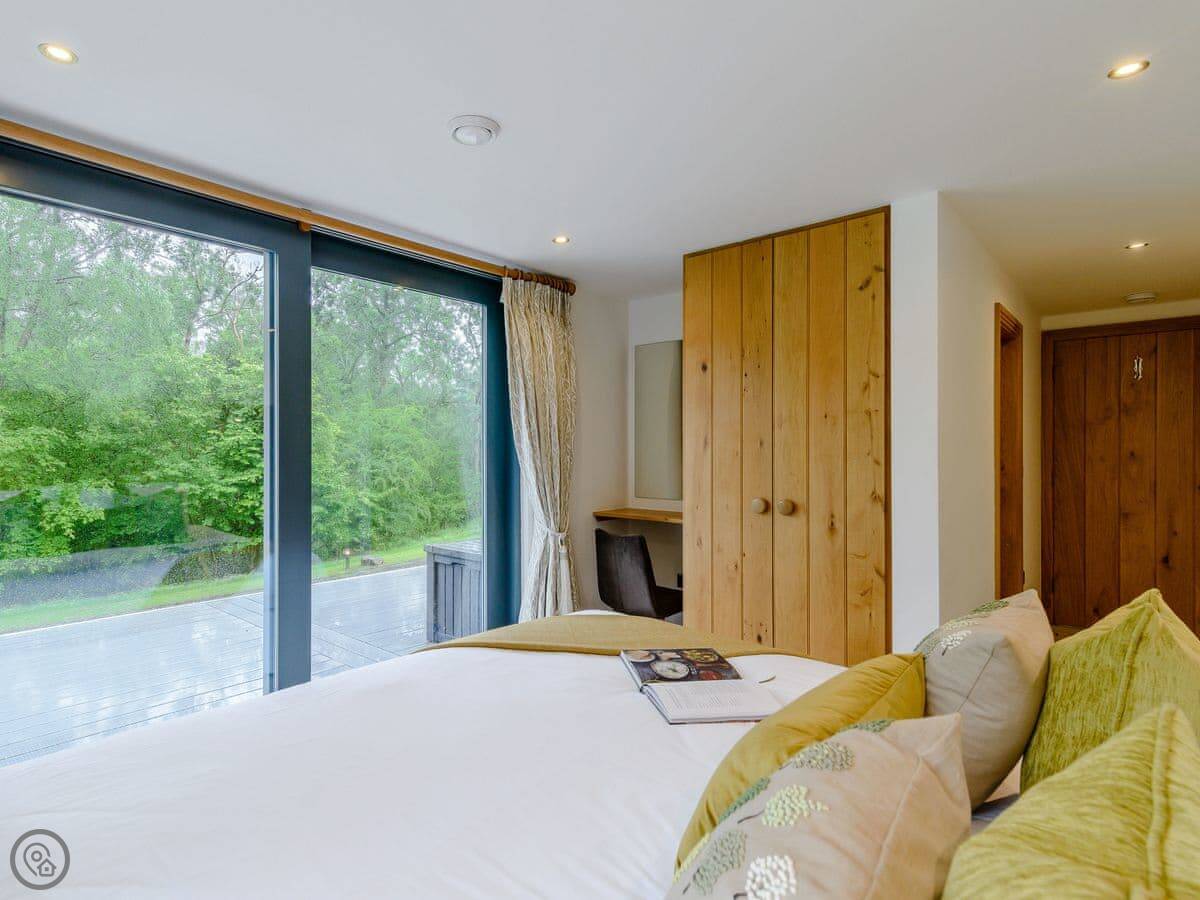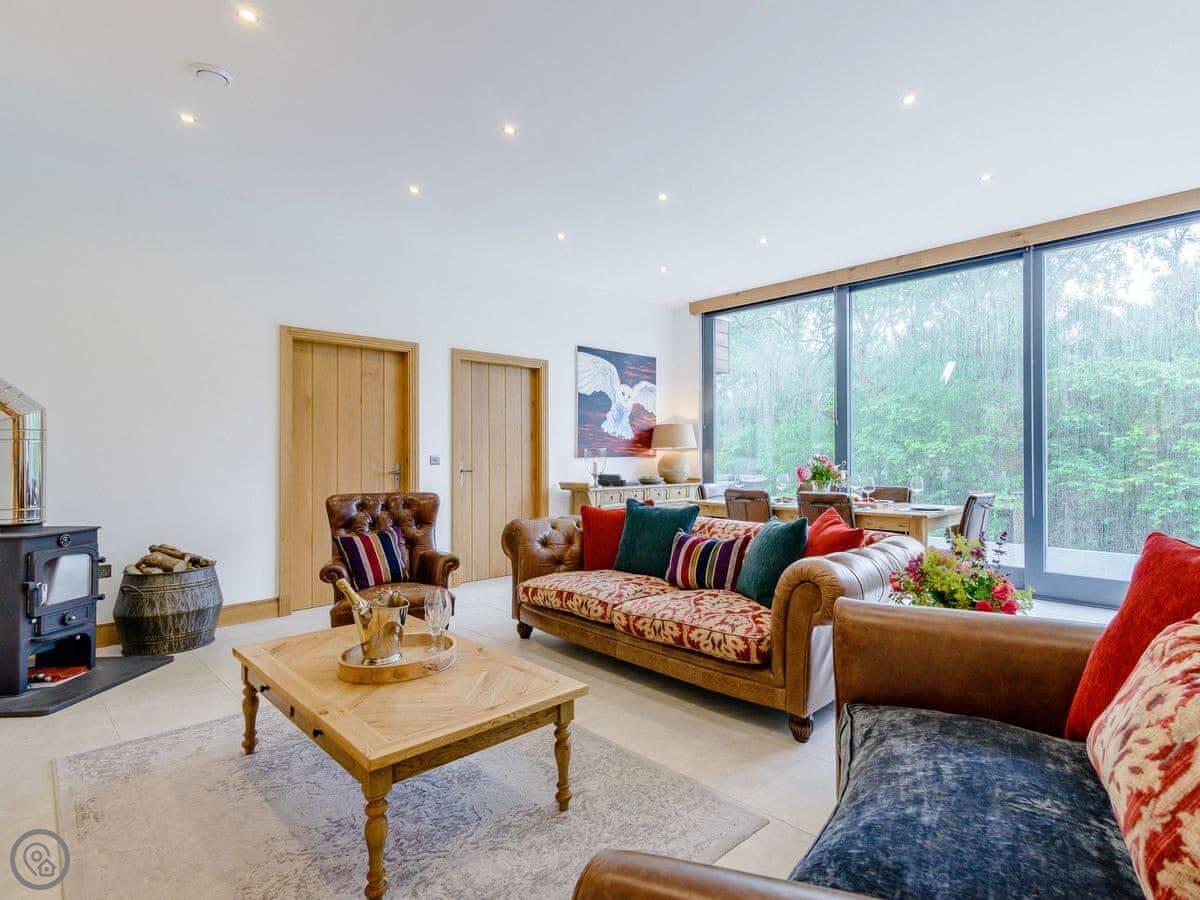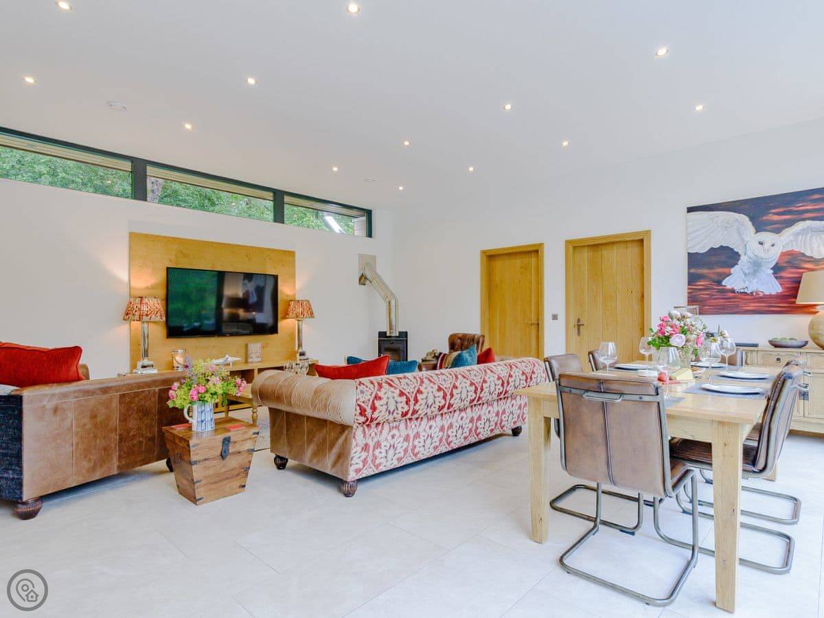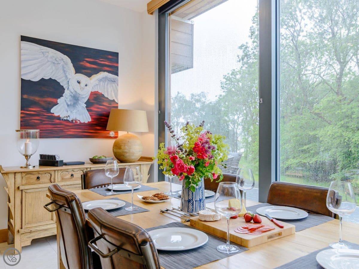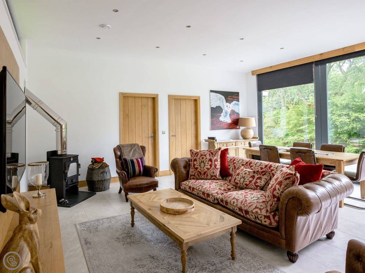 A truly magnificent architectural design Horse Spout lakestead is a detached lodge providing you the very best in holiday accommodation, it starts from the minute you enter the estate, driving past the beautiful Belted Galloway cattle as you head towards your holiday home. As you step in, you are greeted with a contemporary kitchen, fully equipped for all your needs and with views to die for, it will make cooking on your holiday that little more enjoyable! With floor to ceiling windows throughout the open plan living/dining area with the wood burner taking centre stage. From the living area there are two kingsize bedrooms and a twin bedroom, all with en-suite large showers and toilets. Horse Spout is close to the estate’s lake so as you sit on your balcony you can enjoy views to the front of the Lakestead, whilst the rear boasts a private hot tub overlooking the woodland. For those curious; a barn owl lives in the wood opposite and for this reason there is a commissioned painting of a barn owl for Horse Spout.