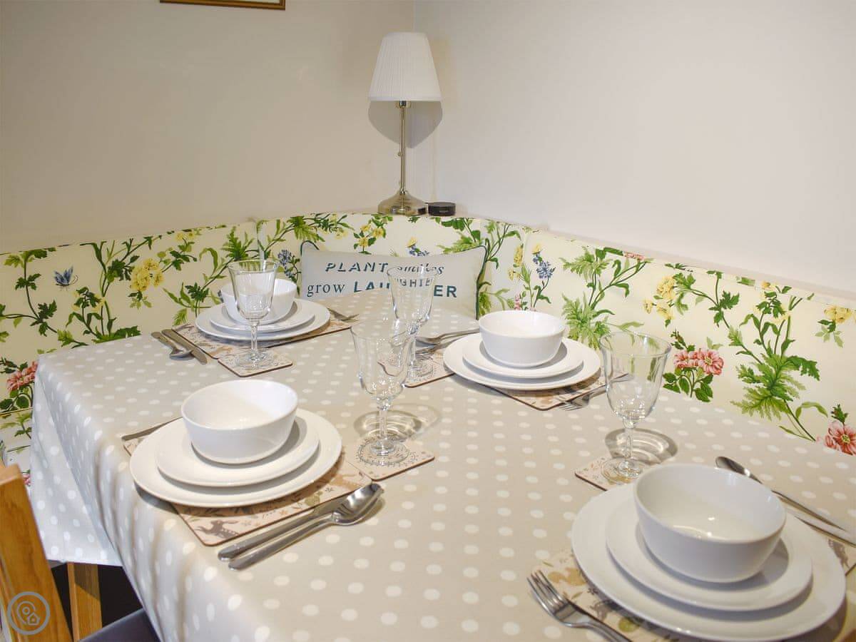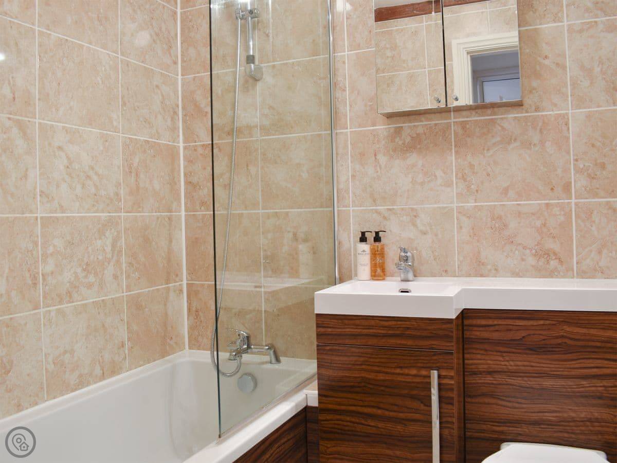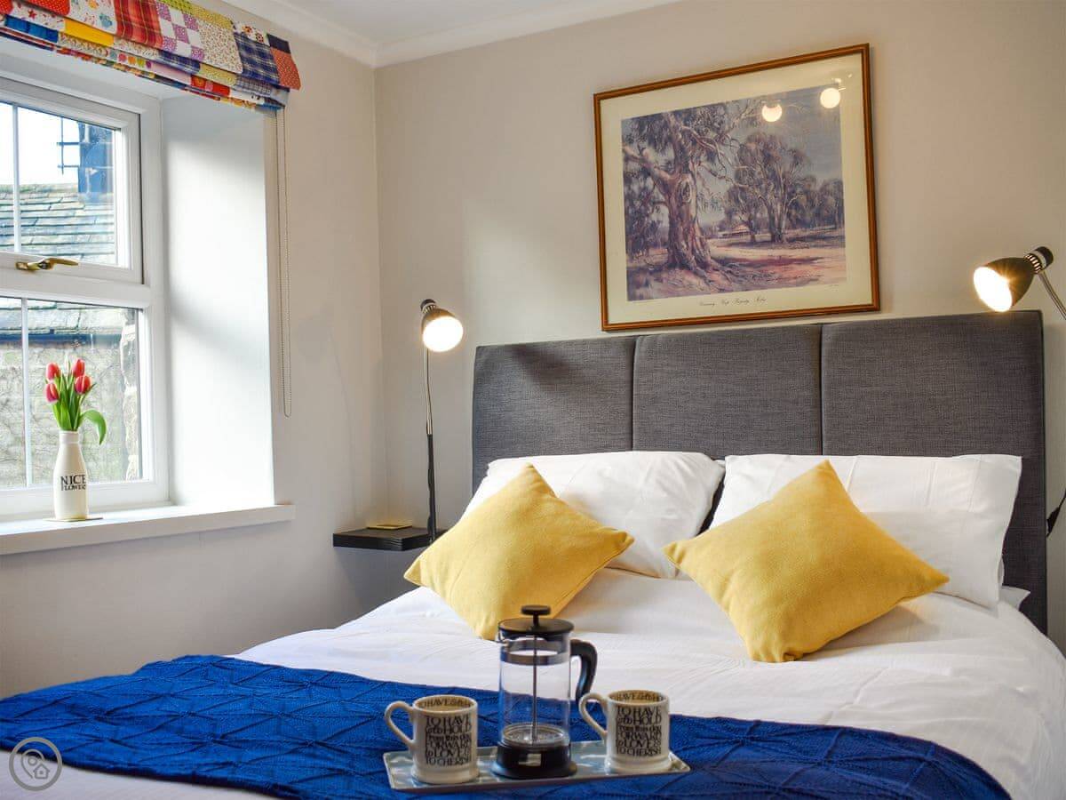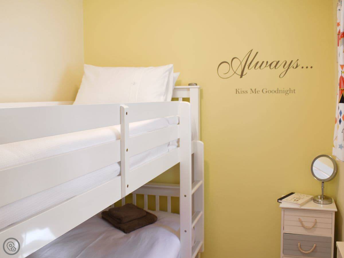 It sleeps four. There are two bedrooms and one bathroom. One bedroom has a kingsize bed and a walk-in wardrobe. The other has bunk beds, which are a standard single size. The bathroom has a bath with a shower over it. The cottage has a 4 Star rating.