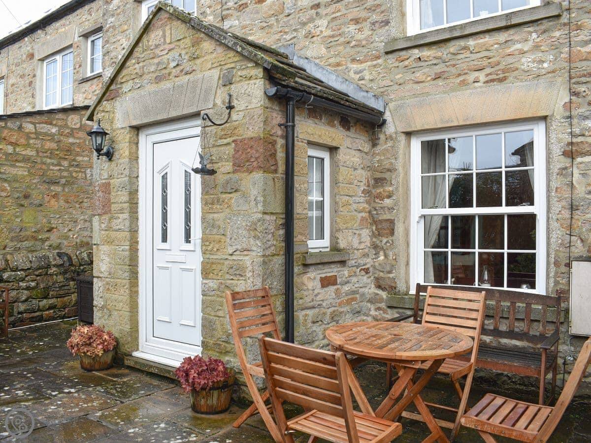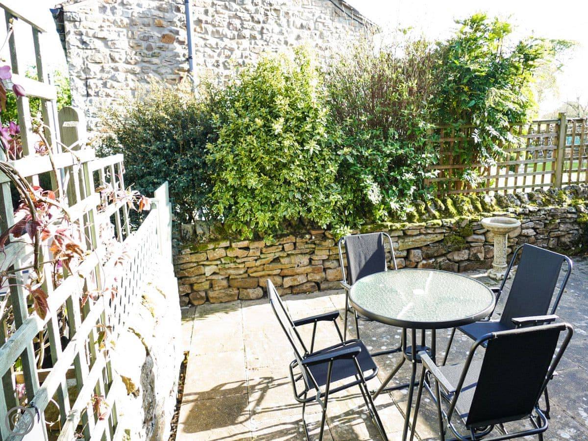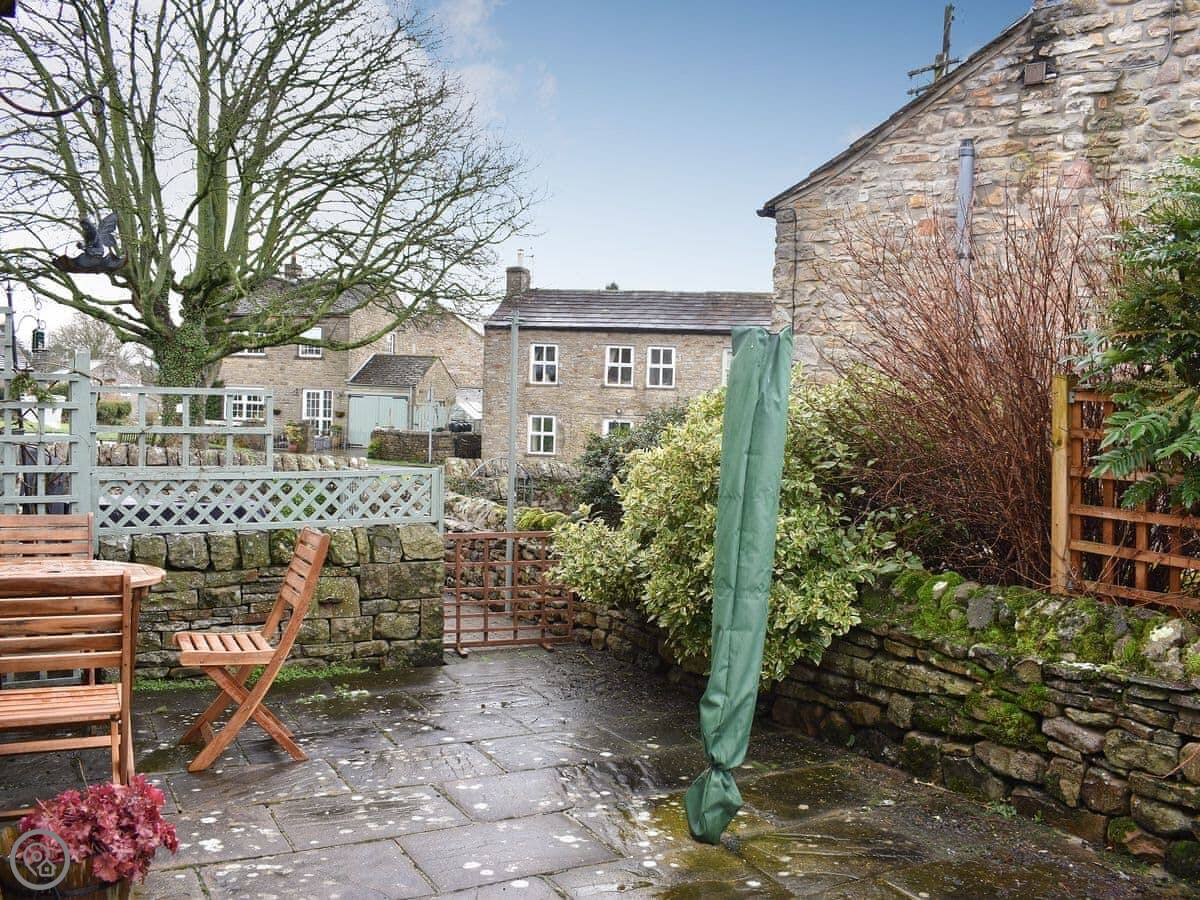 Outside, there's an enclosed patio area at the back with a table and chairs. The view looks across to Penhill. You can get to it from inside the cottage, or there's shared access past the neighbour's place.