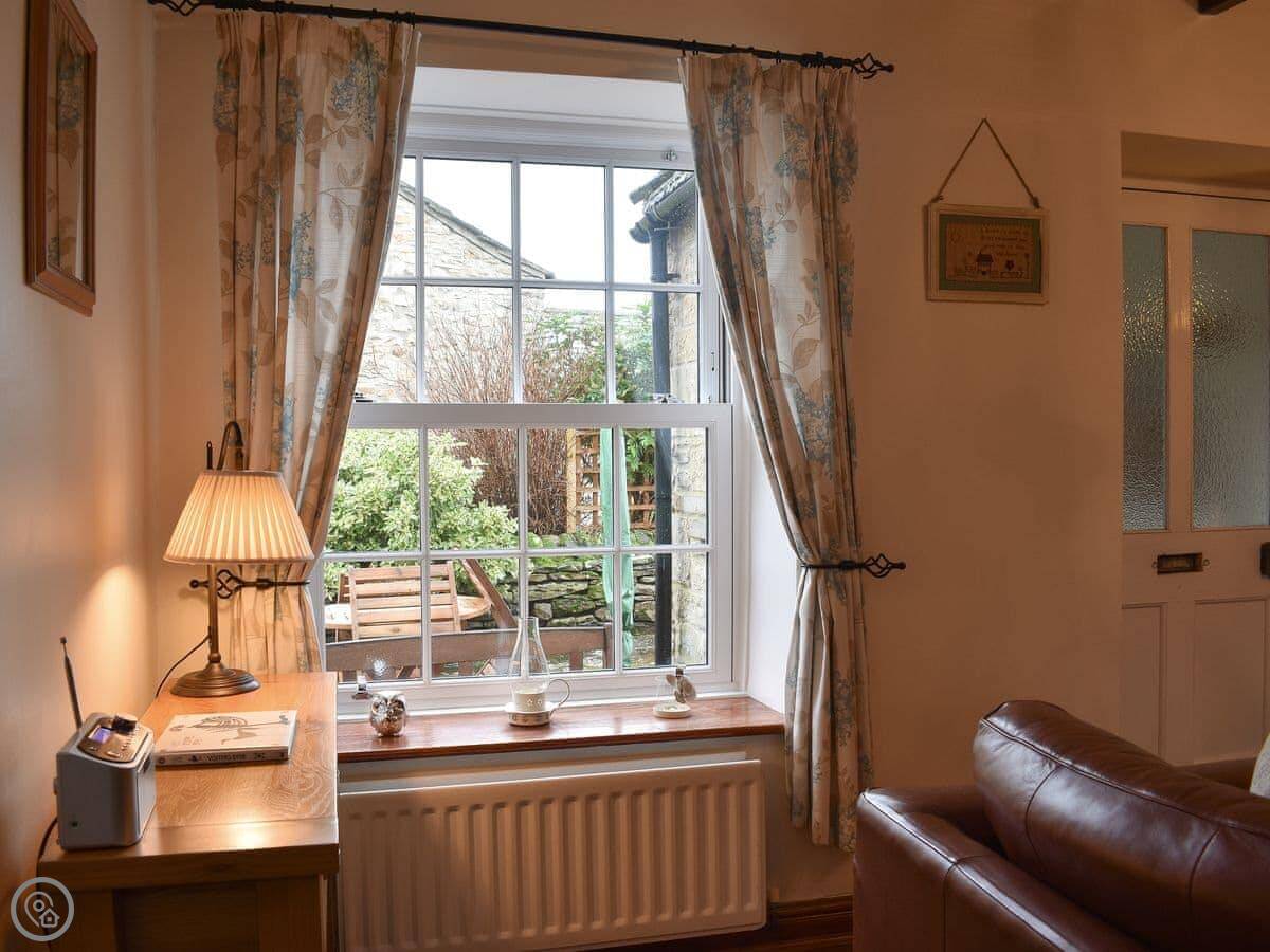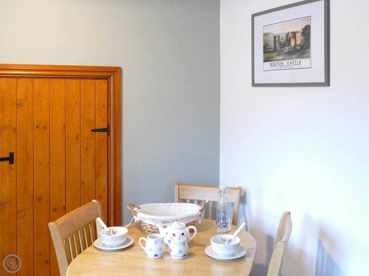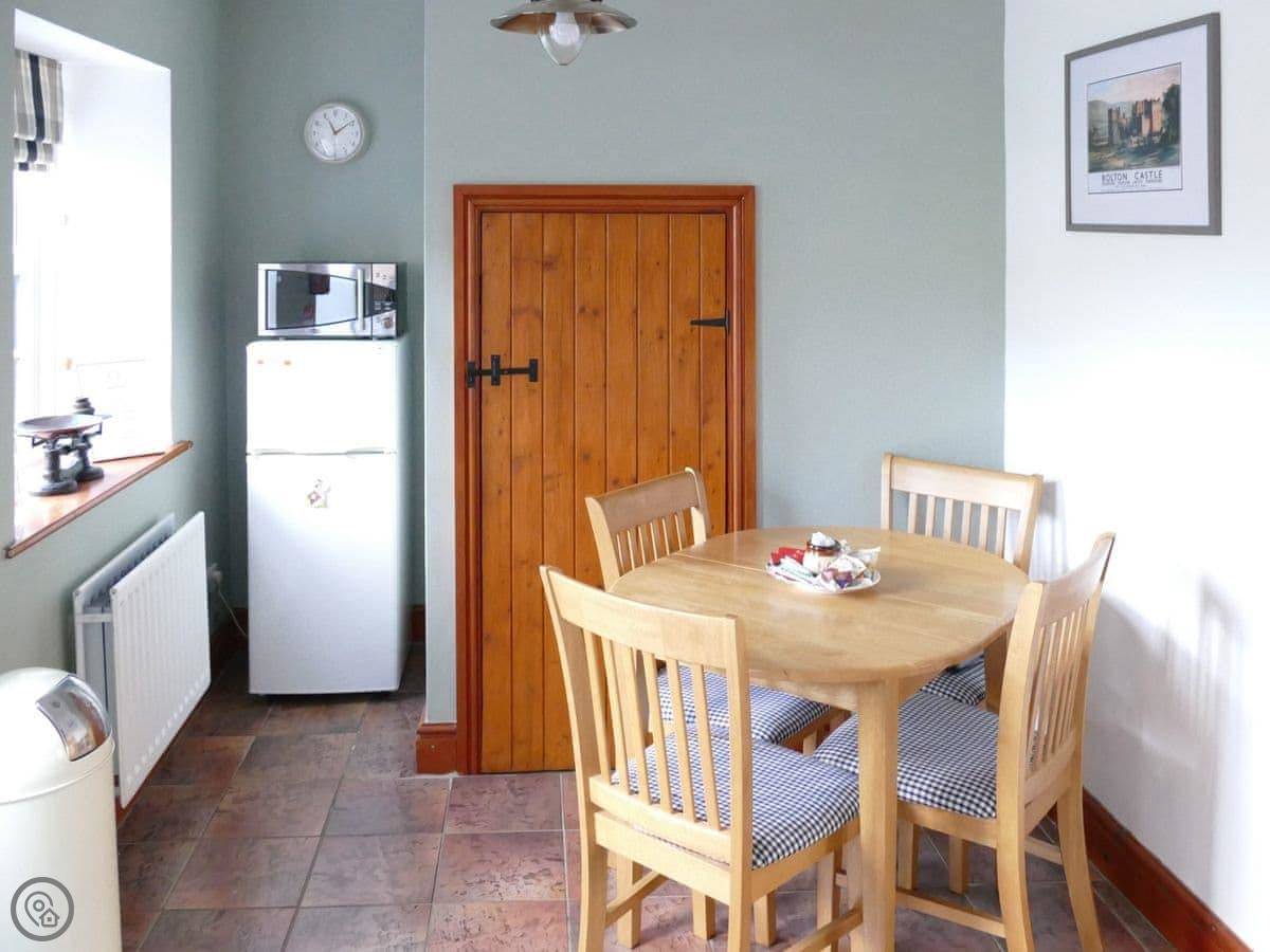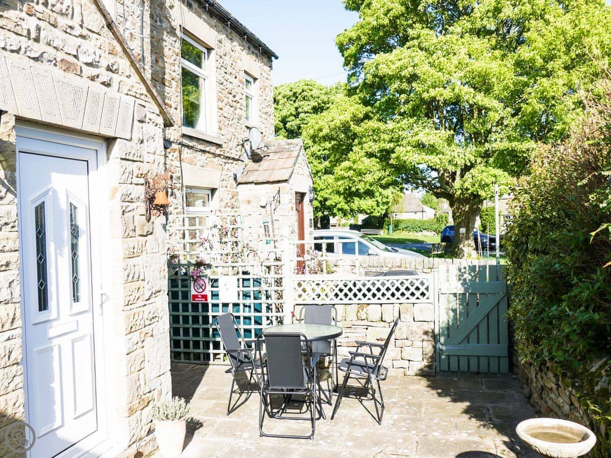Outside, there's an enclosed patio area at the back with a table and chairs. The view looks across to Penhill. You can get to it from inside the cottage, or there's shared access past the neighbour's place.