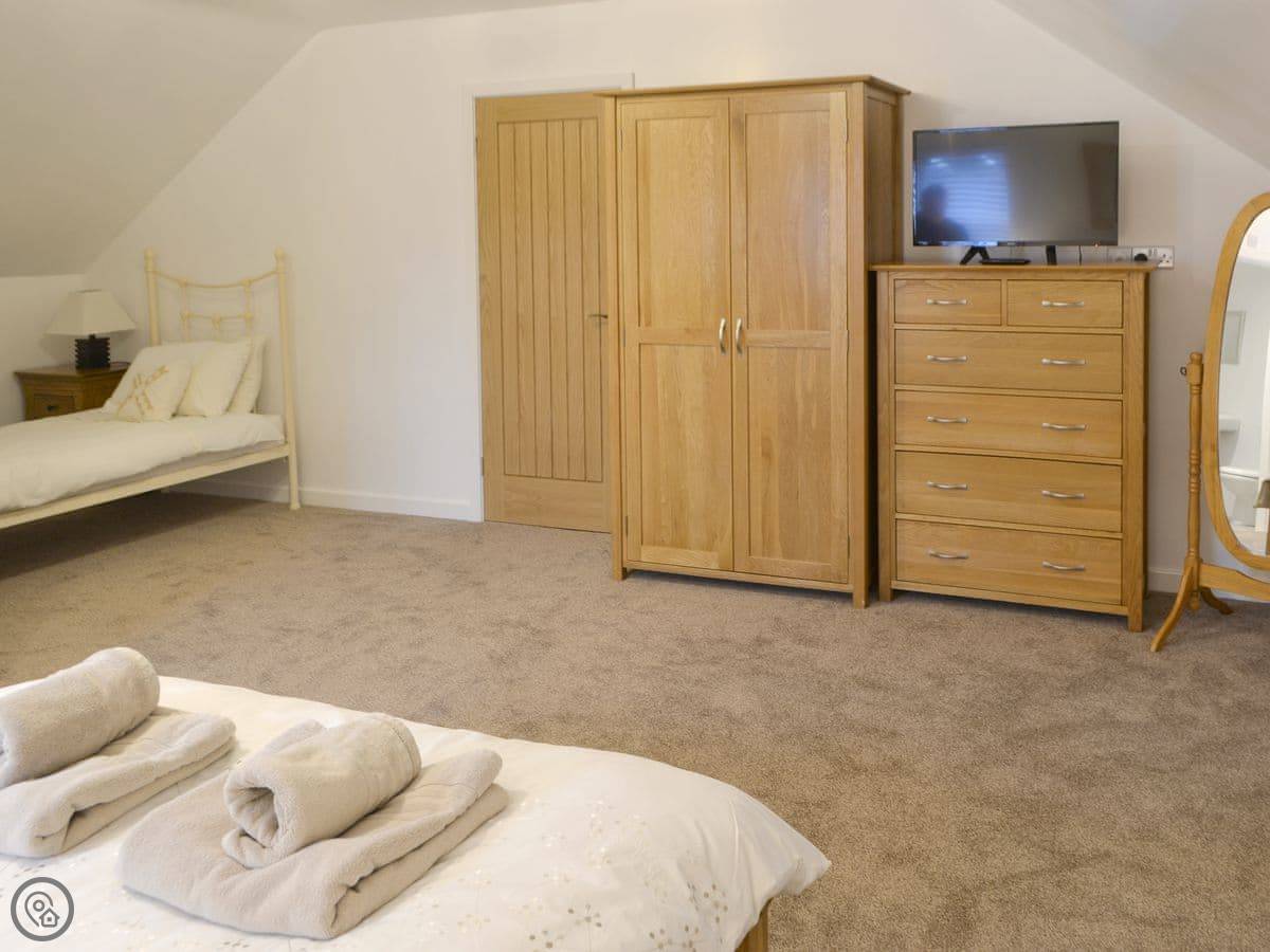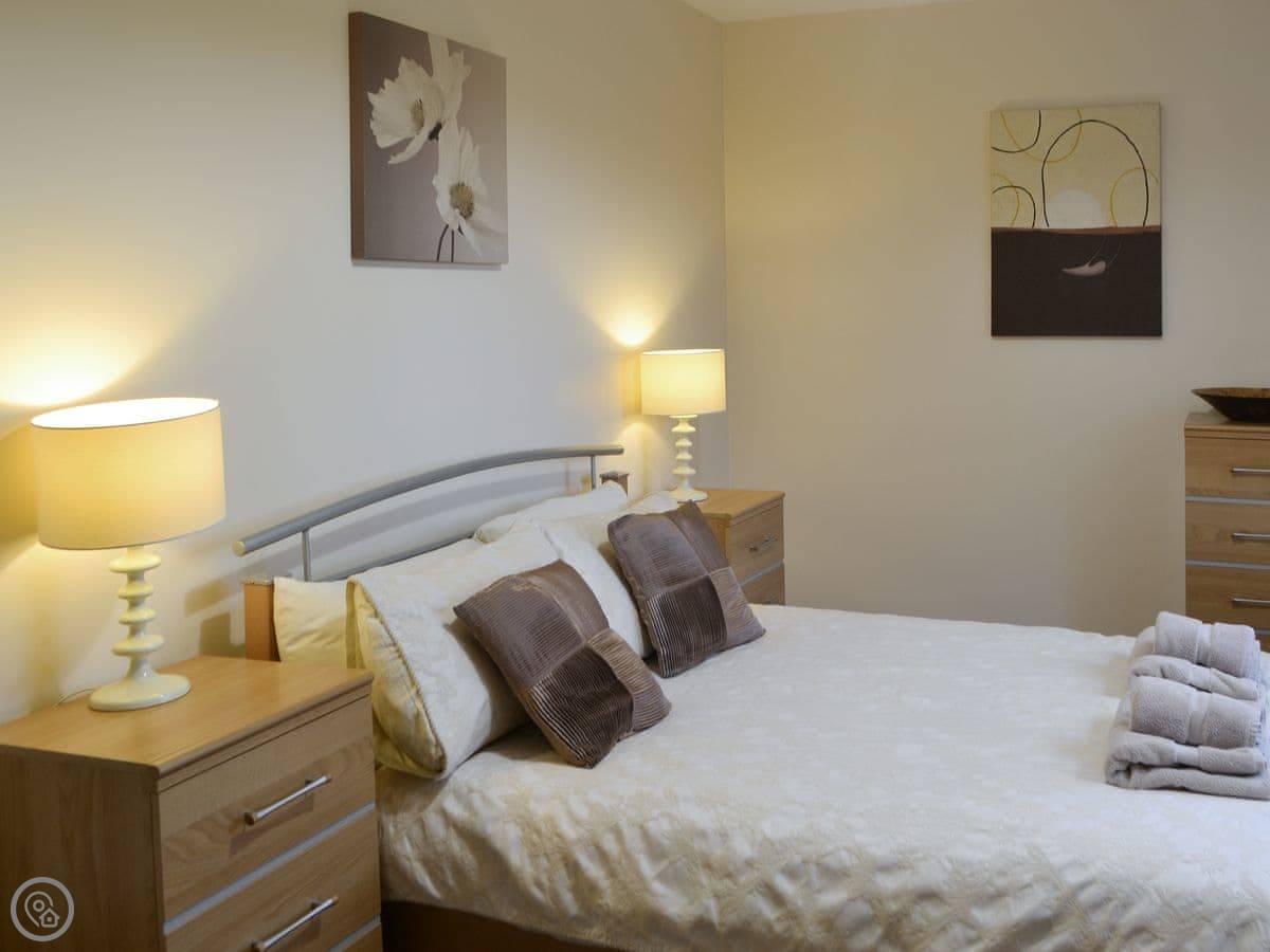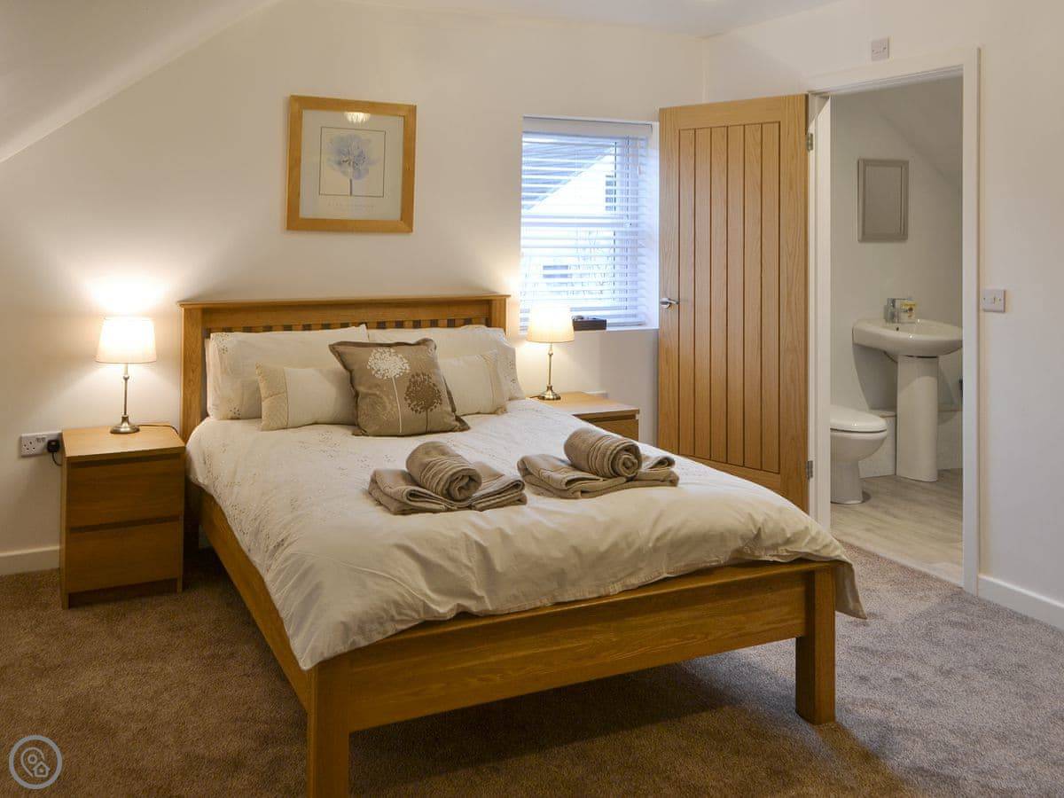 It sleeps eight in four bedrooms. There are three bathrooms, which is handy for a group that size. Two of the bedrooms are on the ground floor. It's a 4 Star place, so it's comfortable and well-equipped. Everything is included, like bedding and towels.