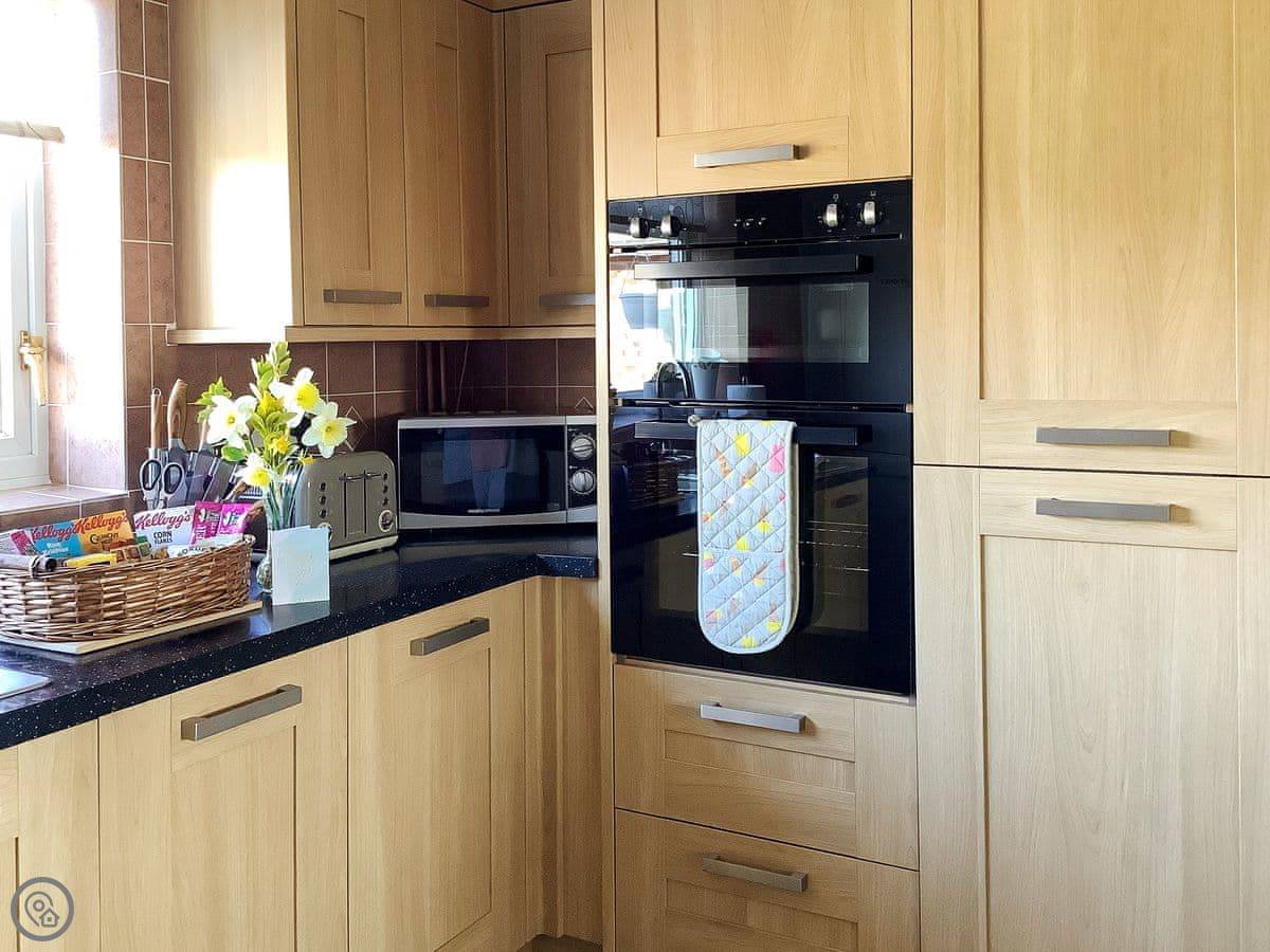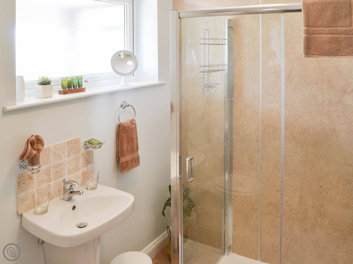It's a bungalow, so everything's on one level. That's good if you don't want stairs. The shower is a walk-in type. The living area is open plan. There's a patio and garden you can use.
