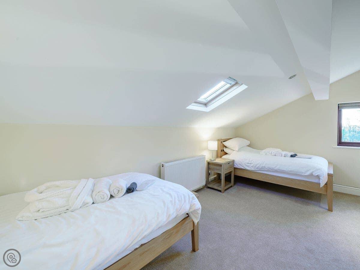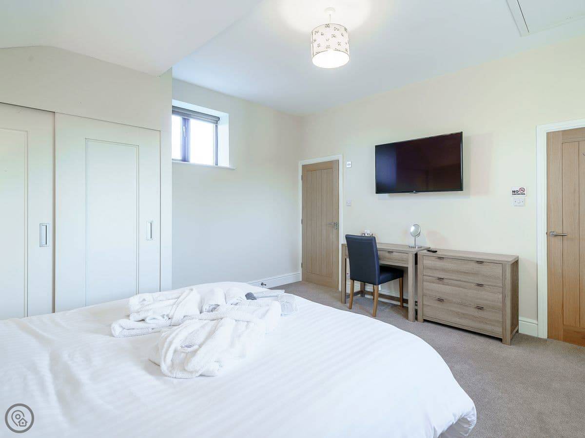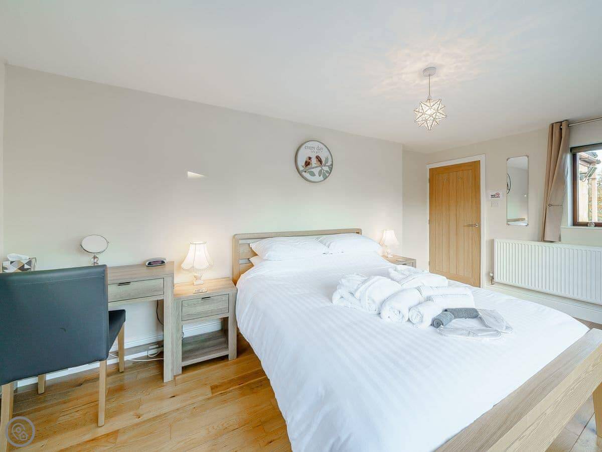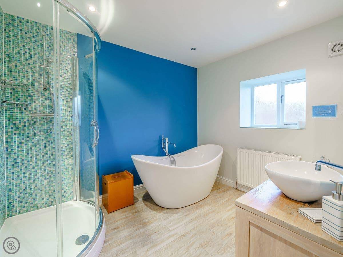 It sleeps eight in four bedrooms. Two of the bedrooms have an en-suite shower each. One of the bedrooms downstairs has big doors that open straight into the garden. There are two bathrooms in total. It's got a 4 Star rating. It's roomy and well-equipped, not luxury, but comfortable.