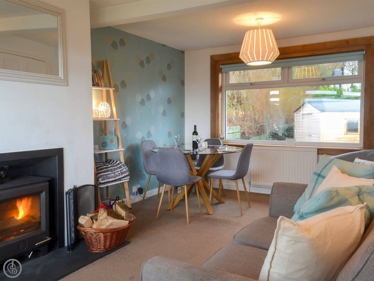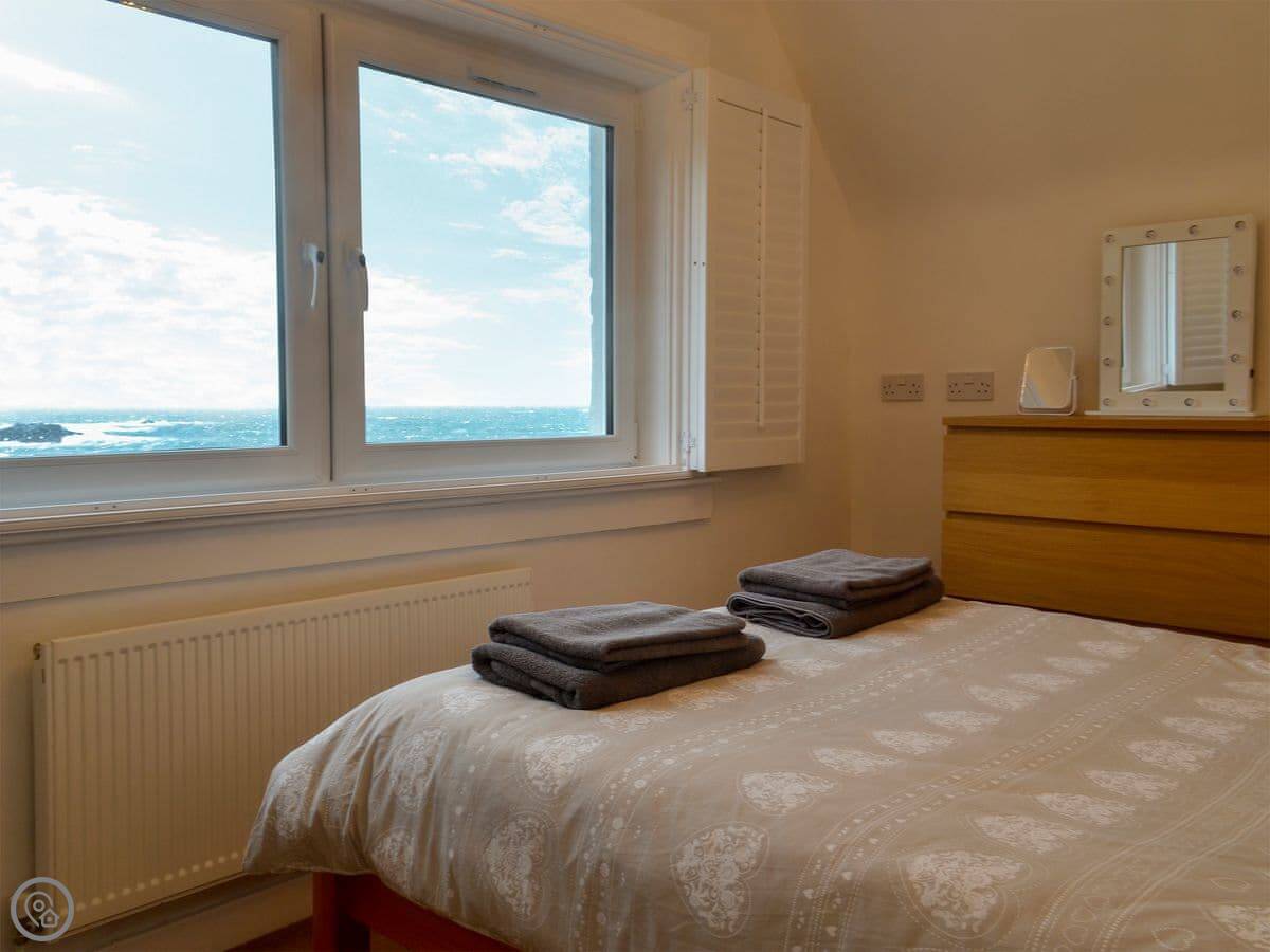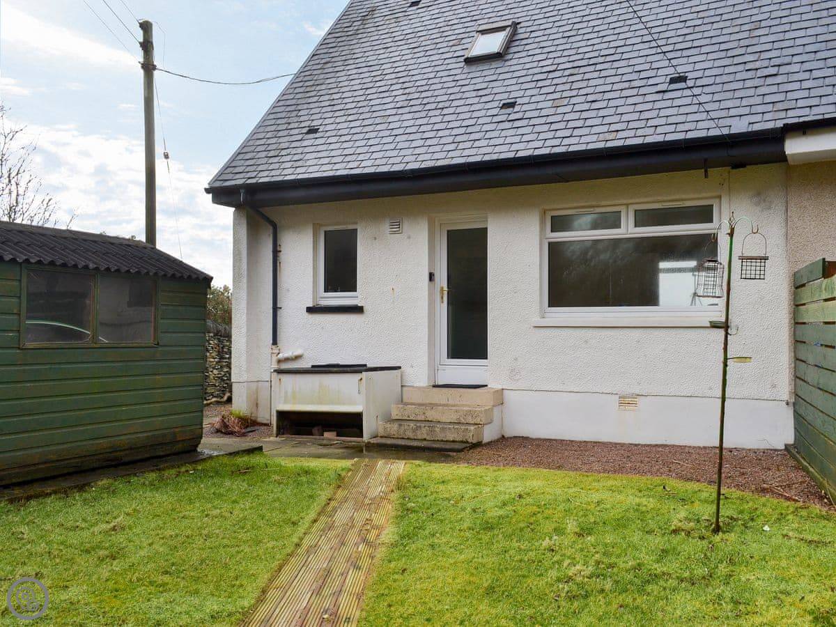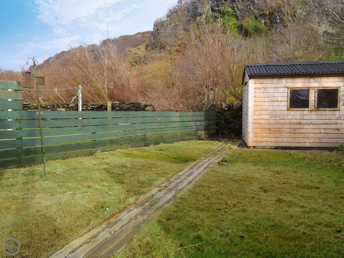 It sleeps four in two bedrooms. There's one bathroom. It's got a 4 Star rating, so it's comfortable and well-equipped. There's a woodburner for cooler evenings. The garden at the back is enclosed, which is good for dogs. You can walk straight from the garden down to the slate beach.