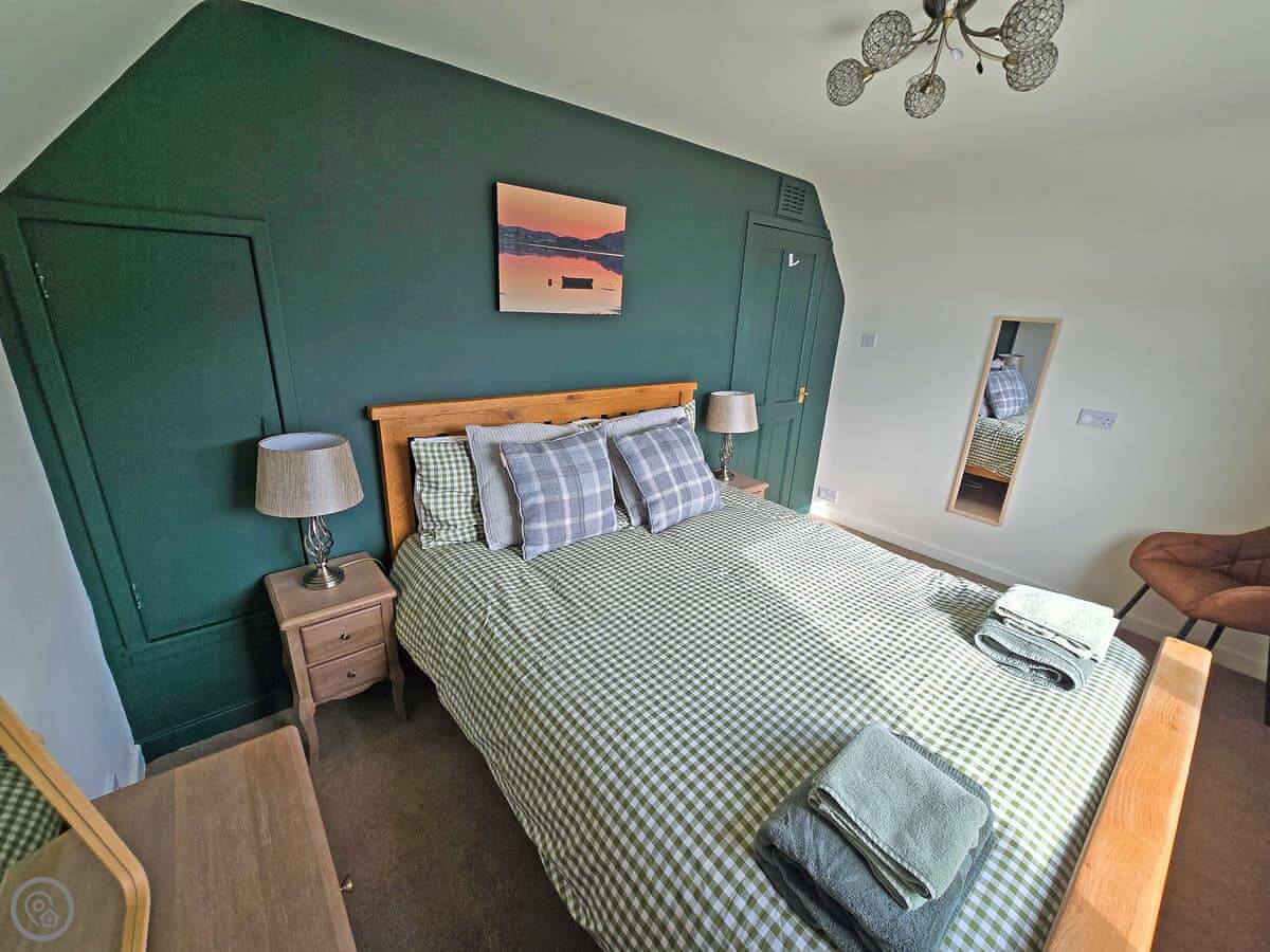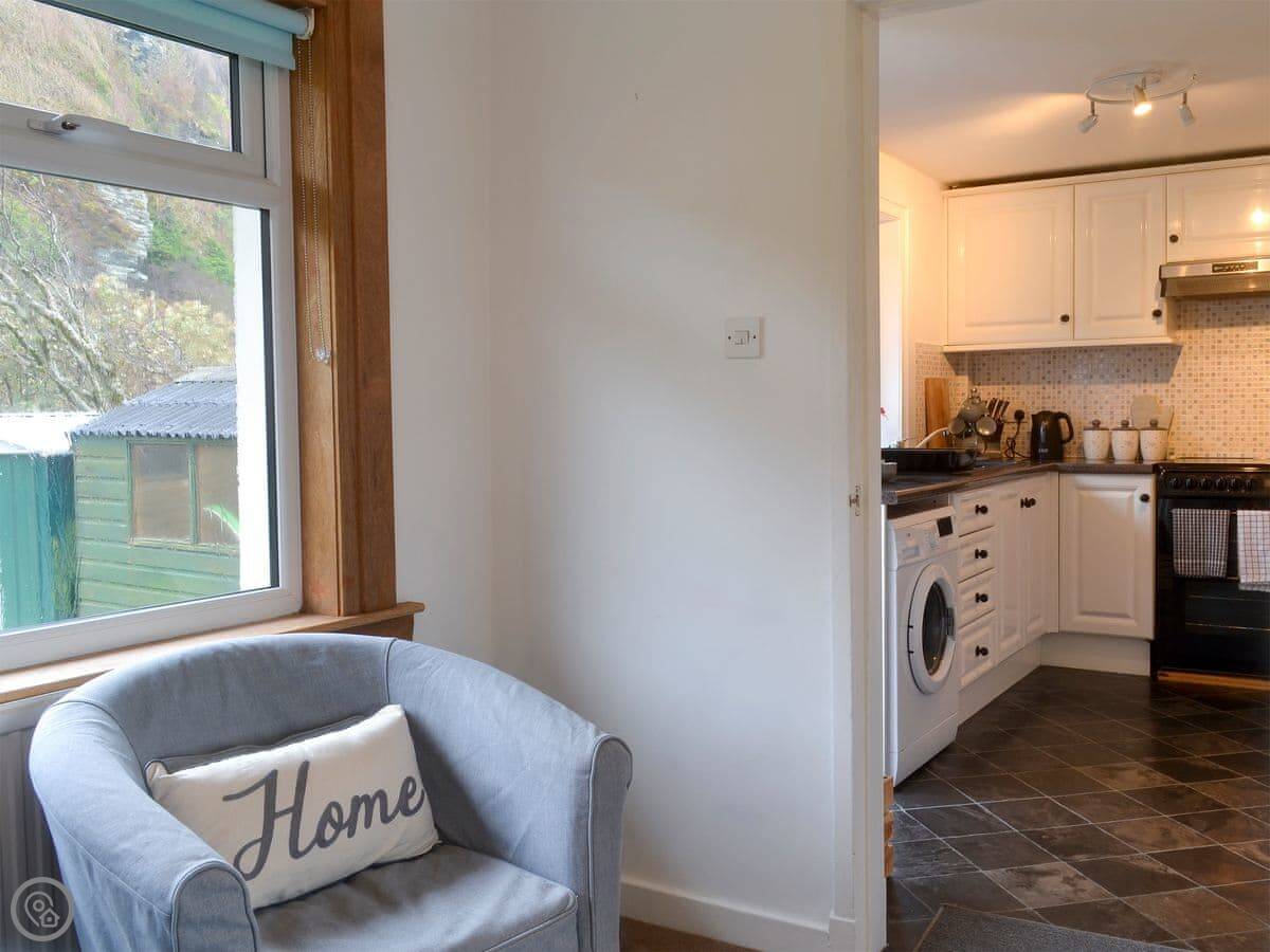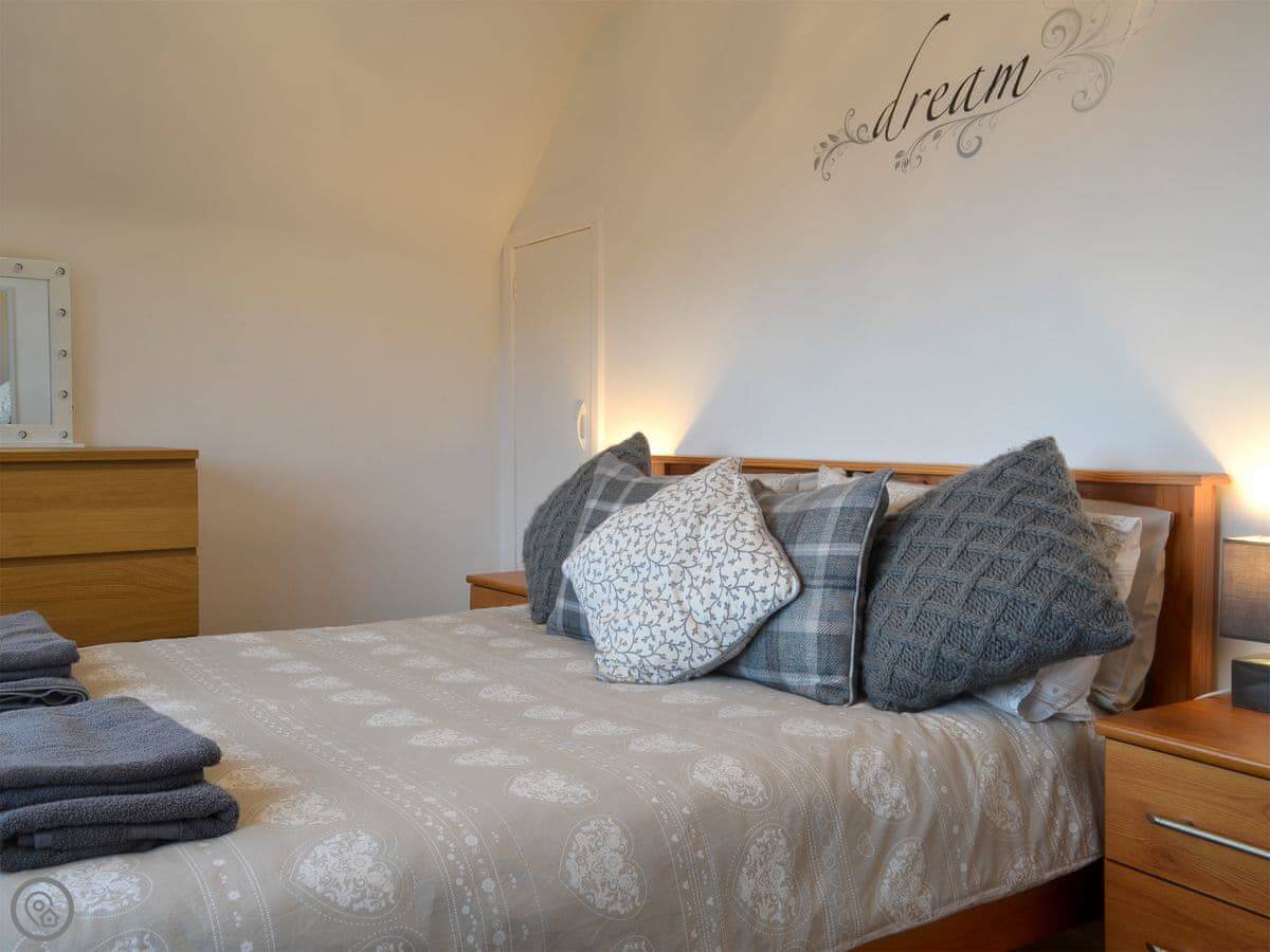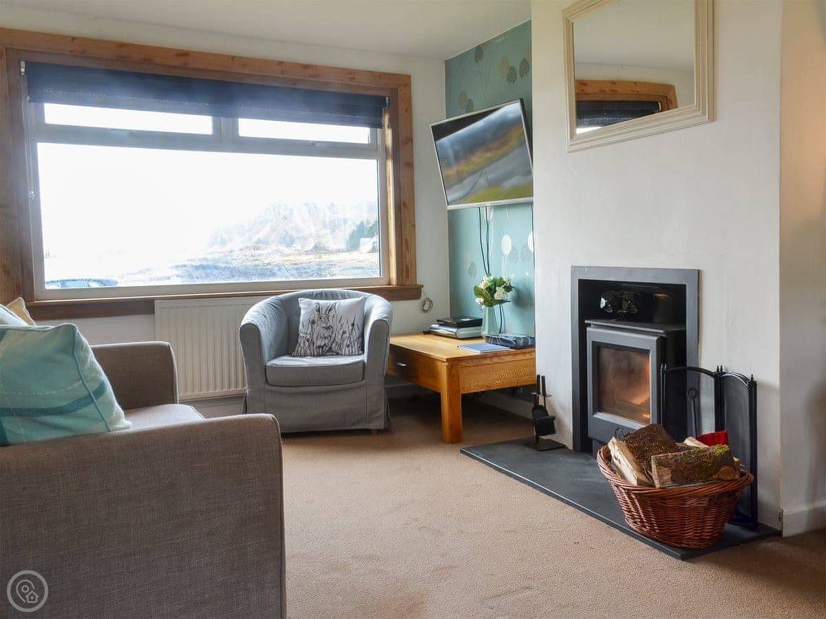 It sleeps four in two bedrooms. There's one bathroom. It's got a 4 Star rating, so it's comfortable and well-equipped. There's a woodburner for cooler evenings. The garden at the back is enclosed, which is good for dogs. You can walk straight from the garden down to the slate beach.