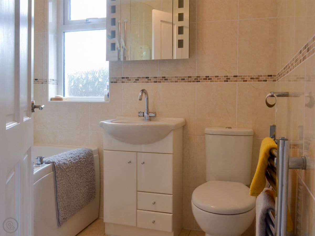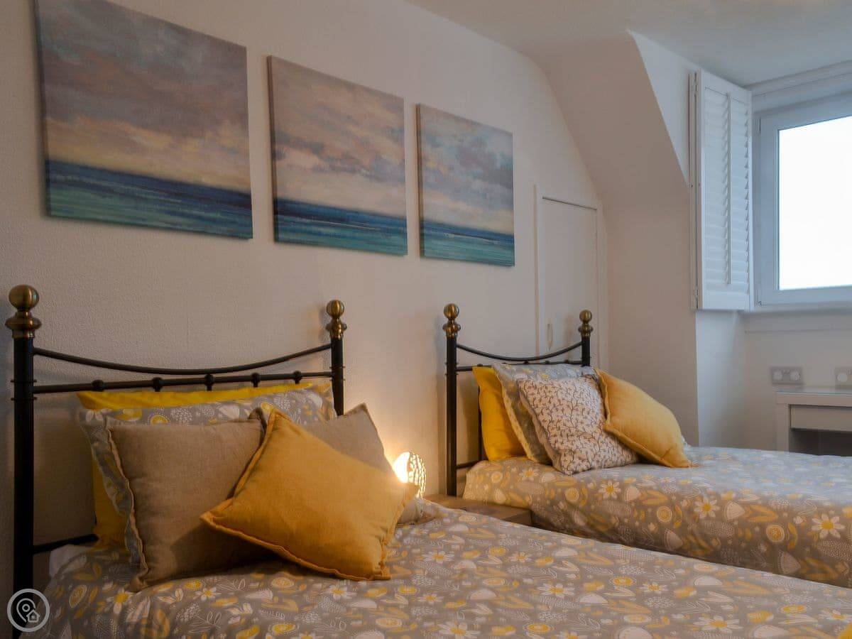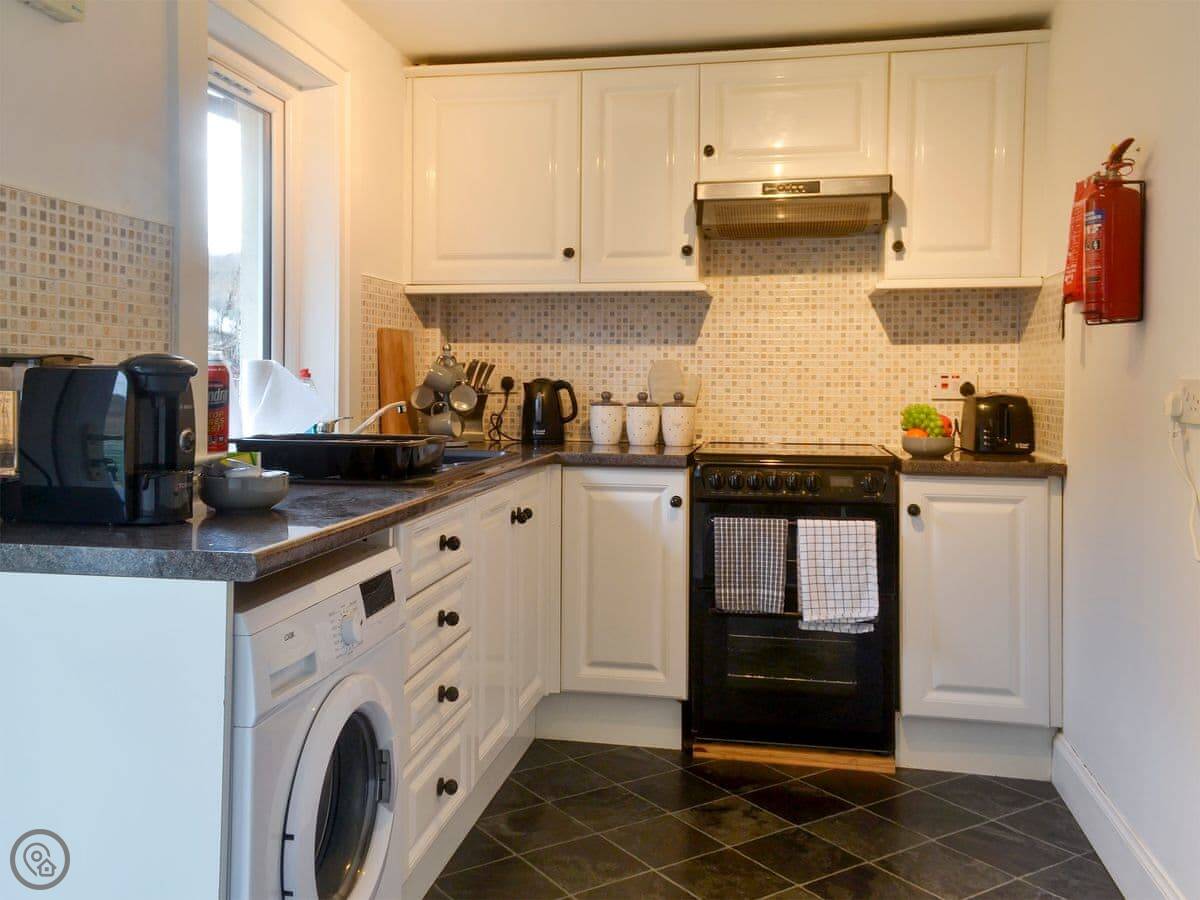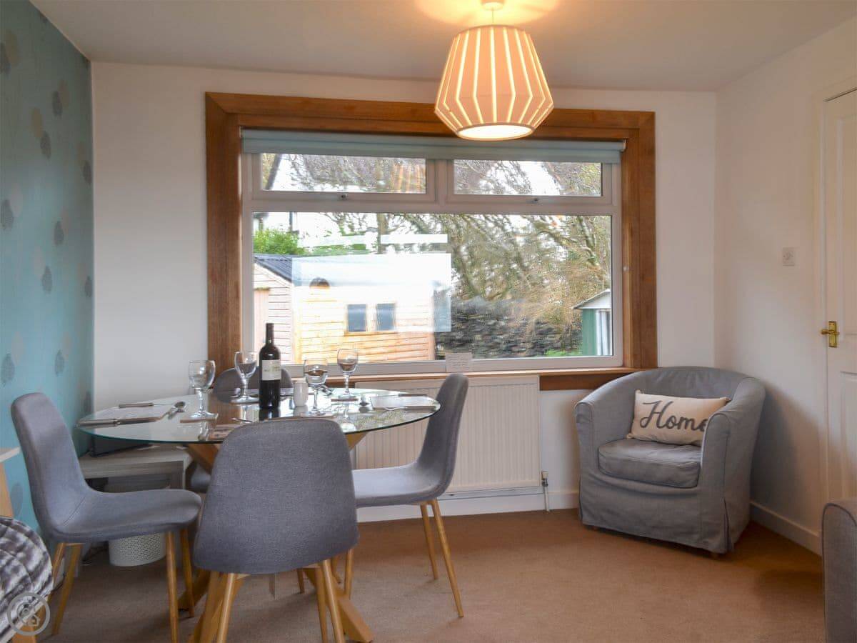 It sleeps four in two bedrooms. There's one bathroom. It's got a 4 Star rating, so it's comfortable and well-equipped. There's a woodburner for cooler evenings. The garden at the back is enclosed, which is good for dogs. You can walk straight from the garden down to the slate beach.