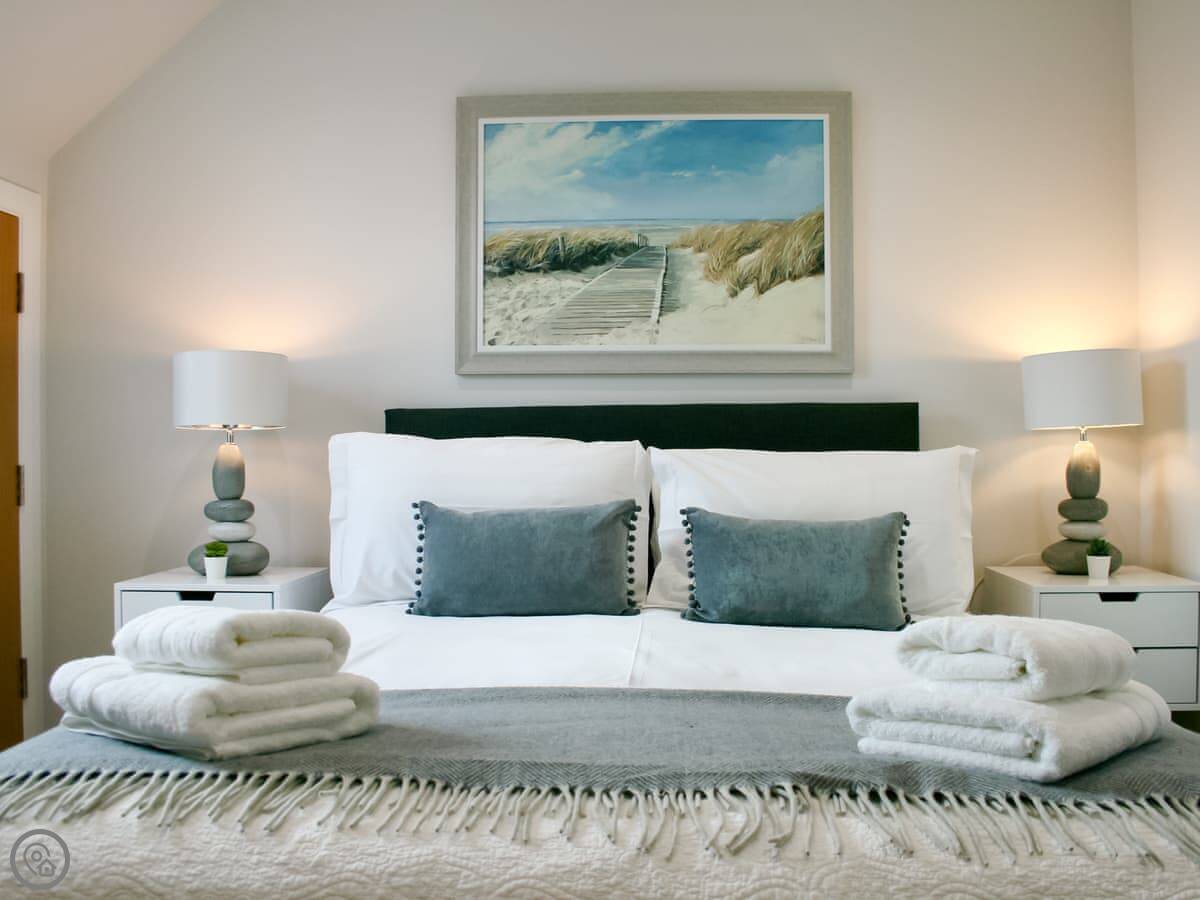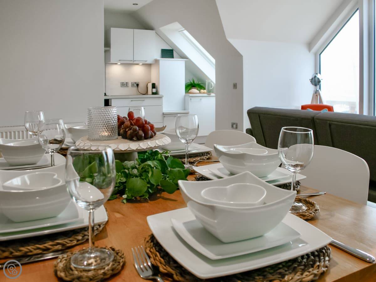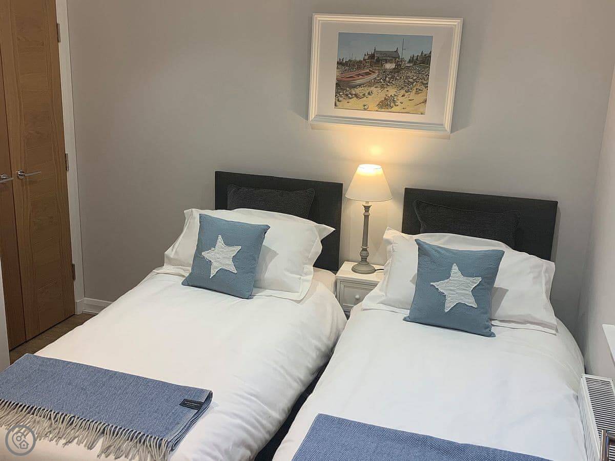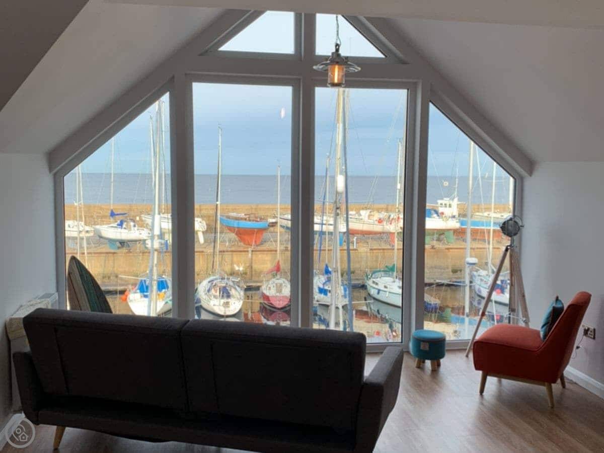Spinnaker is a reverse plan, luxury, two bedroom apartment, with a large gabled window offering uninterrupted views over the marina and the Moray Firth beyond. The property offers very spacious contemporary living for four guests. On the ground floor is an immaculate twin bedroom and on the first floor is a spectacular open plan living space which takes full advantage of the huge picture window over the coast. There are binoculars, a tide clock and information for dolphin watching as the dolphins are often visible from the window. The dining area features a large oak table with seating for 9, along with high quality white crockery for 8 guests. In addition, there is a double bedroom with a Jack and Jill shower room. Externally, there is private parking for one vehicle, however there is plenty of on road parking.