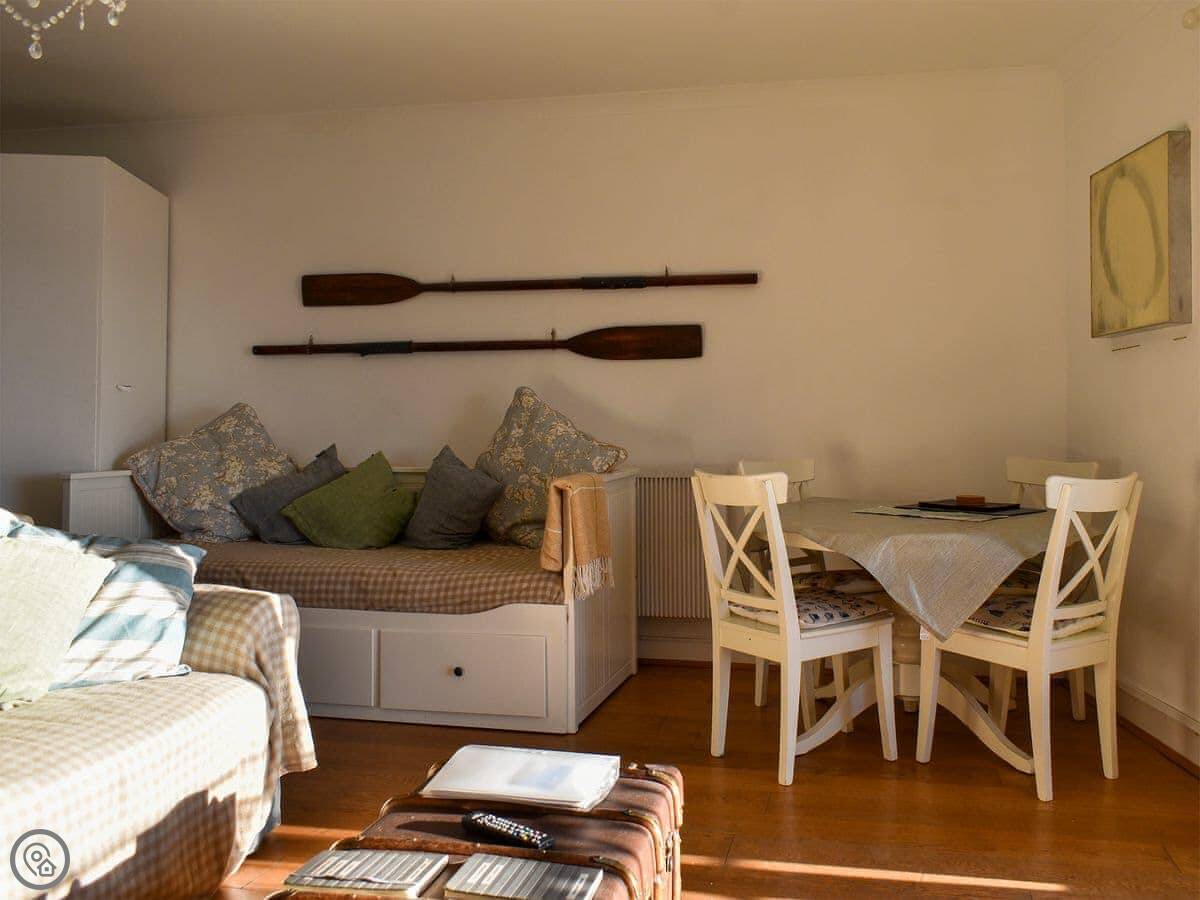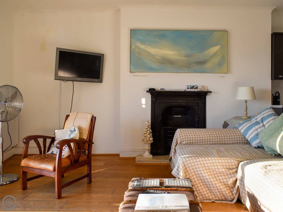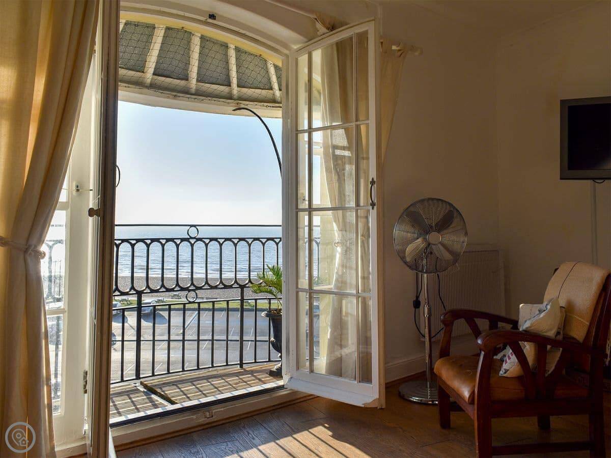 The main thing about it is the view. The living room faces south over the sea. There are french doors that open onto a small balcony, so you get the sound of the waves and the sea air. Inside, it's clean and modern, but it's got some of the old features like the fireplace. It's open plan, which means it's one big space for the living, dining, and kitchen areas. The dining table extends to seat six.