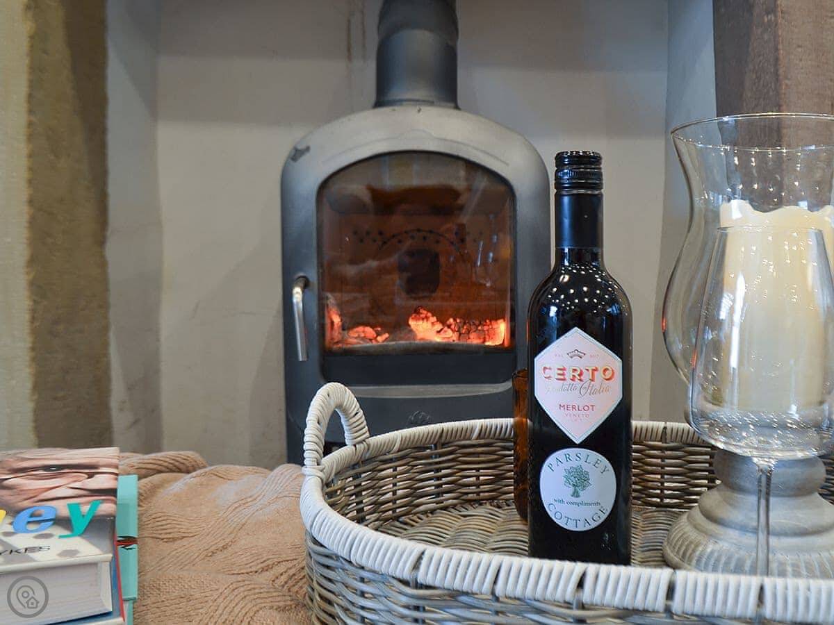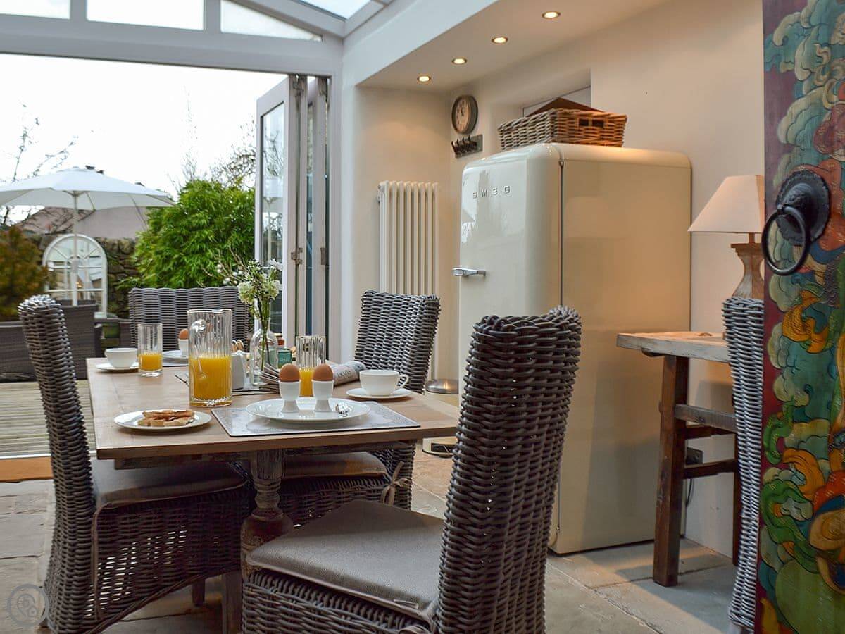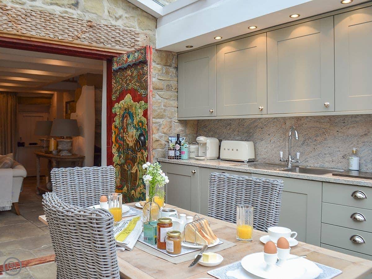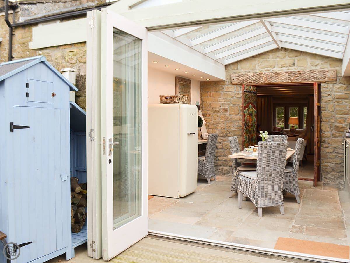 Dating back to the 1700s, Parsley Cottage is a beautiful stone built terraced cottage, complete with original mullion windows and full of charm. Perfect for couples looking to escape the hustle and bustle of life, the quirky interior has been dressed with wonderful furnishings, enhancing the traditional features such as the insulated stone flag flooring and beamed ceiling. You’ll find a wood burner in the cosy living room, perfect for that extra touch of warmth in the chillier winter months. Antique, Tibetan double doors lead to the kitchen/dining room, and during the long summer days you can really bring the outside in. There are bi-folding doors that open out from the kitchen/dining room onto a decked area, with a step down to tha further outside dining area with table, four chairs and a large parasol.