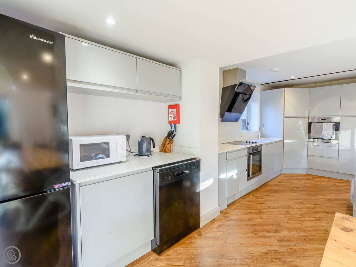 Inside, it's open plan in places. The stairs are typical for an old building, so they're a bit uneven. There's a walk-in shower and the entrance is wheelchair accessible. It has all the things you'd expect, like a dishwasher, Wi-Fi, and a TV. Bedding and towels are included.