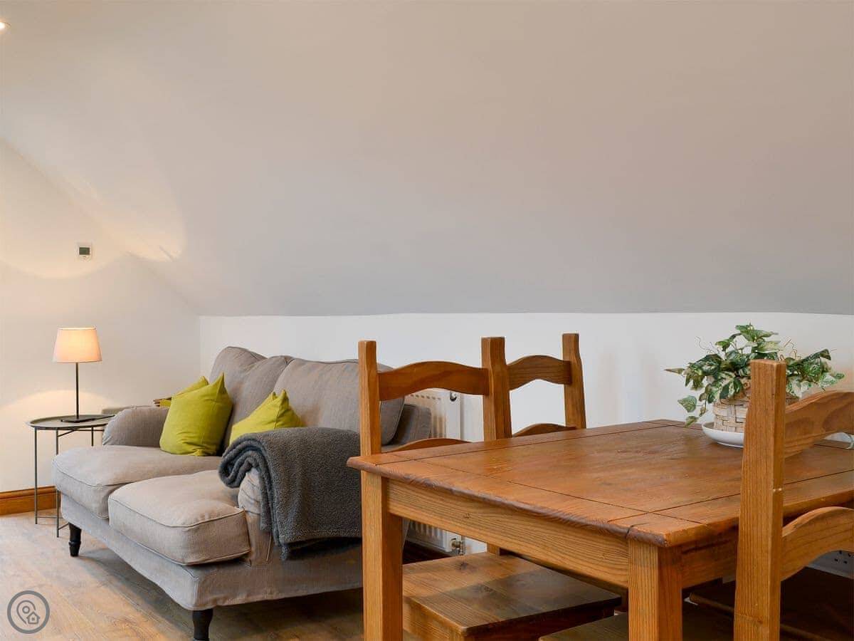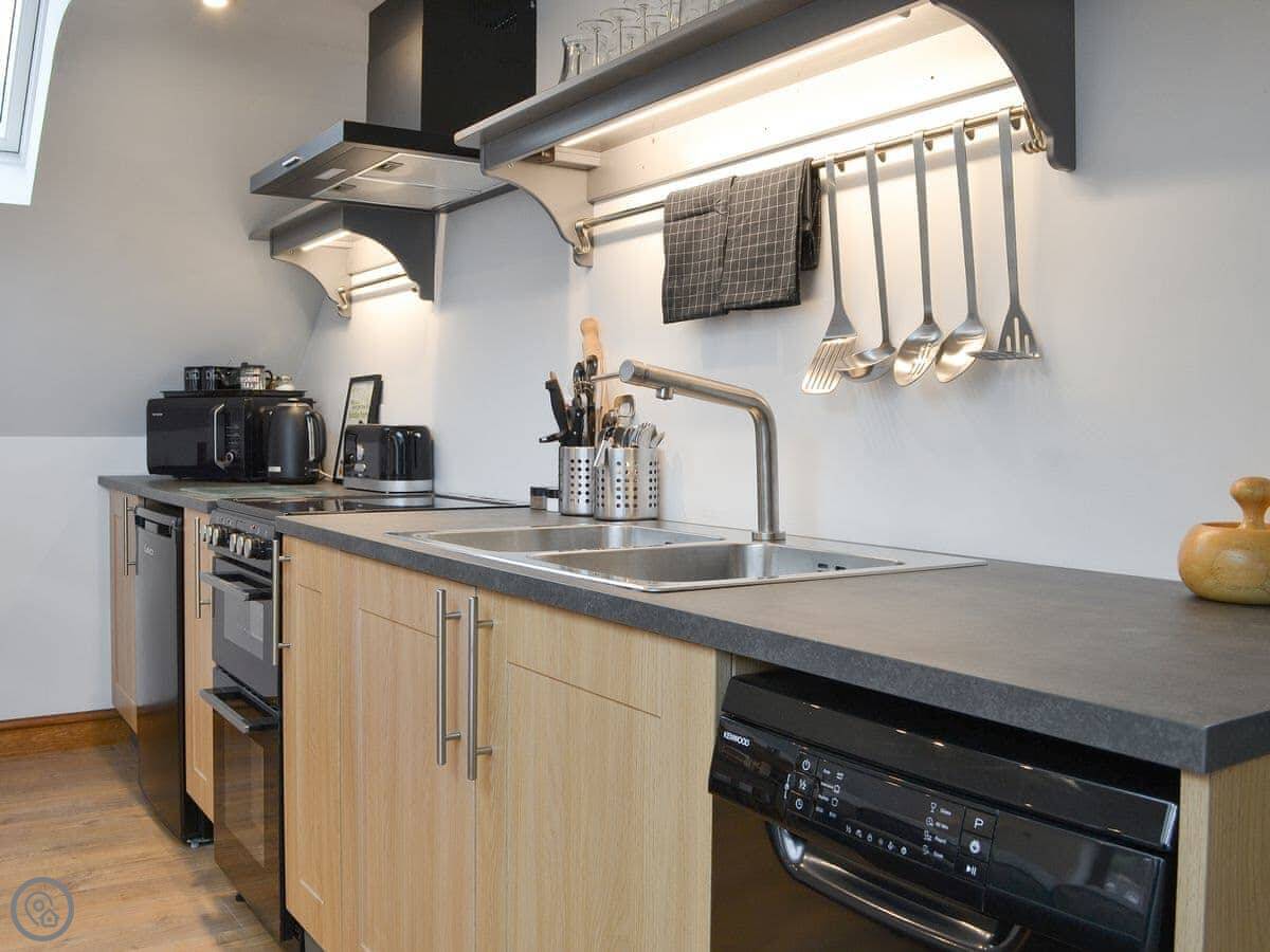 The main living space is upstairs. That was to get the views. You get the kitchen, dining table, and sofa all in one room. The kitchen has a dishwasher.