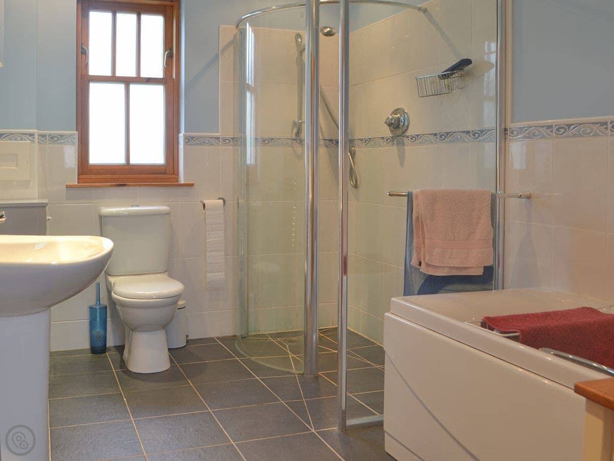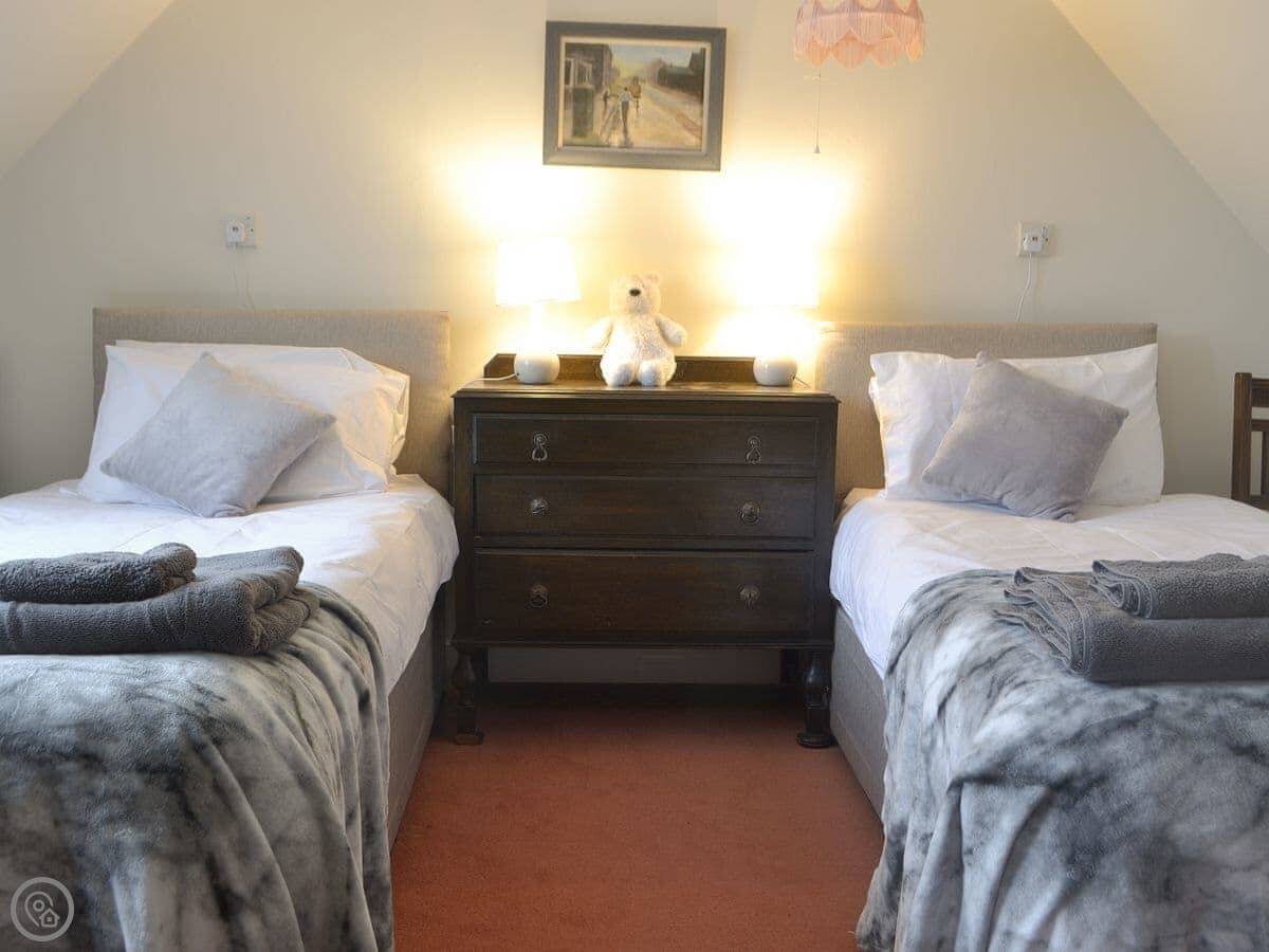 It sleeps six. Three bedrooms, one bathroom. It's got a 4 Star rating. There's a king size bedroom on the ground floor. Upstairs, there's a room with a super king bed that can be made into twins, and another with twin beds. The bathroom has both a walk-in shower and a separate bath. There's a separate toilet too.