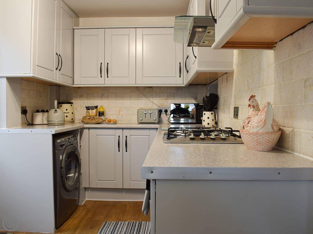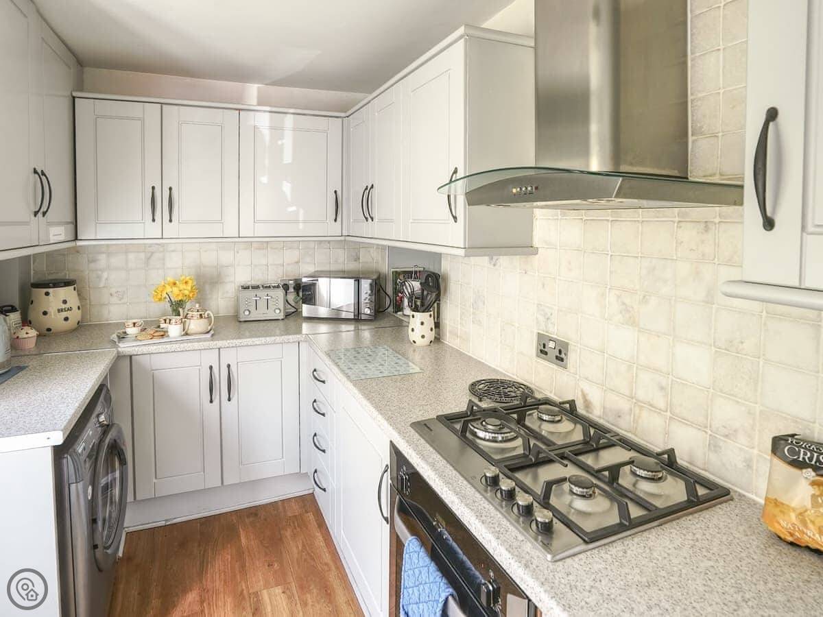 You come in through the back door into the kitchen. It's got what you need. The living room is a good size, with a gas fire that looks like a wood burner. The back garden is a quiet spot to sit, and there's lockable storage for bikes.