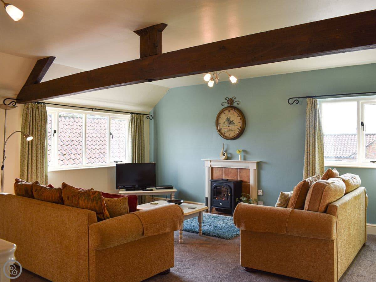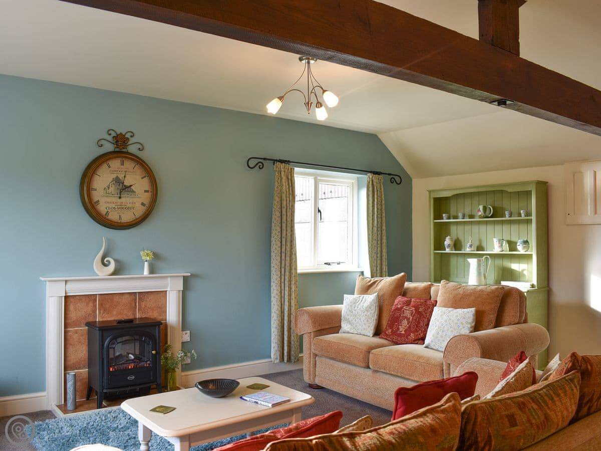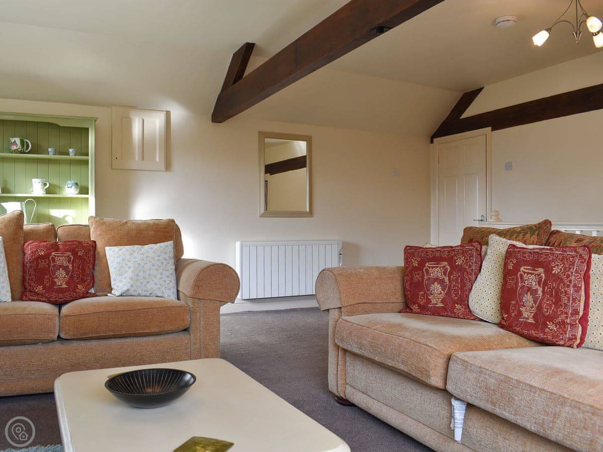 Millers Cottage is upside down and is perfect for couples or a small family. A pretty living area looks out across open countryside and features beams and a cosy electric wood burner, comfortable sofas and plenty of space to relax. The well-equipped kitchen/dining area is ready to rustle up a hearty breakfast or warming supper. Downstairs are two spacious and comfortable bedrooms, one with a kingsize bed, the other with twin beds and a third bed, which can be made up on request to make a family room.