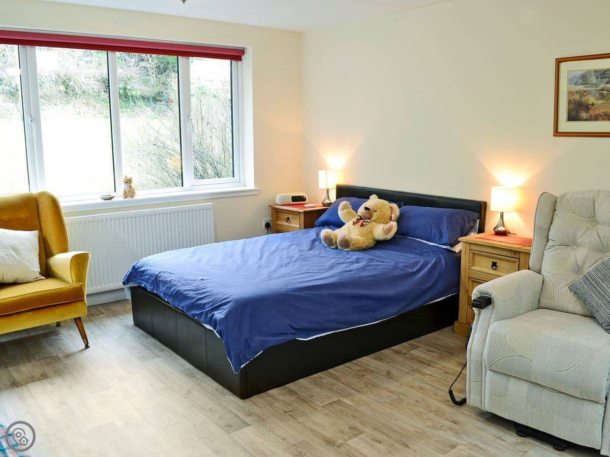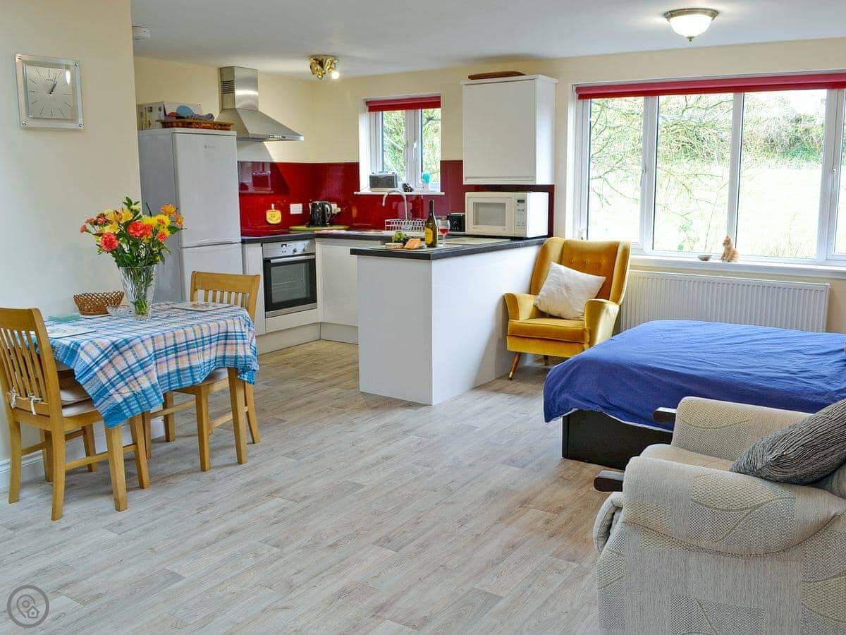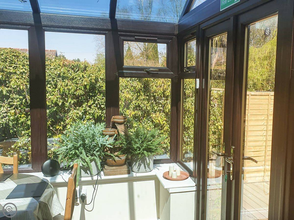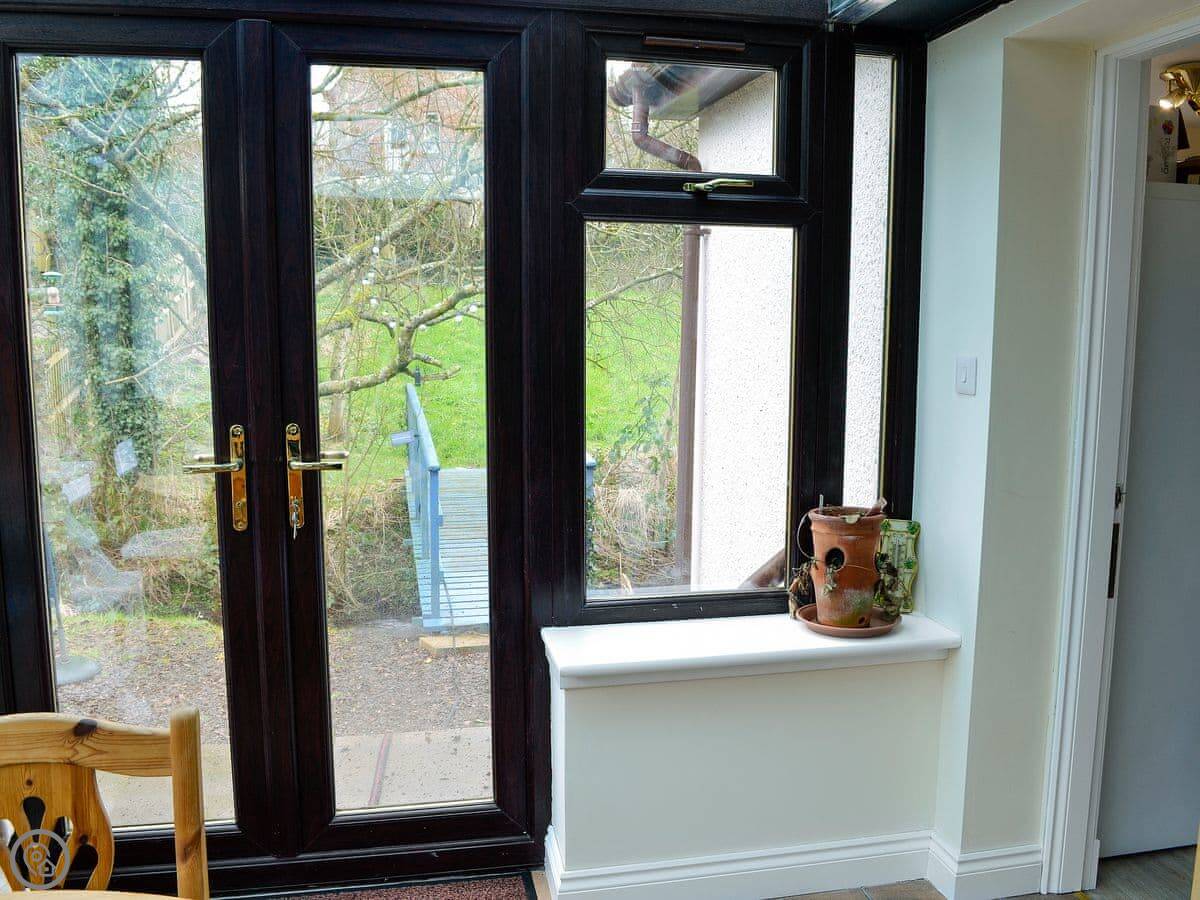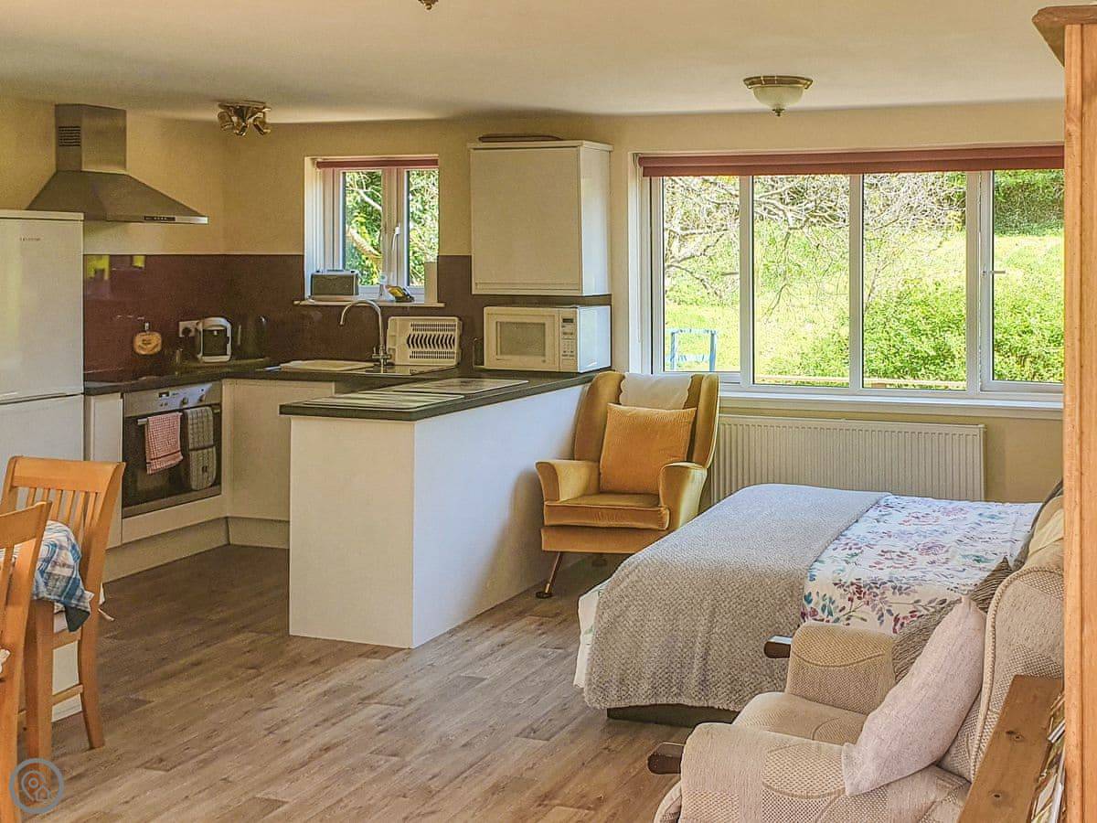 The main room is a big open space with your kitchen, a sitting area and the bed. There's a large picture window looking out onto the garden, and a stream runs right past it. The conservatory is the best bit, in my opinion. The doors open straight out, it's a nice spot to sit.