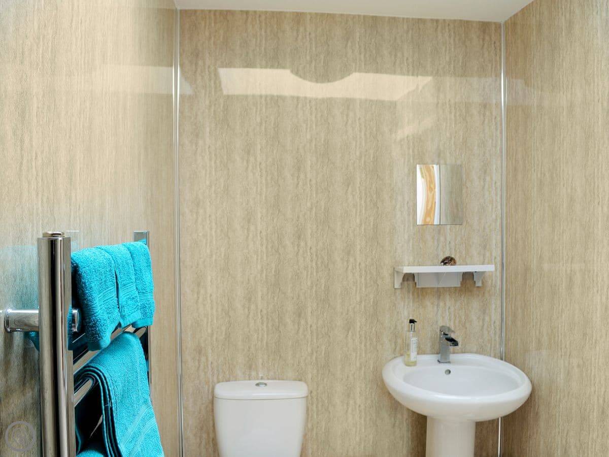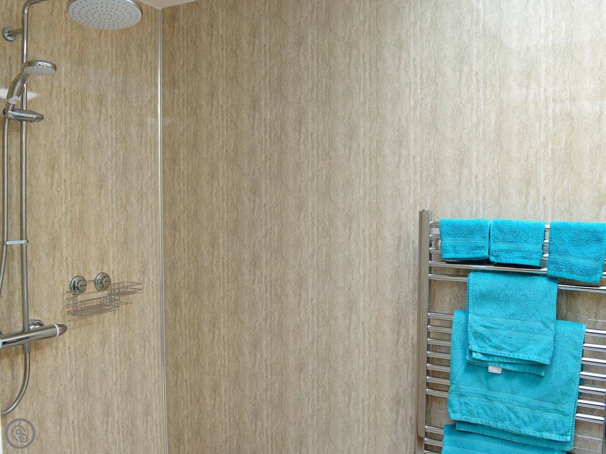 It's all on the ground floor. The bathroom is a walk-in wet room, which is quite spacious. Everything is wheelchair accessible.