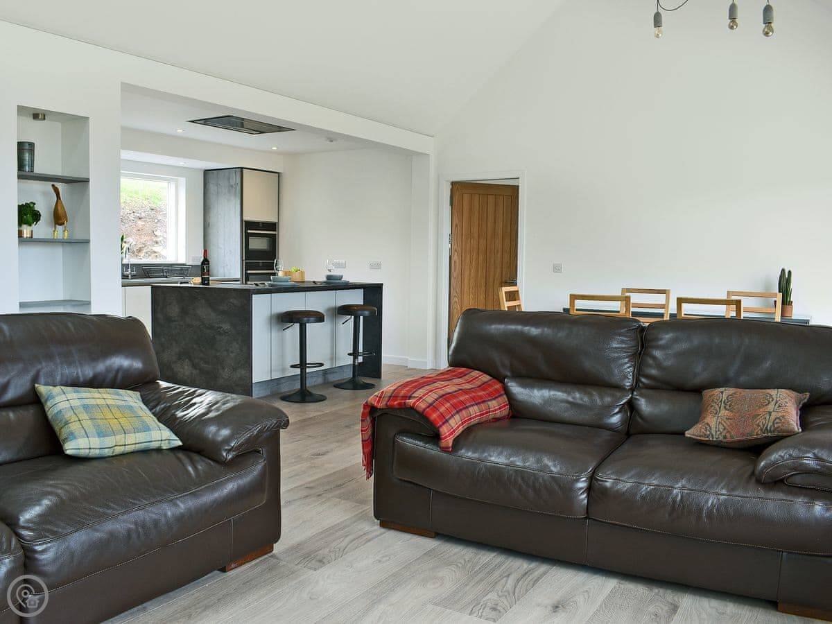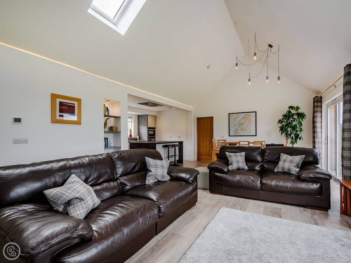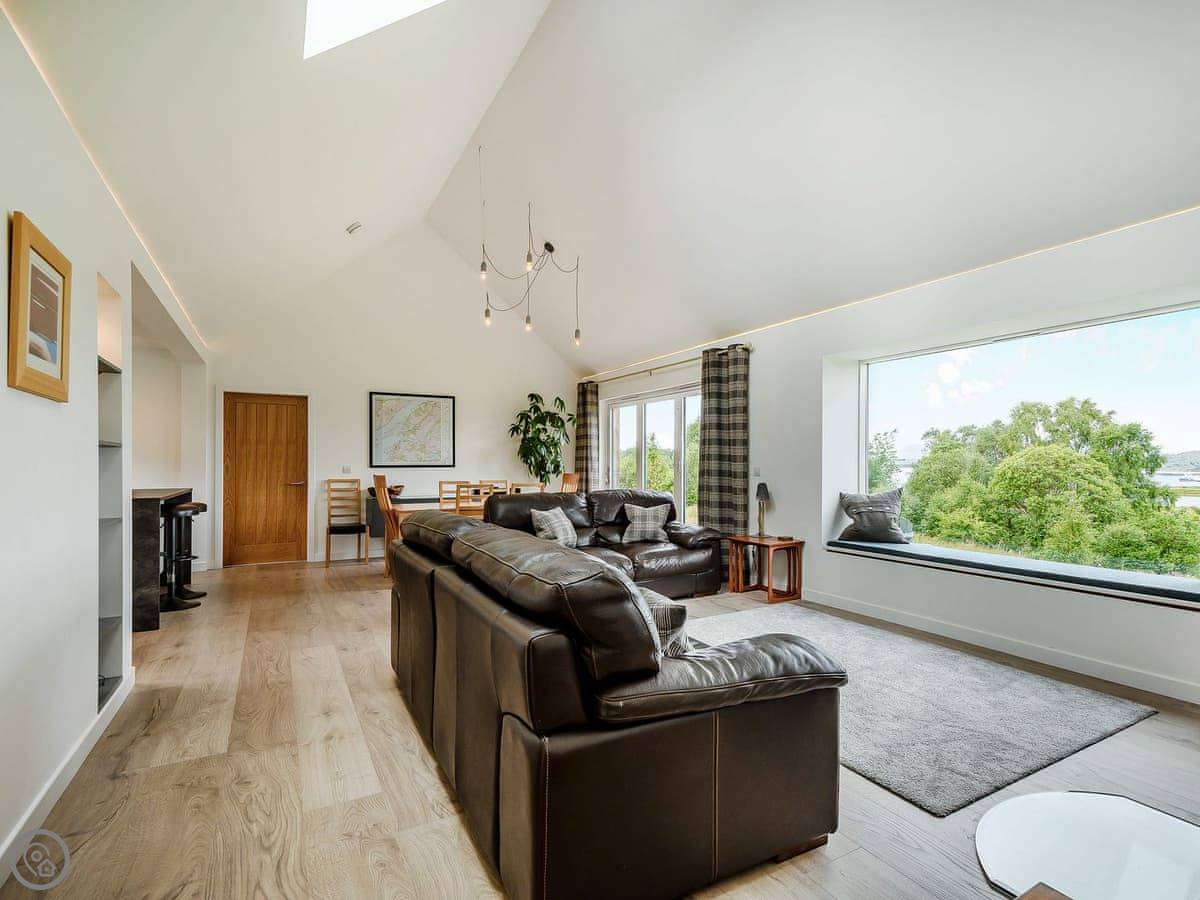 The main living area is open plan. Big windows so you can see the water. There's a wood burner for cooler evenings. Doors open out onto a deck at the front. You can sit out there.