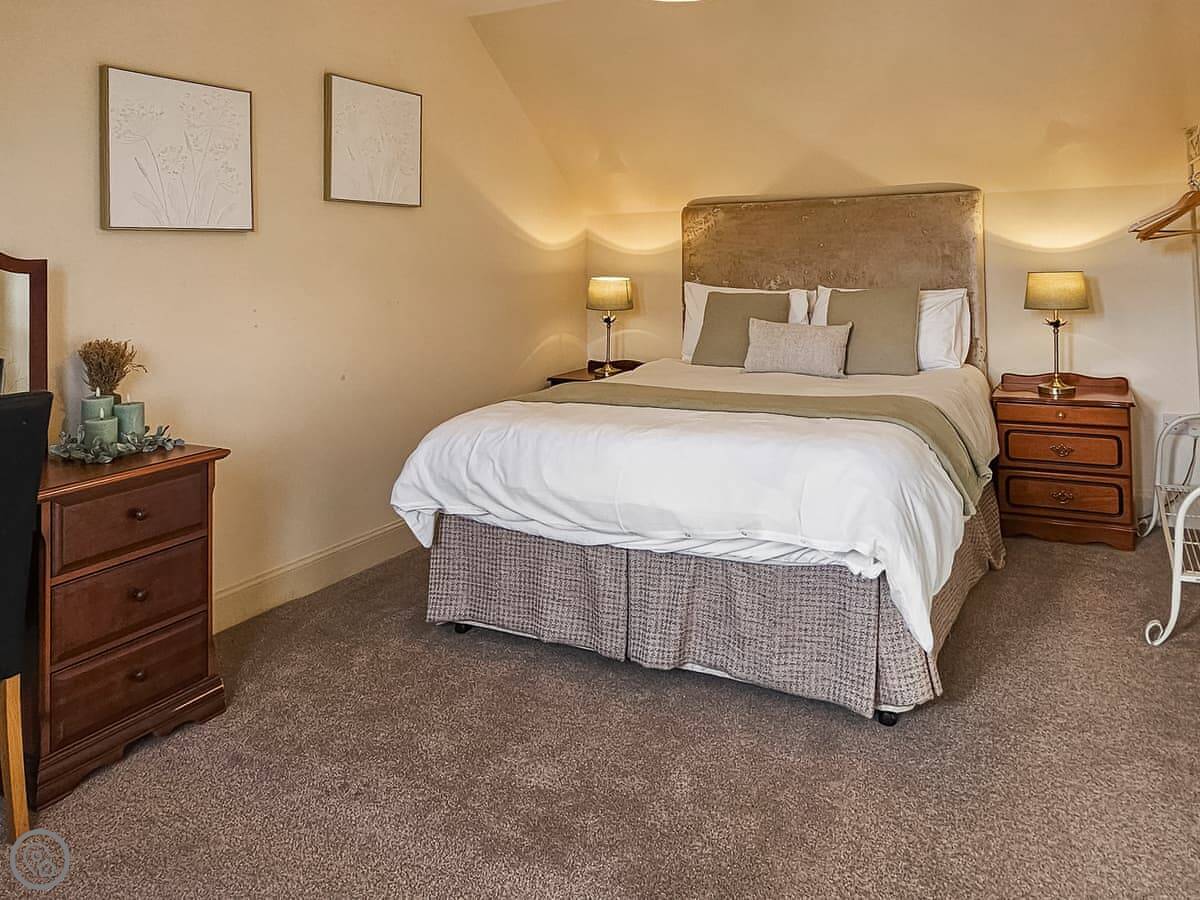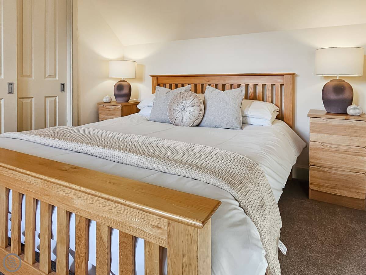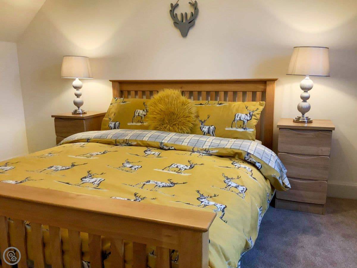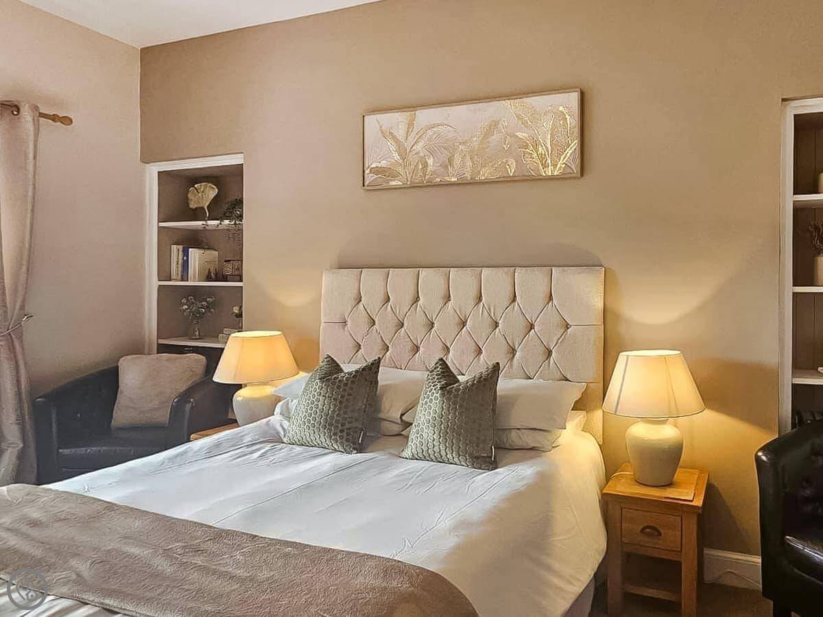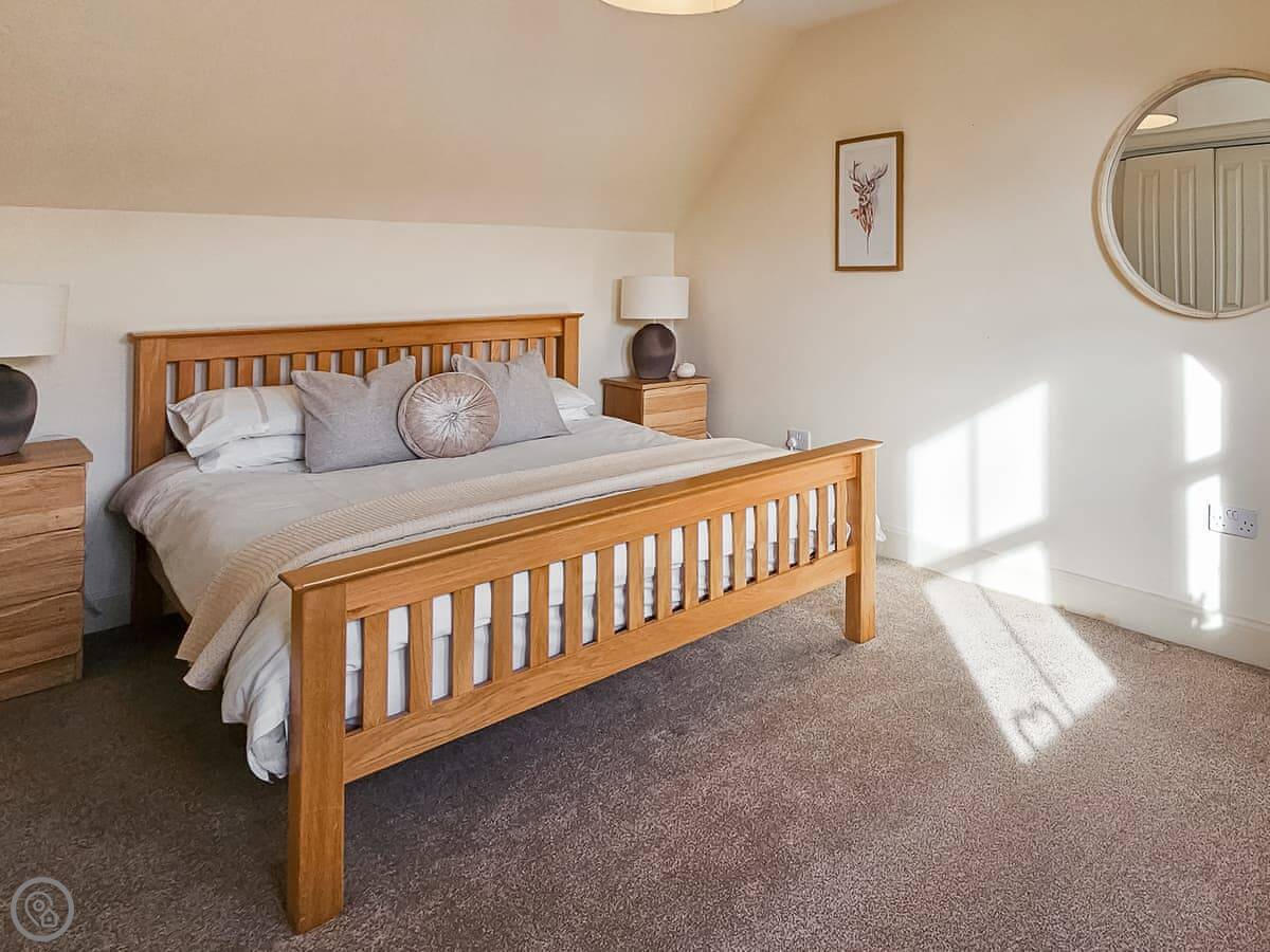 It sleeps seven. Four bedrooms, two bathrooms. One of the bedrooms is downstairs. That's a kingsize with its own shower room off the hallway. Upstairs, there are two more kingsize rooms and a single. The family bathroom is up there too. It's got a 5 Star rating, so it's comfortable and well looked after.