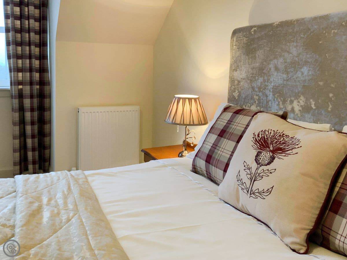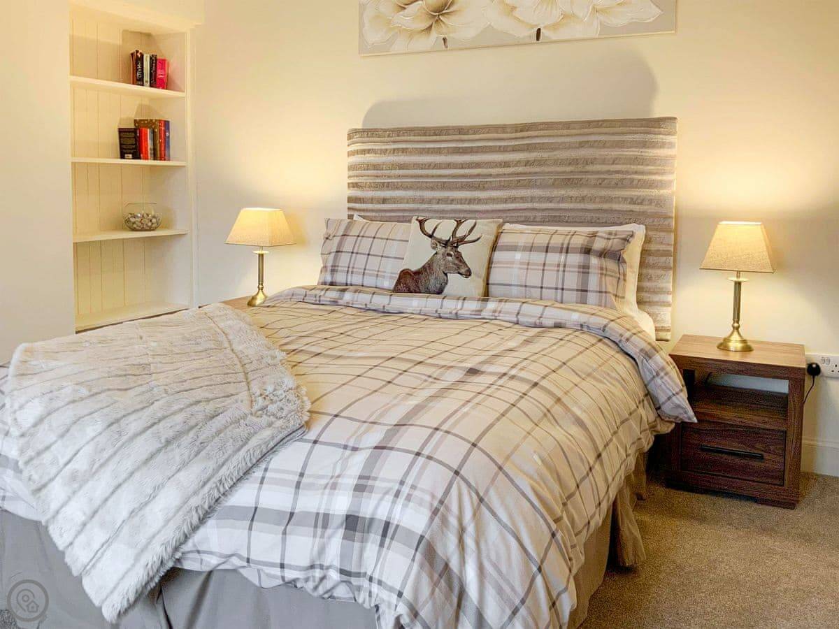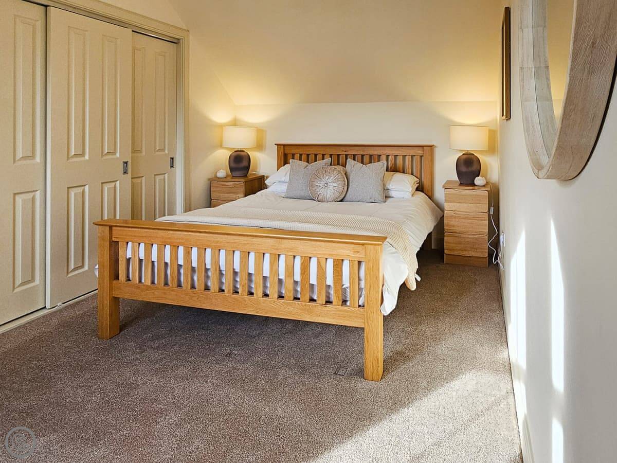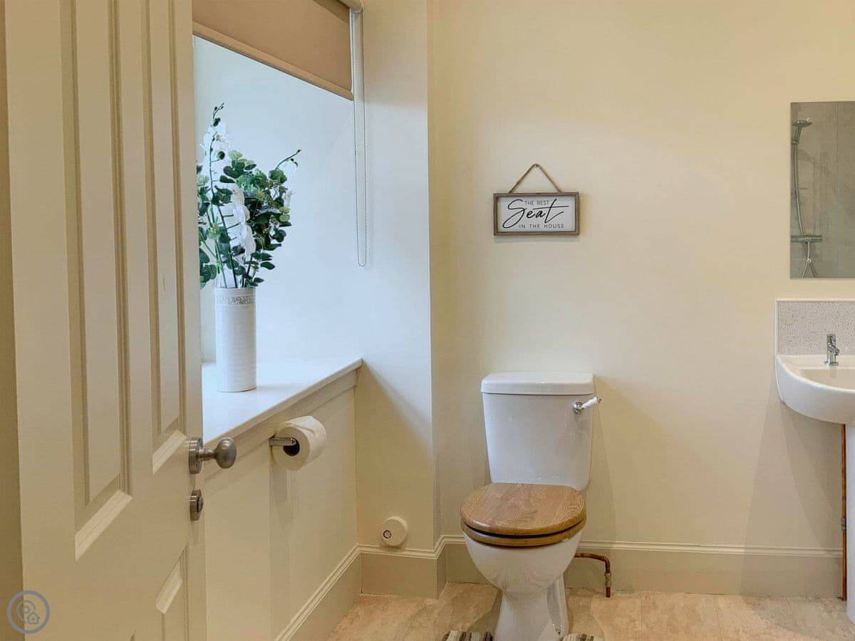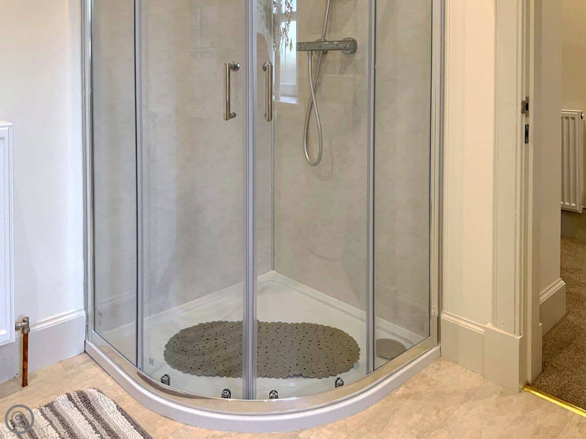 It sleeps seven. Four bedrooms, two bathrooms. One of the bedrooms is downstairs. That's a kingsize with its own shower room off the hallway. Upstairs, there are two more kingsize rooms and a single. The family bathroom is up there too. It's got a 5 Star rating, so it's comfortable and well looked after.