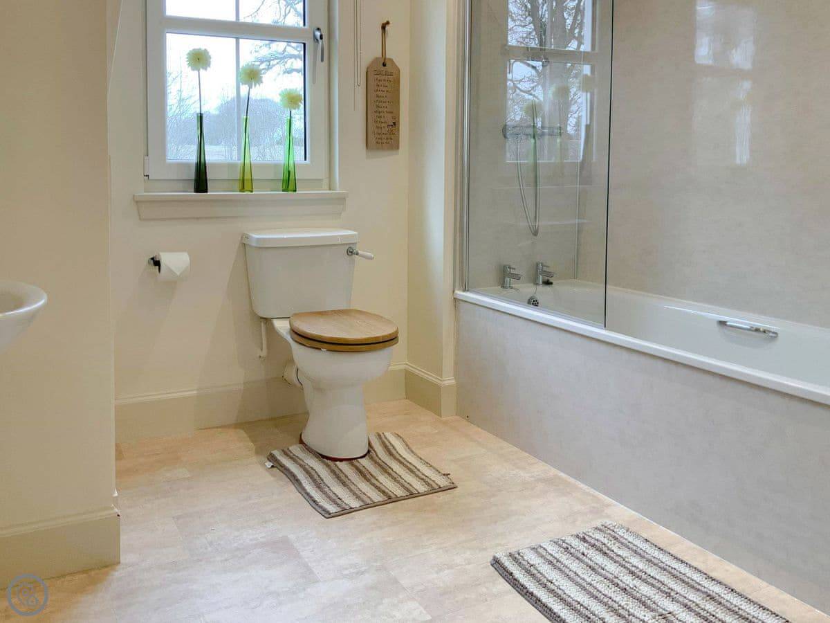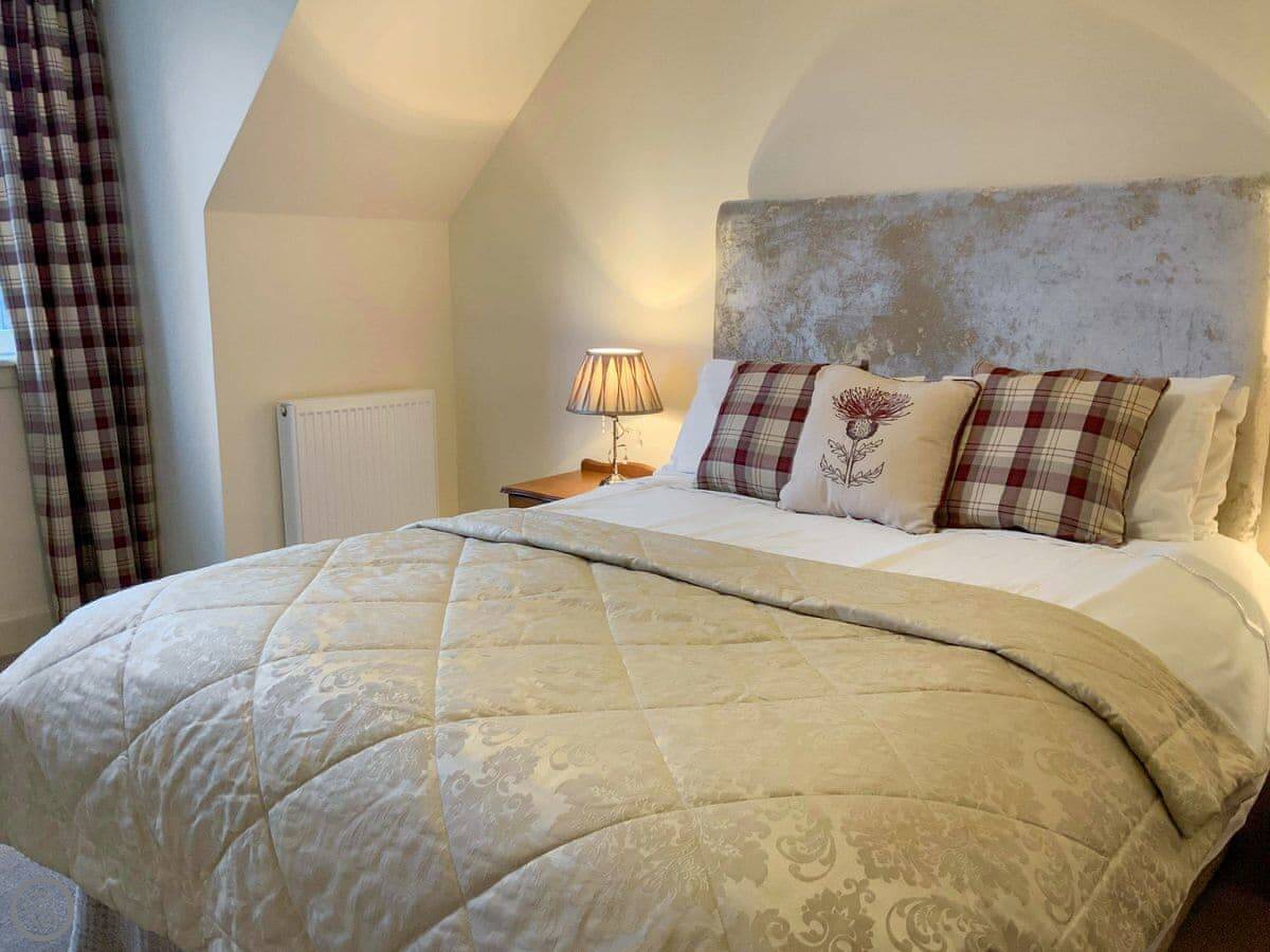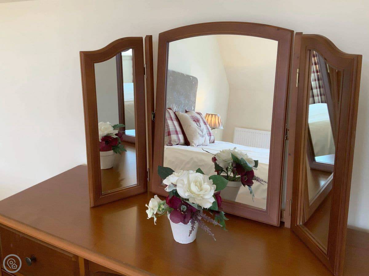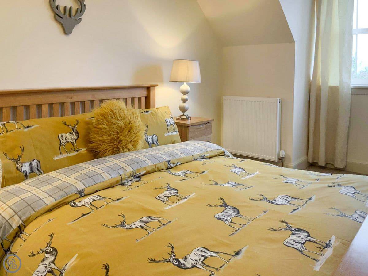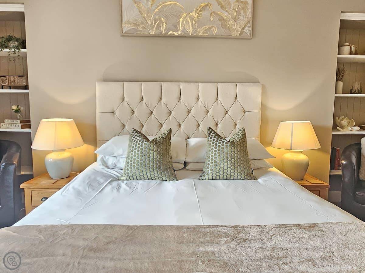 It sleeps seven. Four bedrooms, two bathrooms. One of the bedrooms is downstairs. That's a kingsize with its own shower room off the hallway. Upstairs, there are two more kingsize rooms and a single. The family bathroom is up there too. It's got a 5 Star rating, so it's comfortable and well looked after.