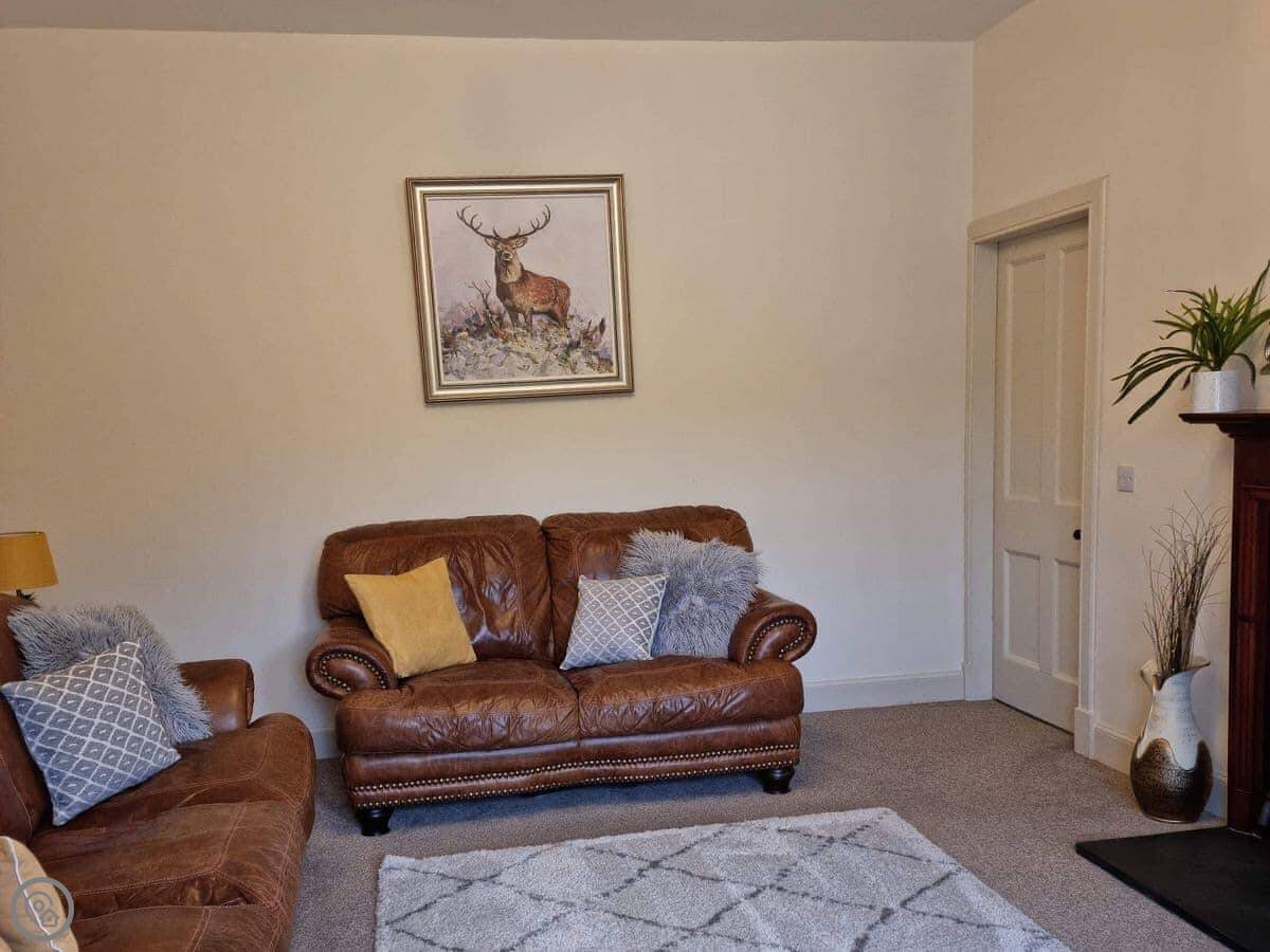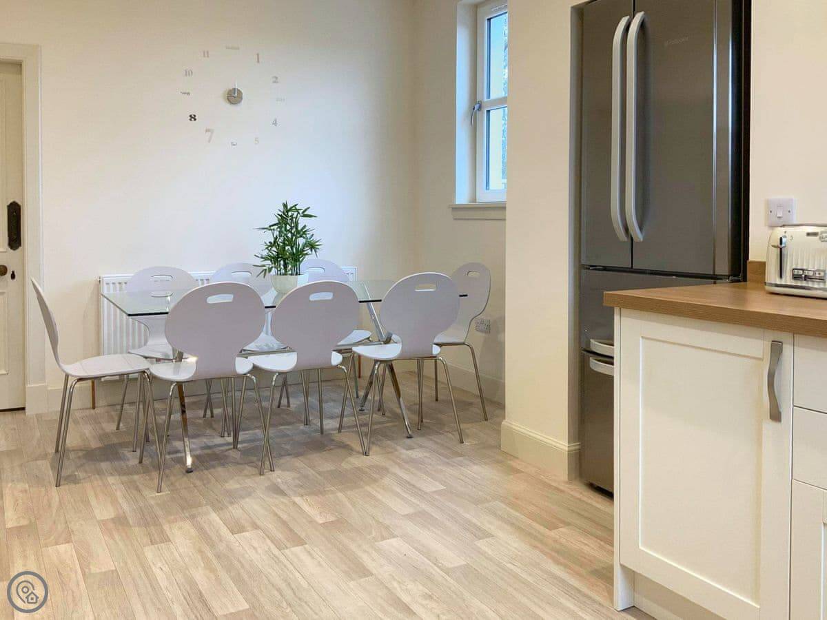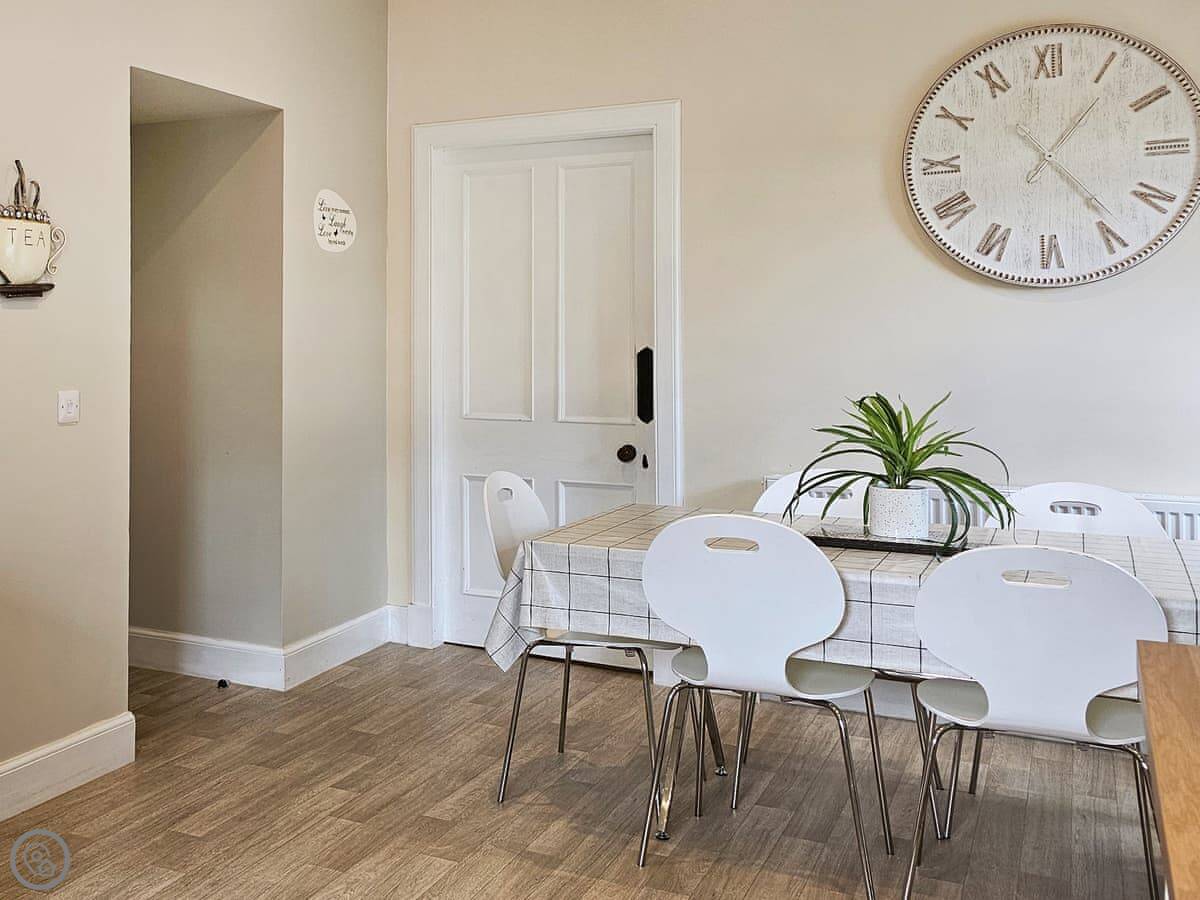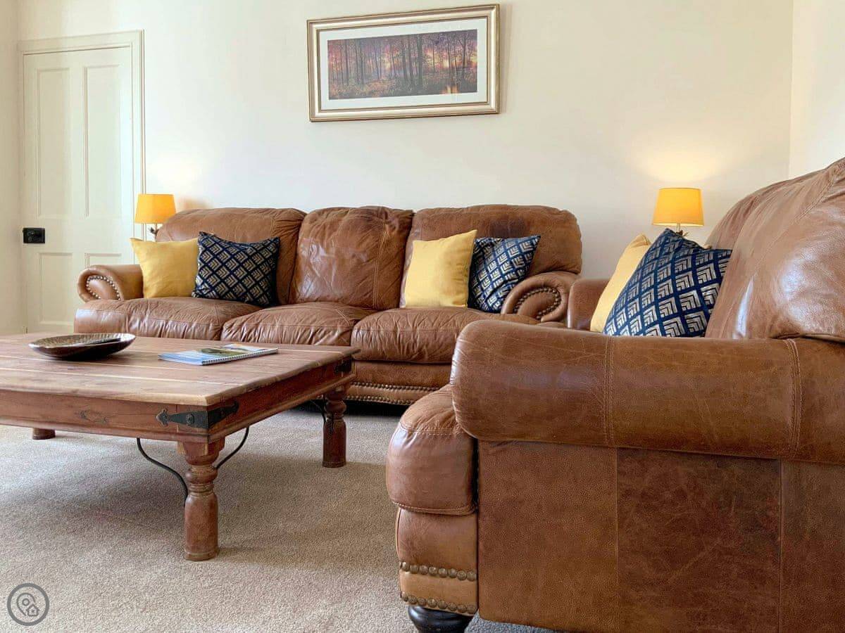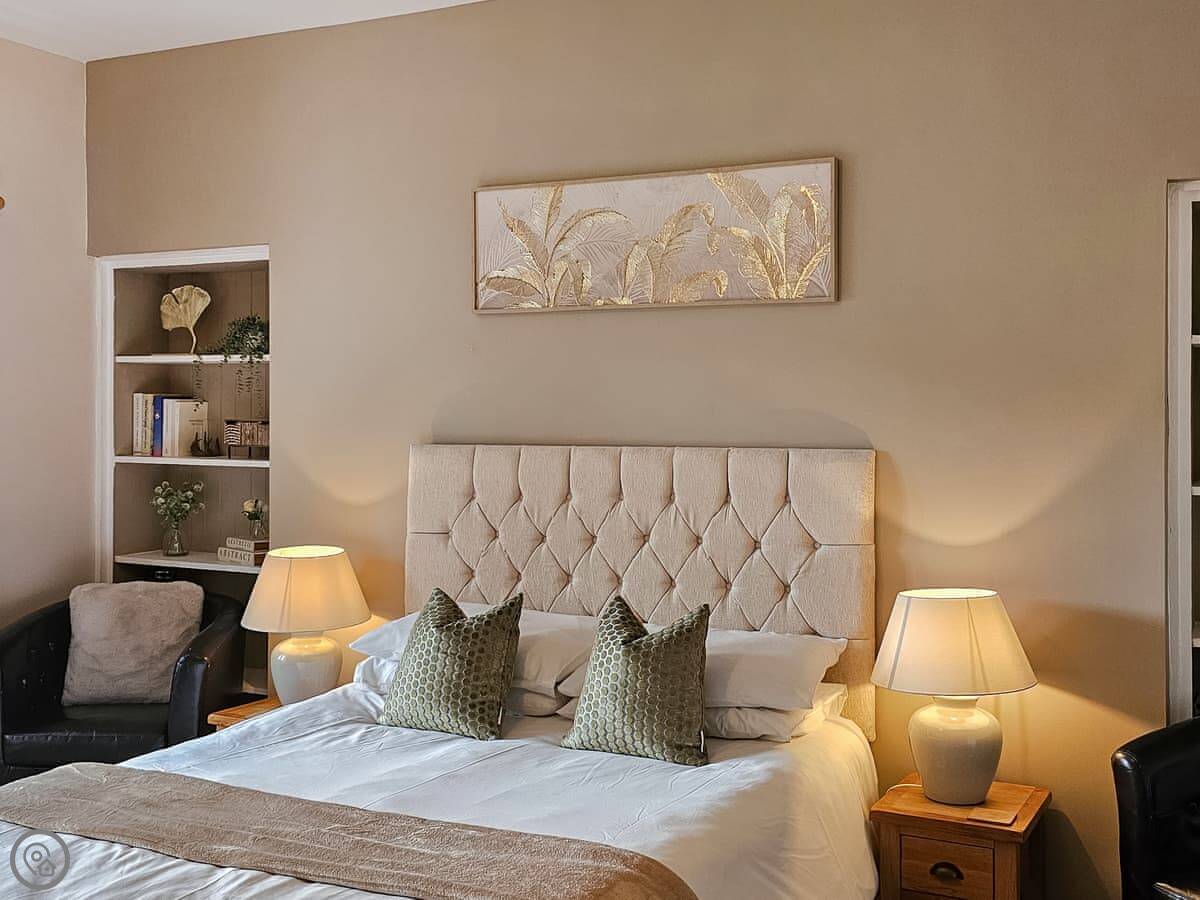 It sleeps seven. Four bedrooms, two bathrooms. One of the bedrooms is downstairs. That's a kingsize with its own shower room off the hallway. Upstairs, there are two more kingsize rooms and a single. The family bathroom is up there too. It's got a 5 Star rating, so it's comfortable and well looked after.
