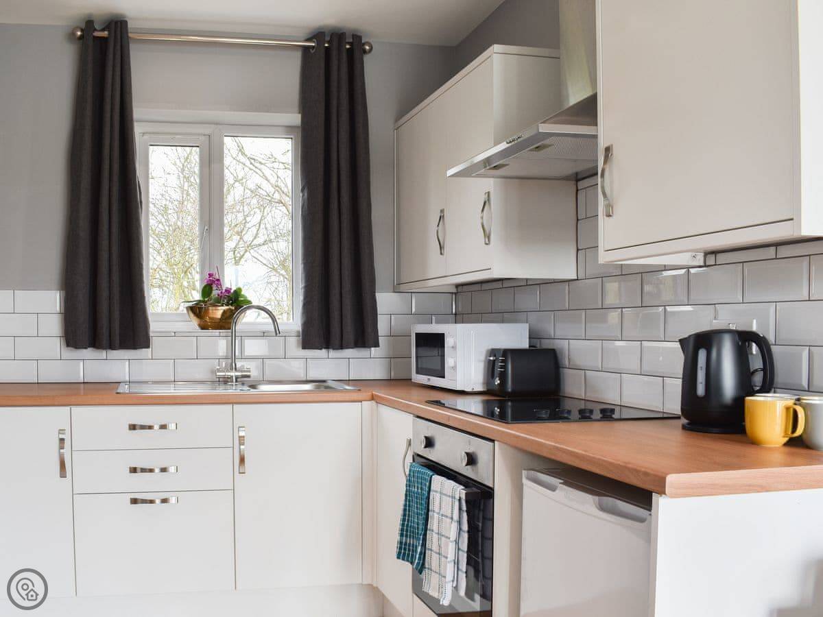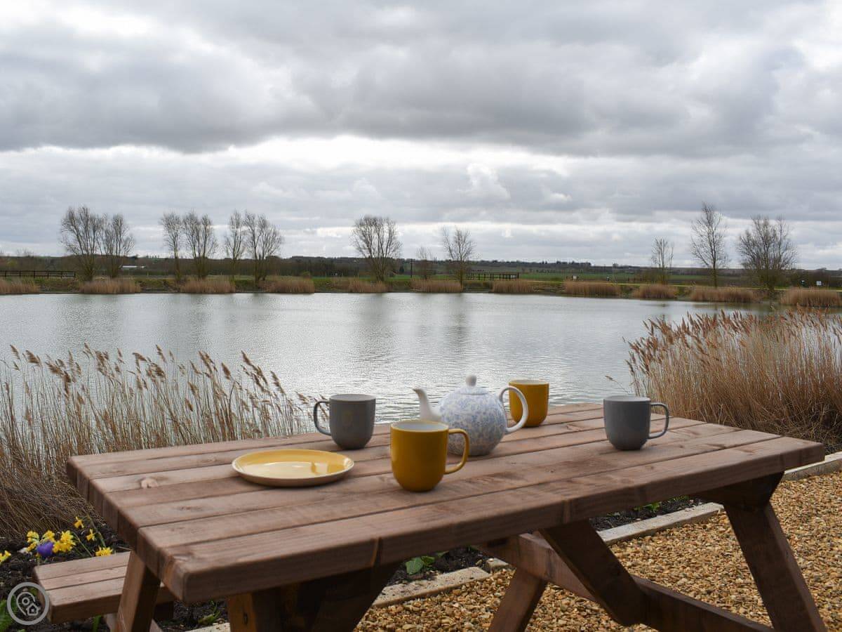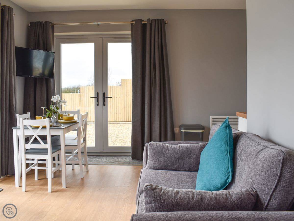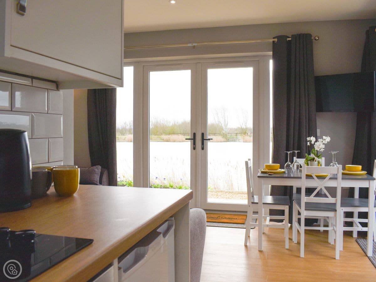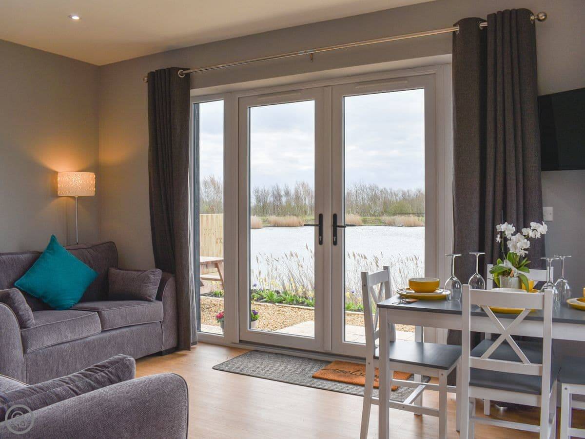 You get two bedrooms and a shower room. It sleeps four. The main room is open plan with a kitchen, dining area, and living space. French doors open onto your own patio, which looks right over the lake. The view is nice, especially in the morning.