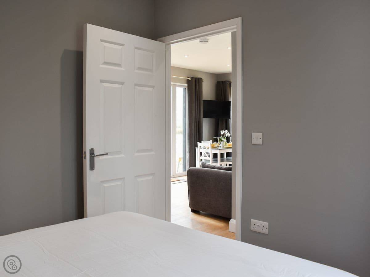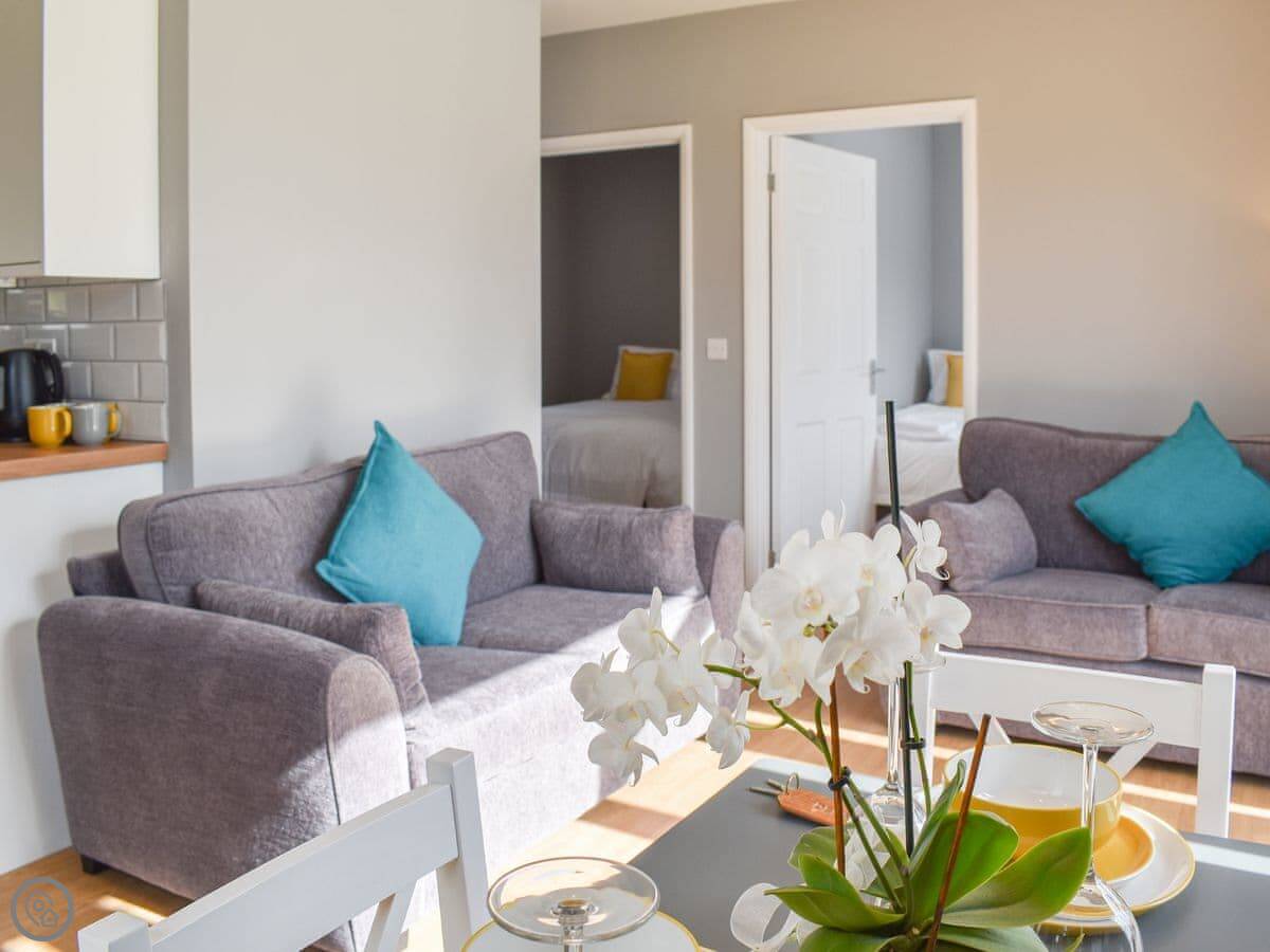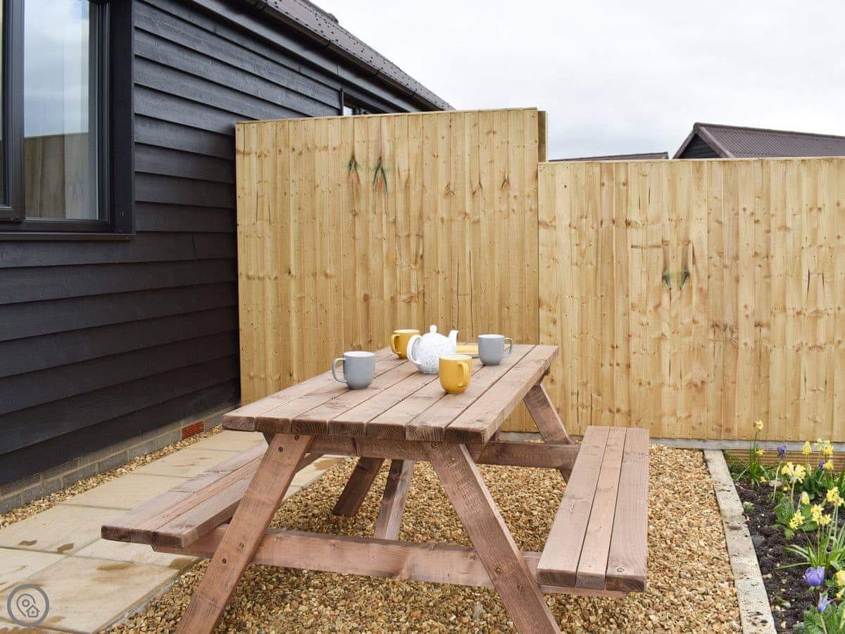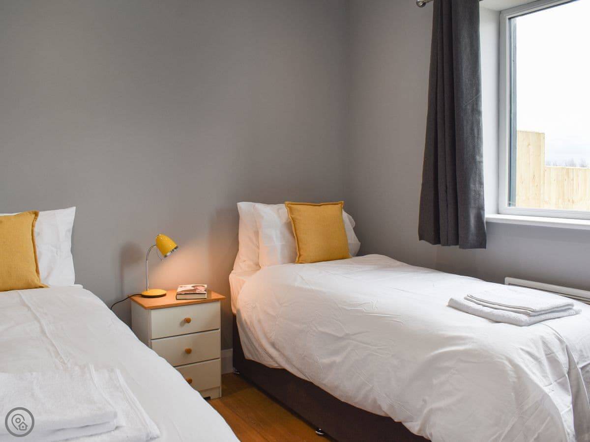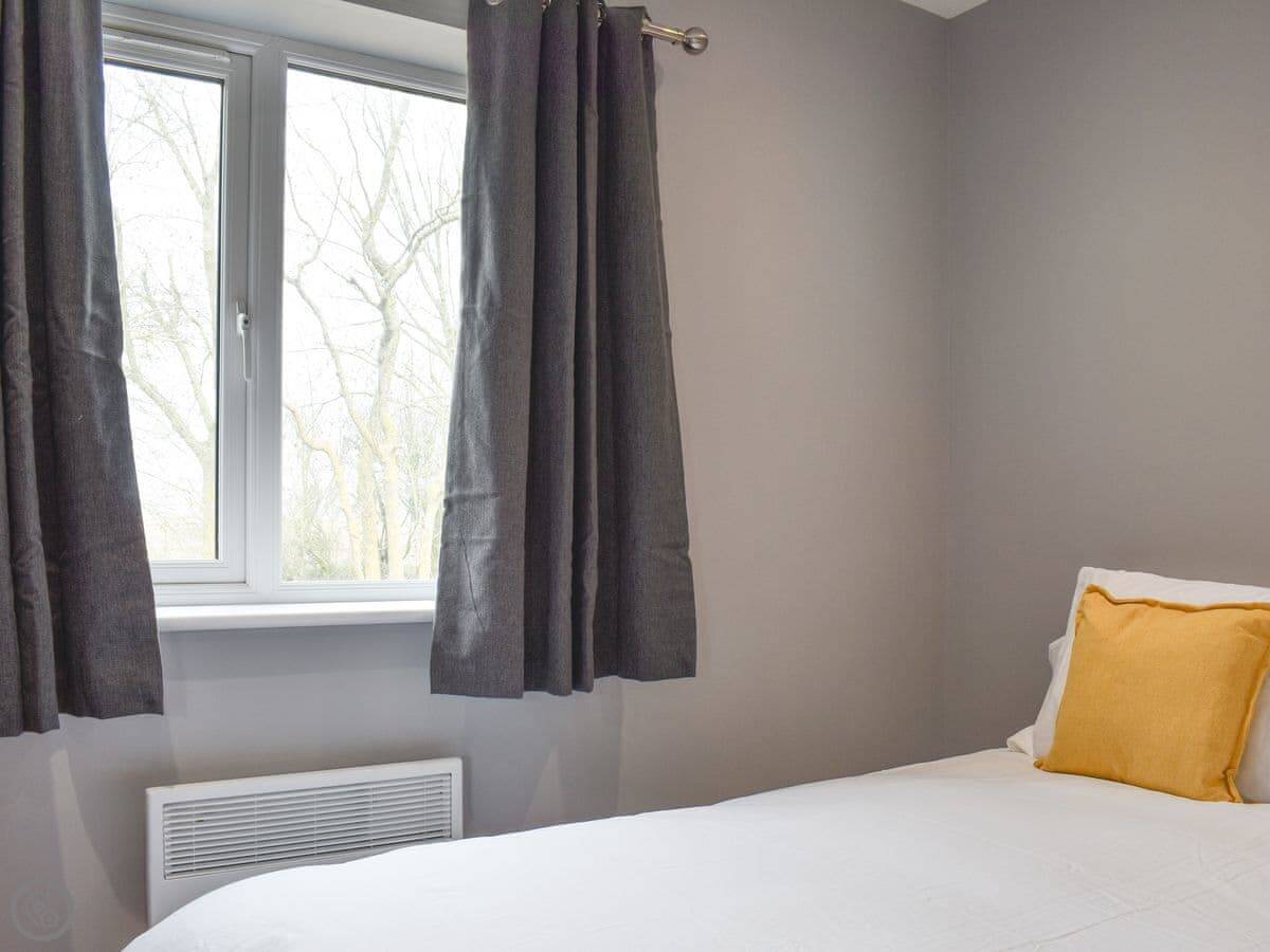 You get two bedrooms and a shower room. It sleeps four. The main room is open plan with a kitchen, dining area, and living space. French doors open onto your own patio, which looks right over the lake. The view is nice, especially in the morning.