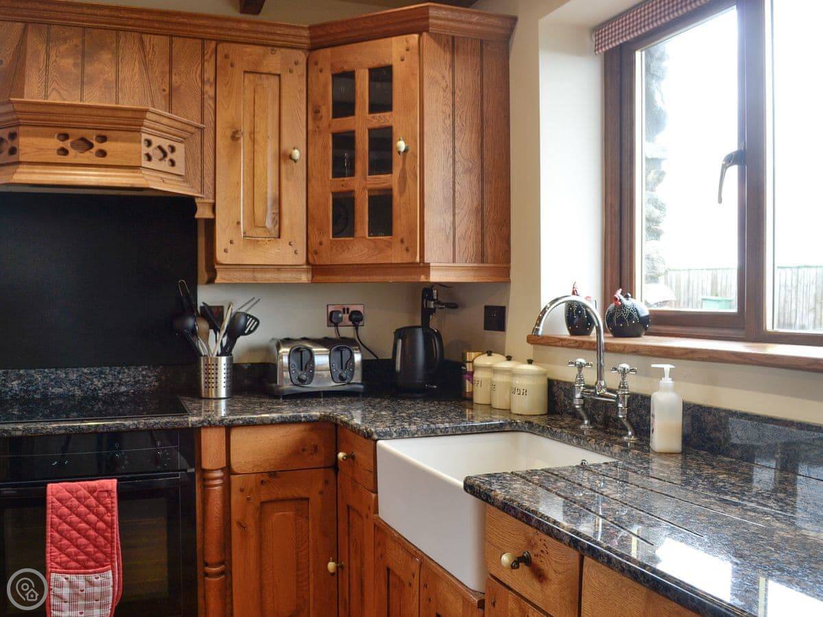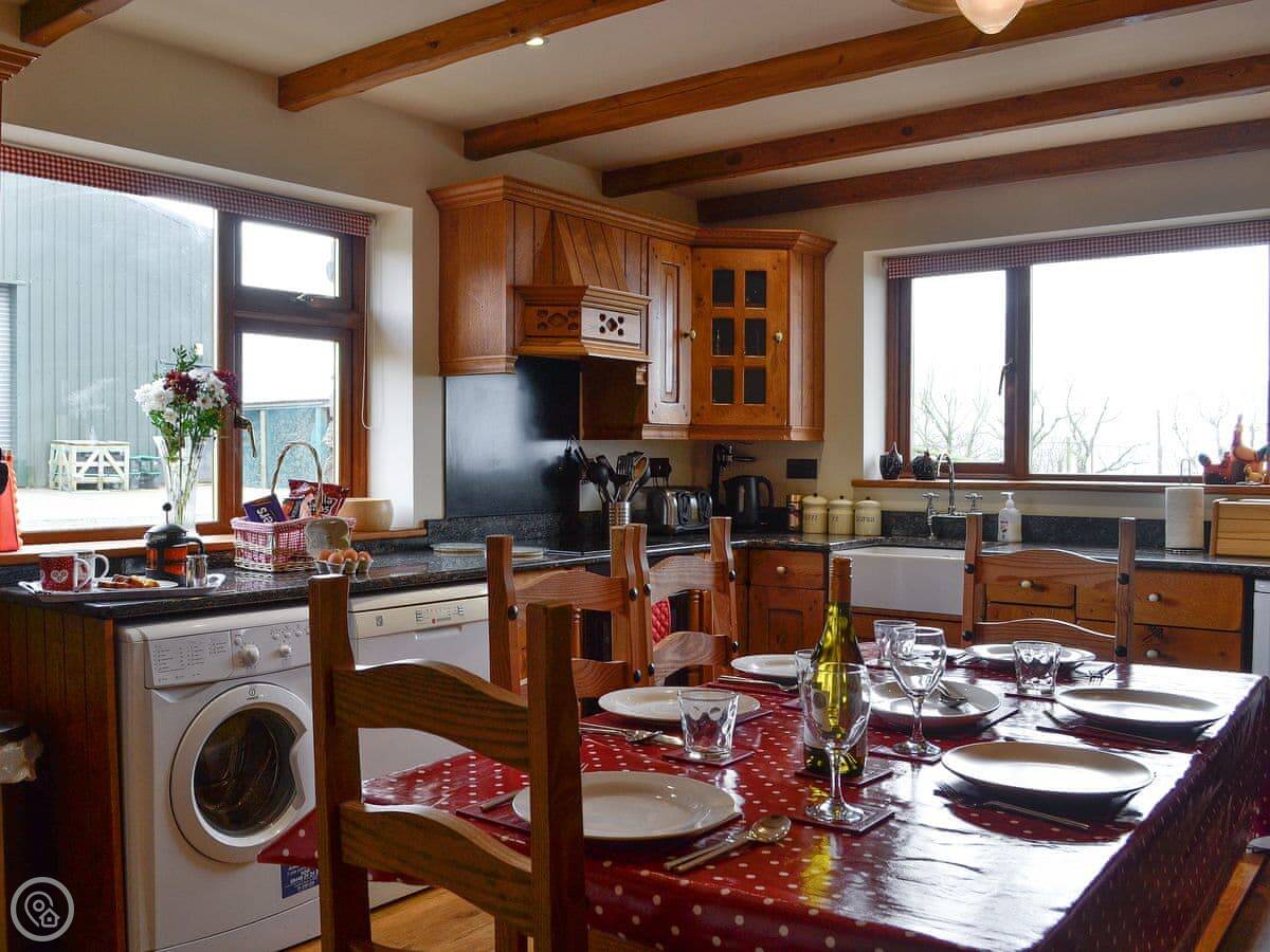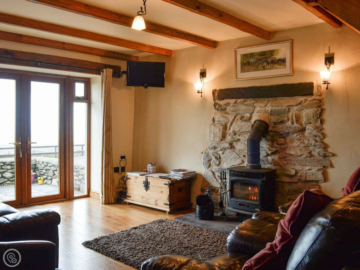 Inside, there's a wood burner in the living room. The patio doors open onto the view. The kitchen has a dishwasher and a washing machine. Bedding and towels are included. There's a cot and a highchair if you need them.